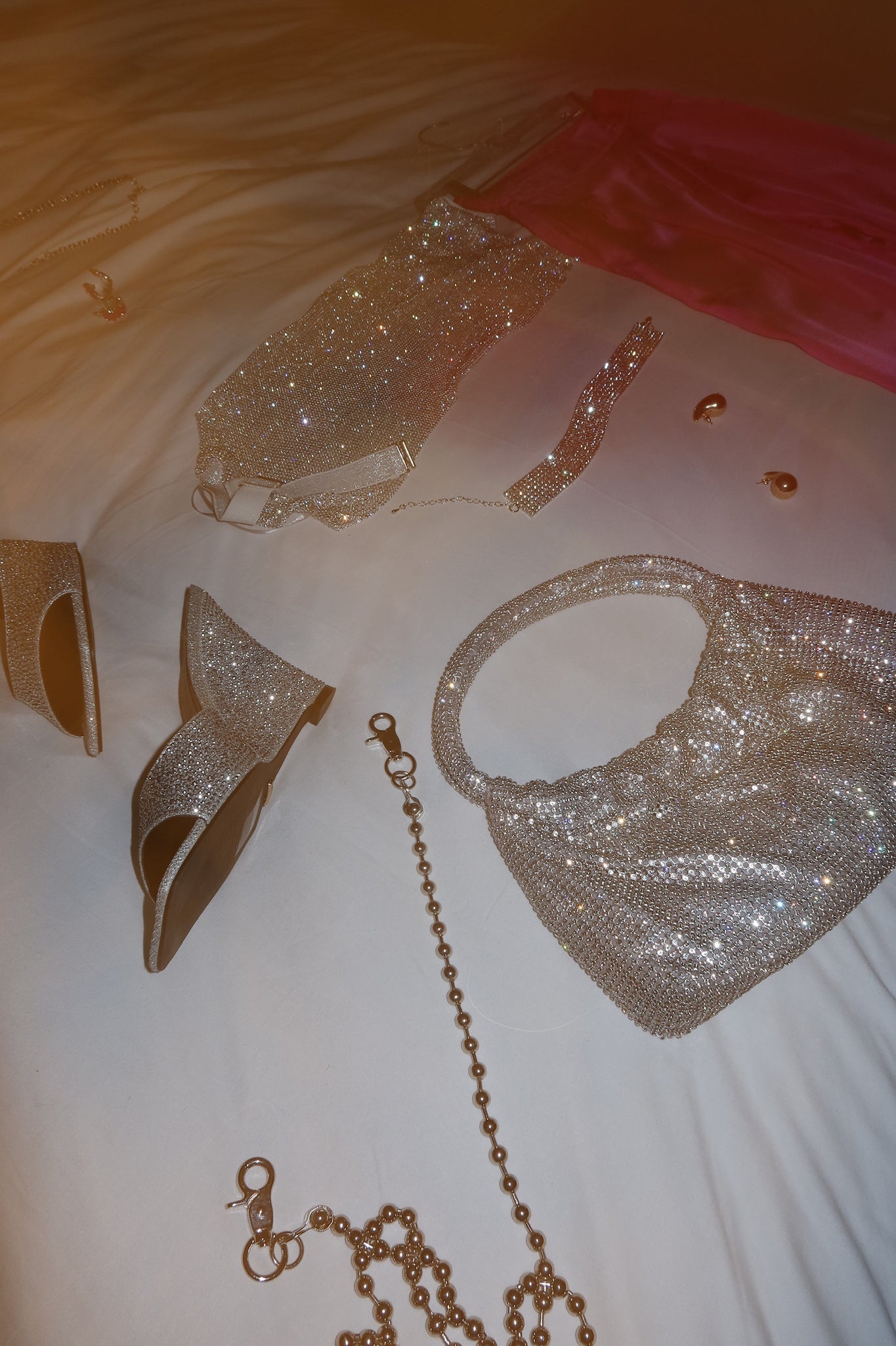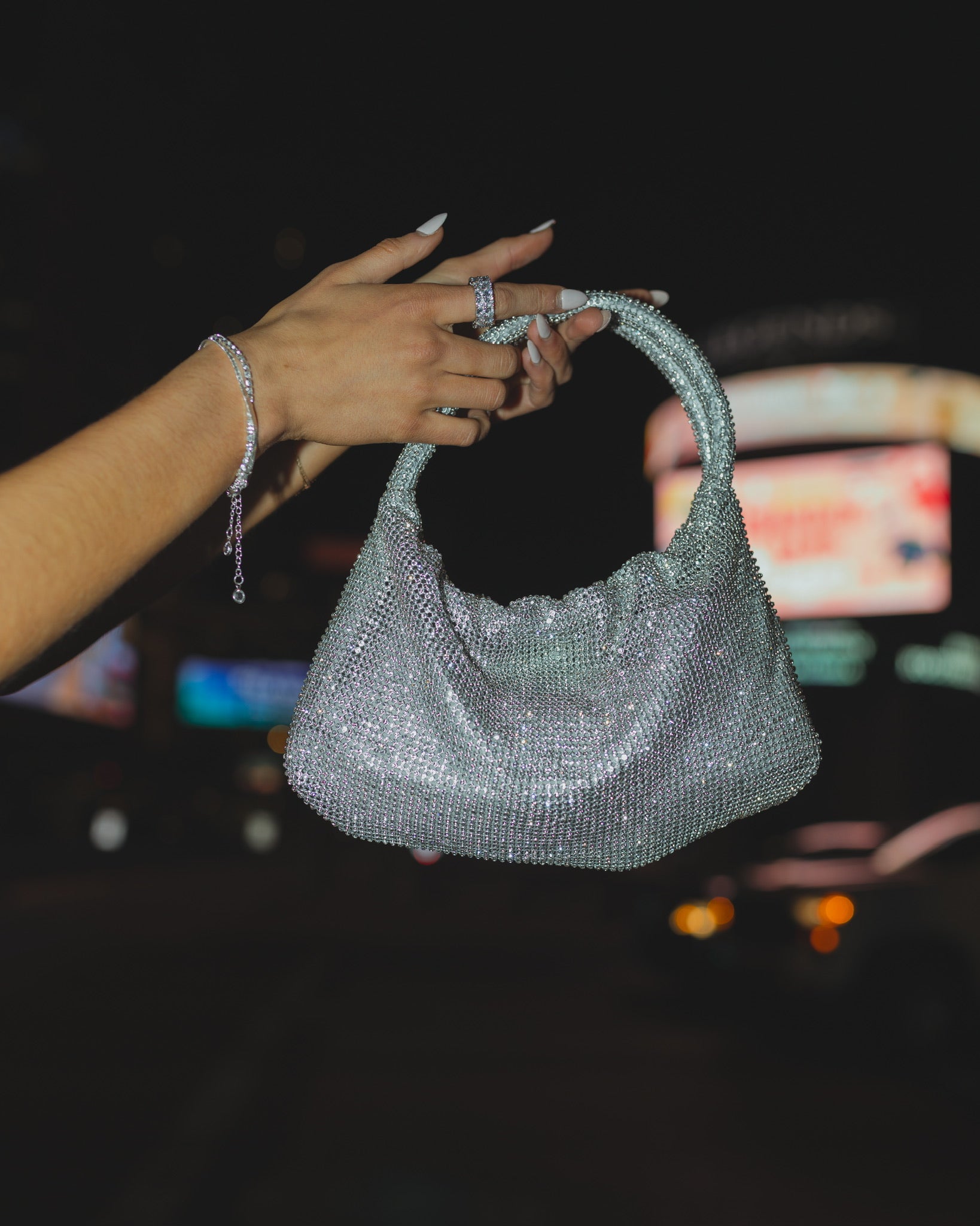 The Kerr Handle Bag by BILLINI features a rounded handle, a top zipper closure, and a silver diamante encrusted design.