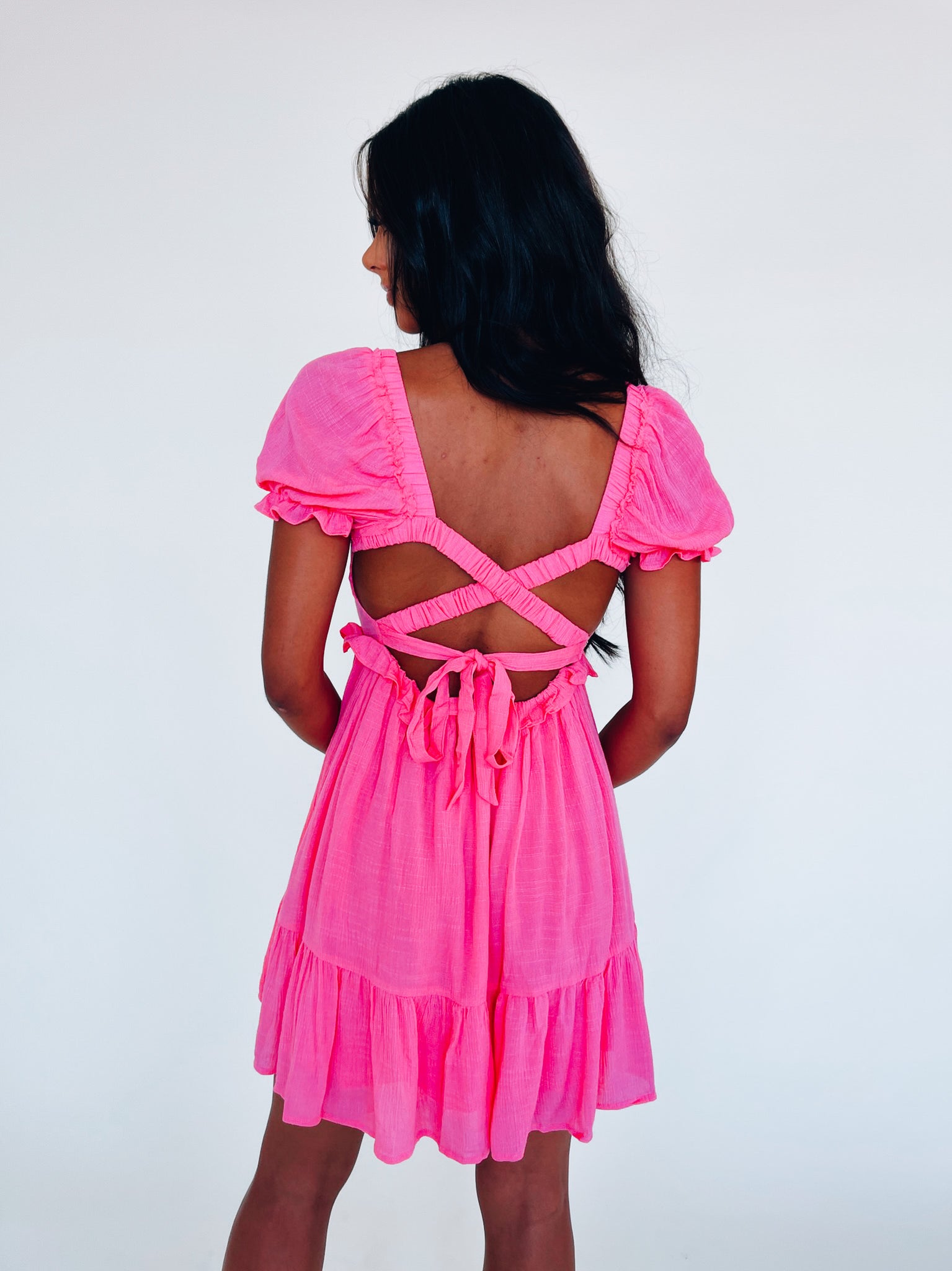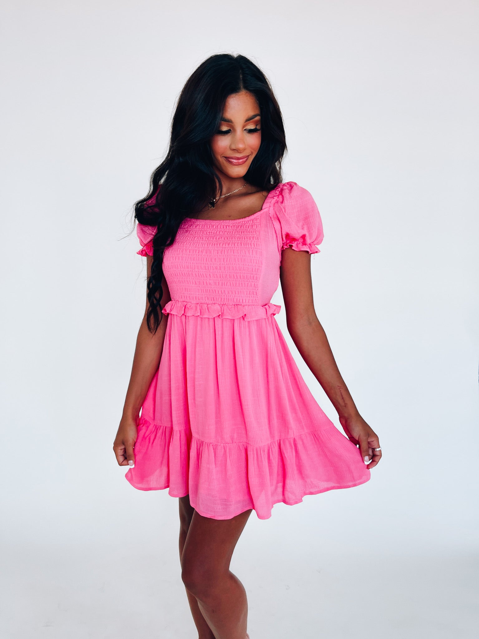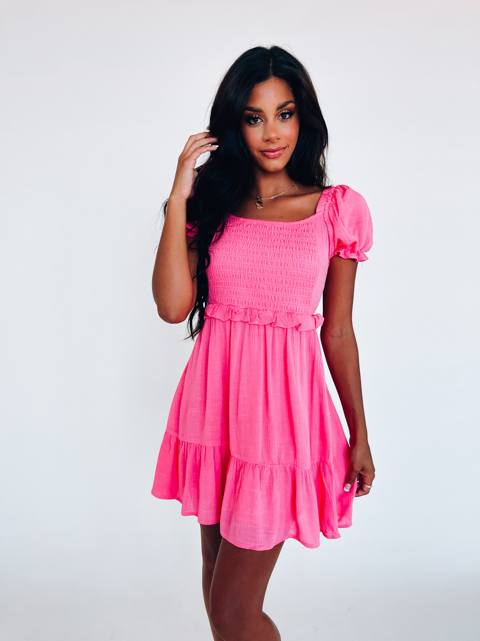 Our Reilynn Sundress is a fit and flare sundress with a smocked bodice, puff sleeve detail with ruffle hemline, and fitted waistline. This dress features an openback with stretchy elastic criss cross detail with bow detail. The skirt of this dress is fully lined and features a ruffle hemline. This dress is made of a lightweight linen material.