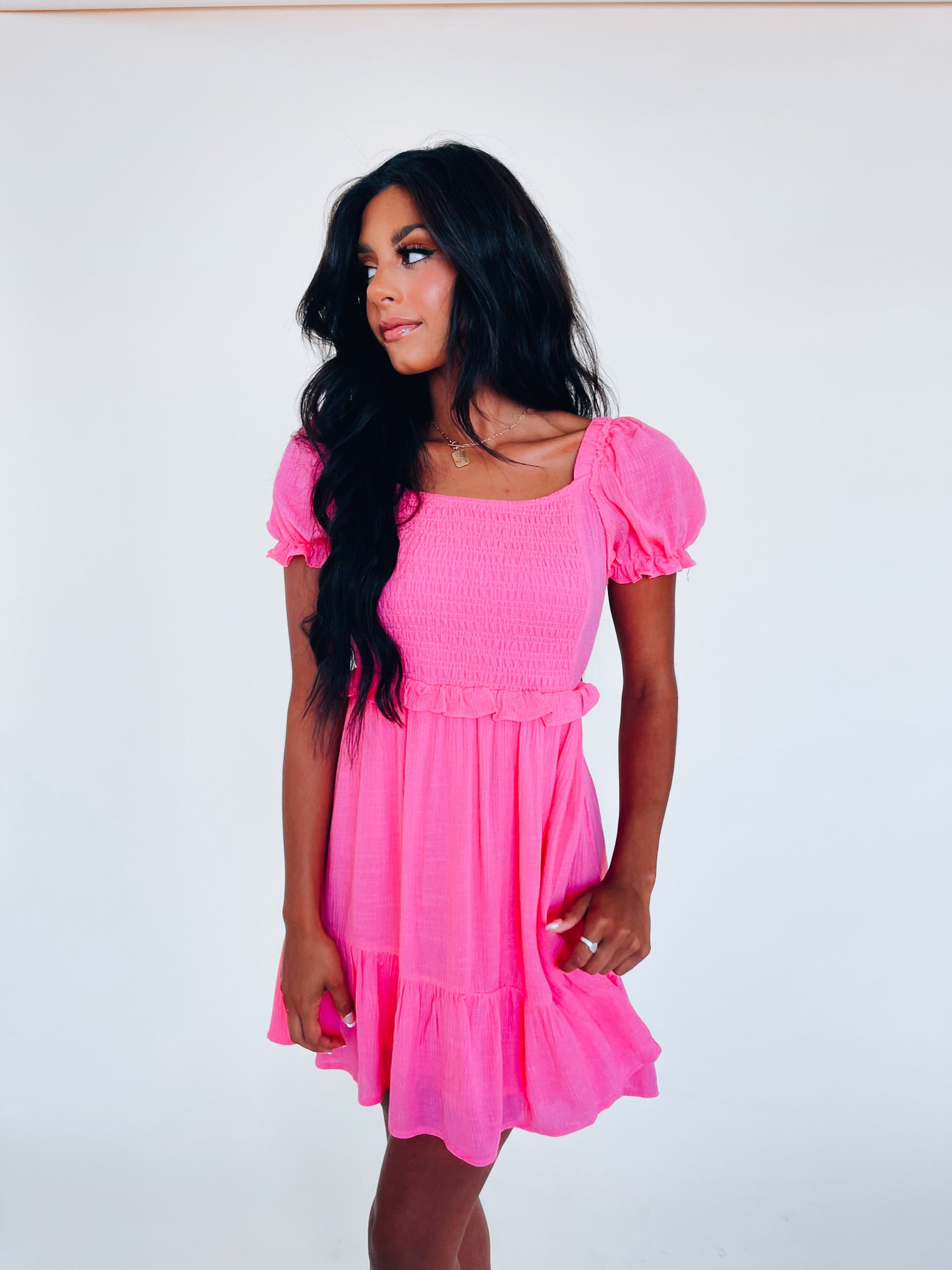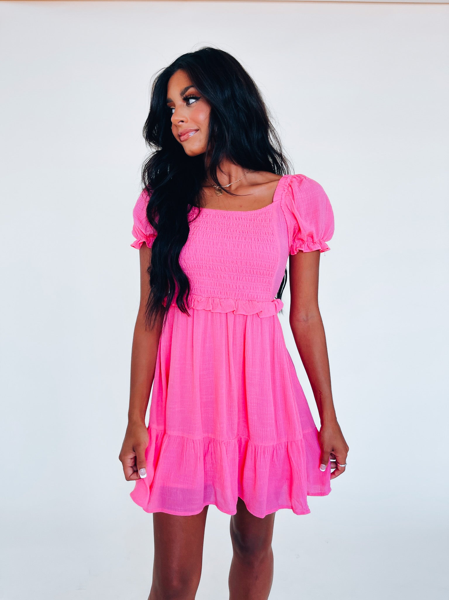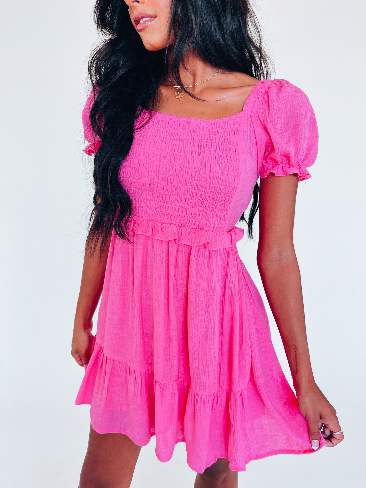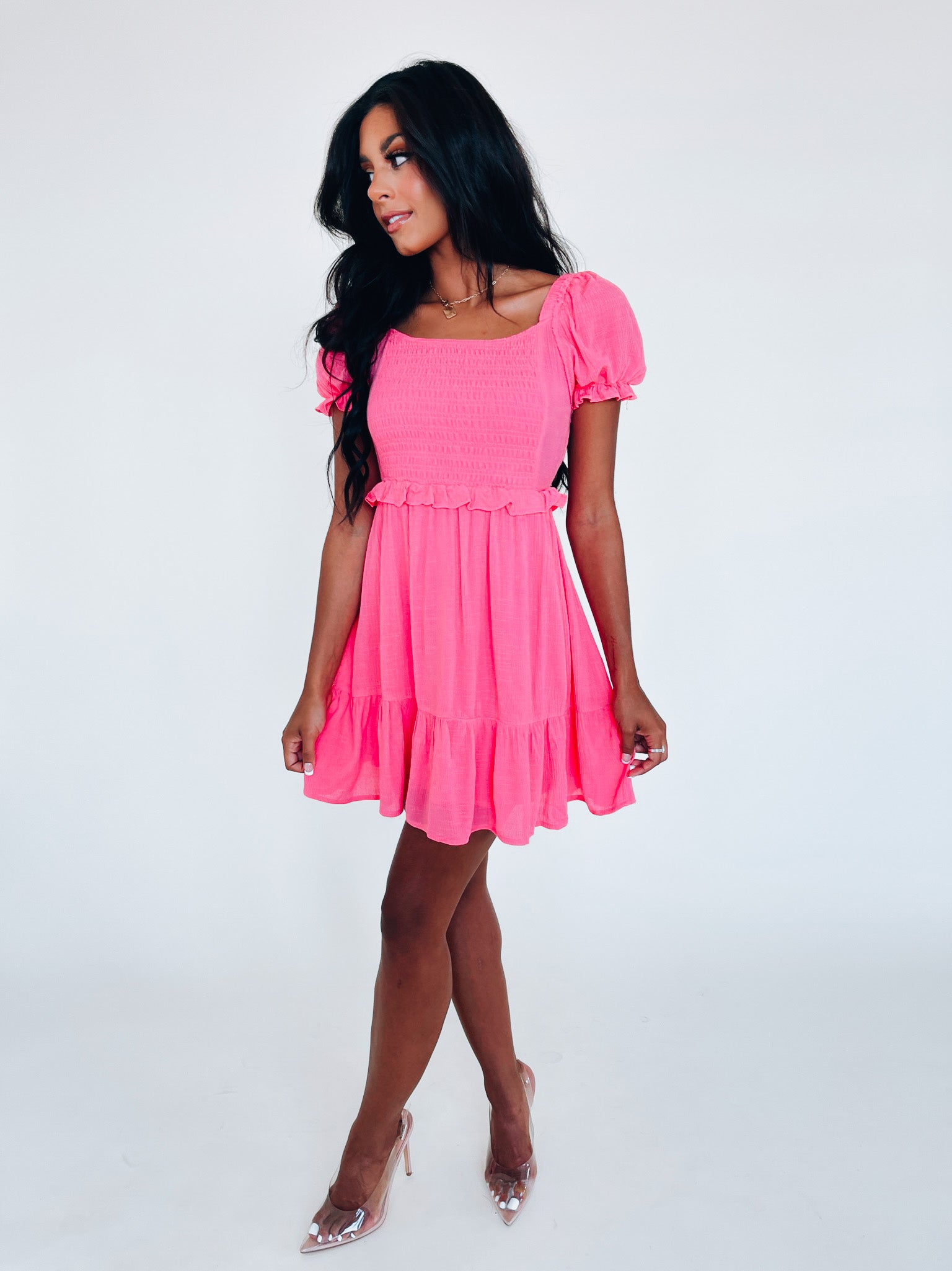 Our Reilynn Sundress is a fit and flare sundress with a smocked bodice, puff sleeve detail with ruffle hemline, and fitted waistline. This dress features an openback with stretchy elastic criss cross detail with bow detail. The skirt of this dress is fully lined and features a ruffle hemline. This dress is made of a lightweight linen material.