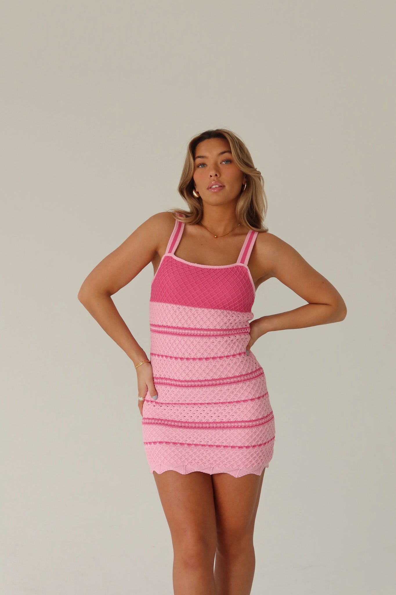 Our April Crochet Mini Dress is a captivating addition to your wardrobe. This delightful dress showcases a charming multi-pink crochet design, perfect for adding a touch of elegance to your look. Boasting a square neckline with thick straps for added comfort, it features a subtle criss-cross crochet pattern throughout, adding depth and texture. The bust is adorned with a solid pink hue, while the bodice and skirt flaunt a delightful pink and light pink stripe pattern, creating a visually appealing contrast. To elevate its allure, the hemline boasts a scalloped detail, adding a feminine touch to the ensemble. Designed to fit true to size with a comfortable stretch, this dress ensures both style and comfort for any occasion. Prepare to make a statement in the April Crochet Mini Dress and embrace effortless sophistication with every wear.