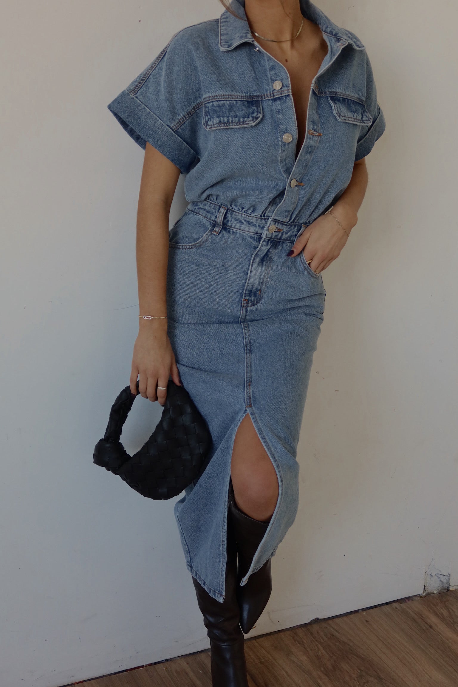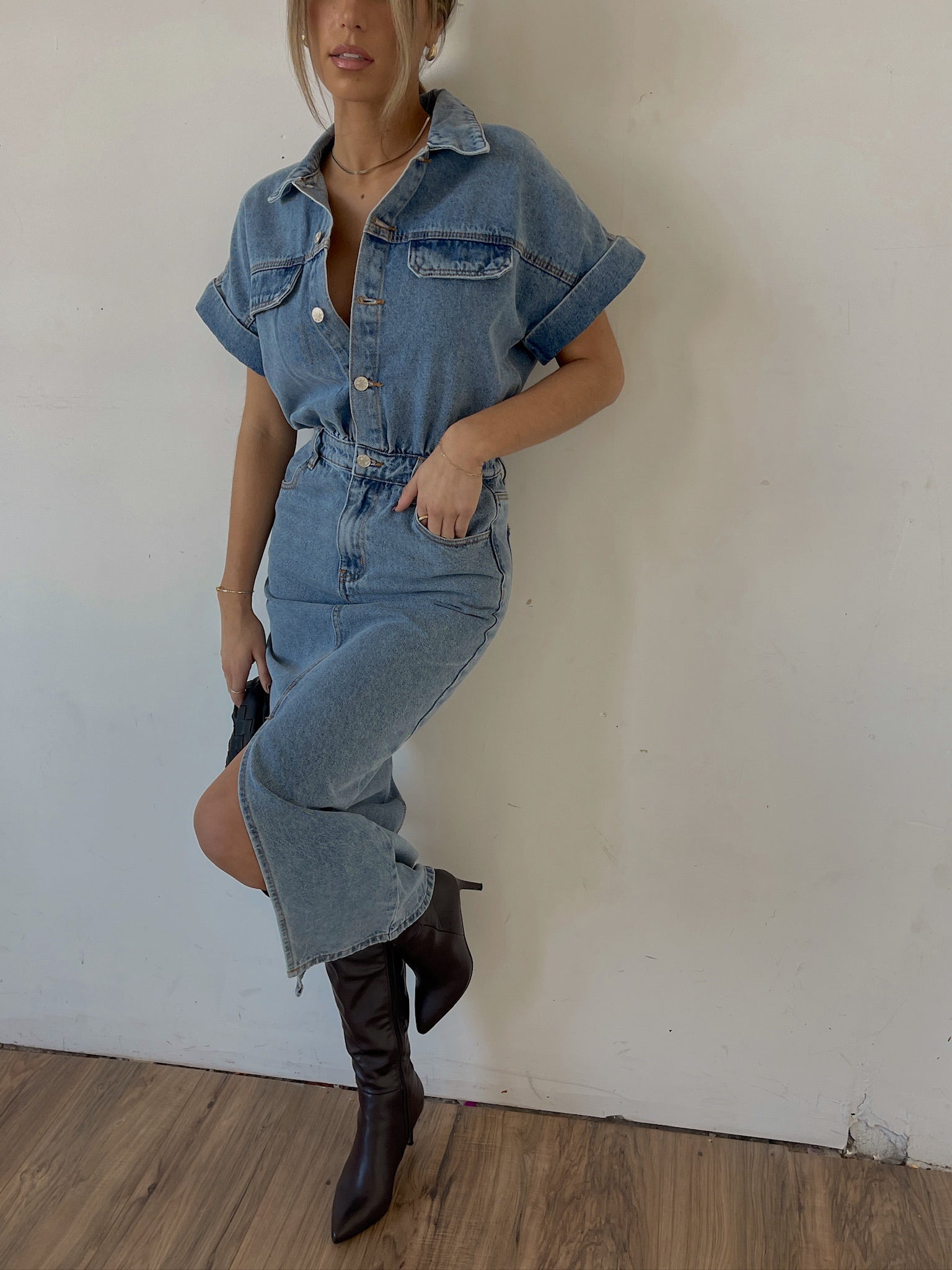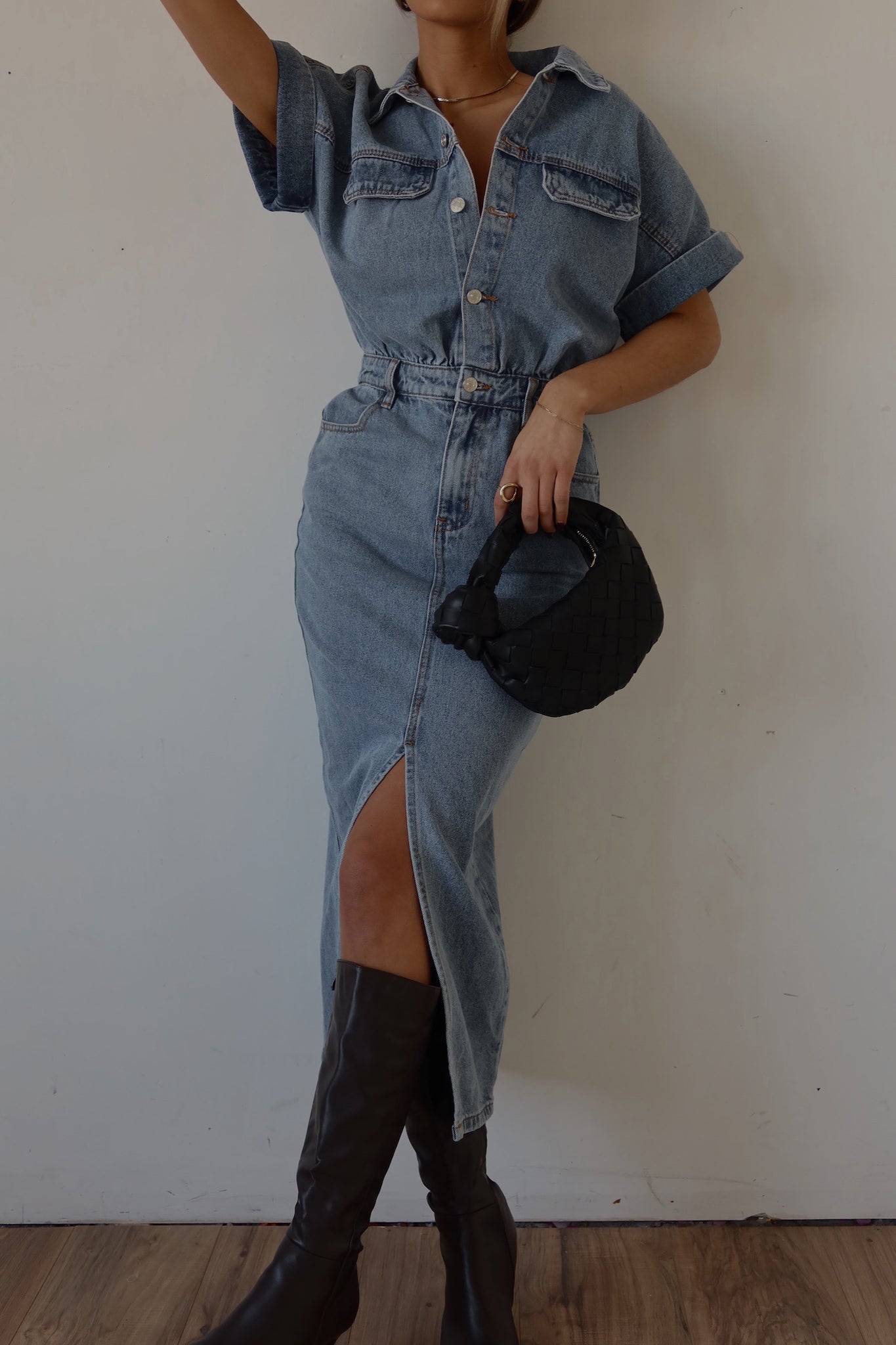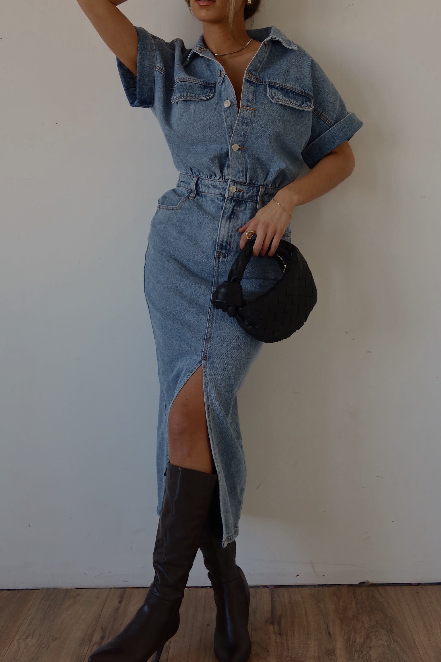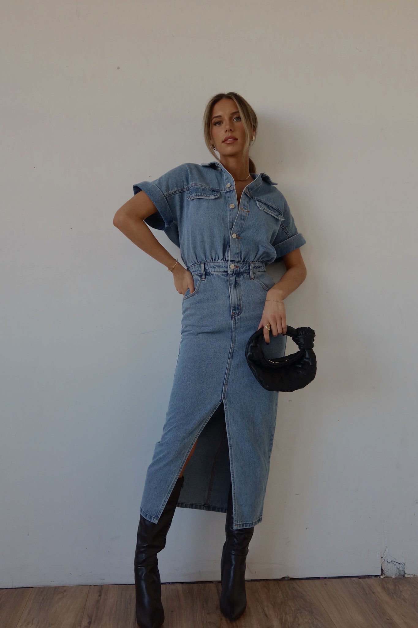 Our Tobie Short Sleeve Denim Midi Dress is fitted medium wash denim midi dress with the cutest fit. This denim dress features a collared v-neck neckline with a button down front. The waistband is elasitc with functional front and back pockets, belt loop details, and a button and zipper closure. The hemline of this dress is a midi length with a front slit for added shape. This dress is made of a lightwight and stretchy denim material that gives it a comfotable and figure flattering fit. This dress has stretch throughout and runs true to size.