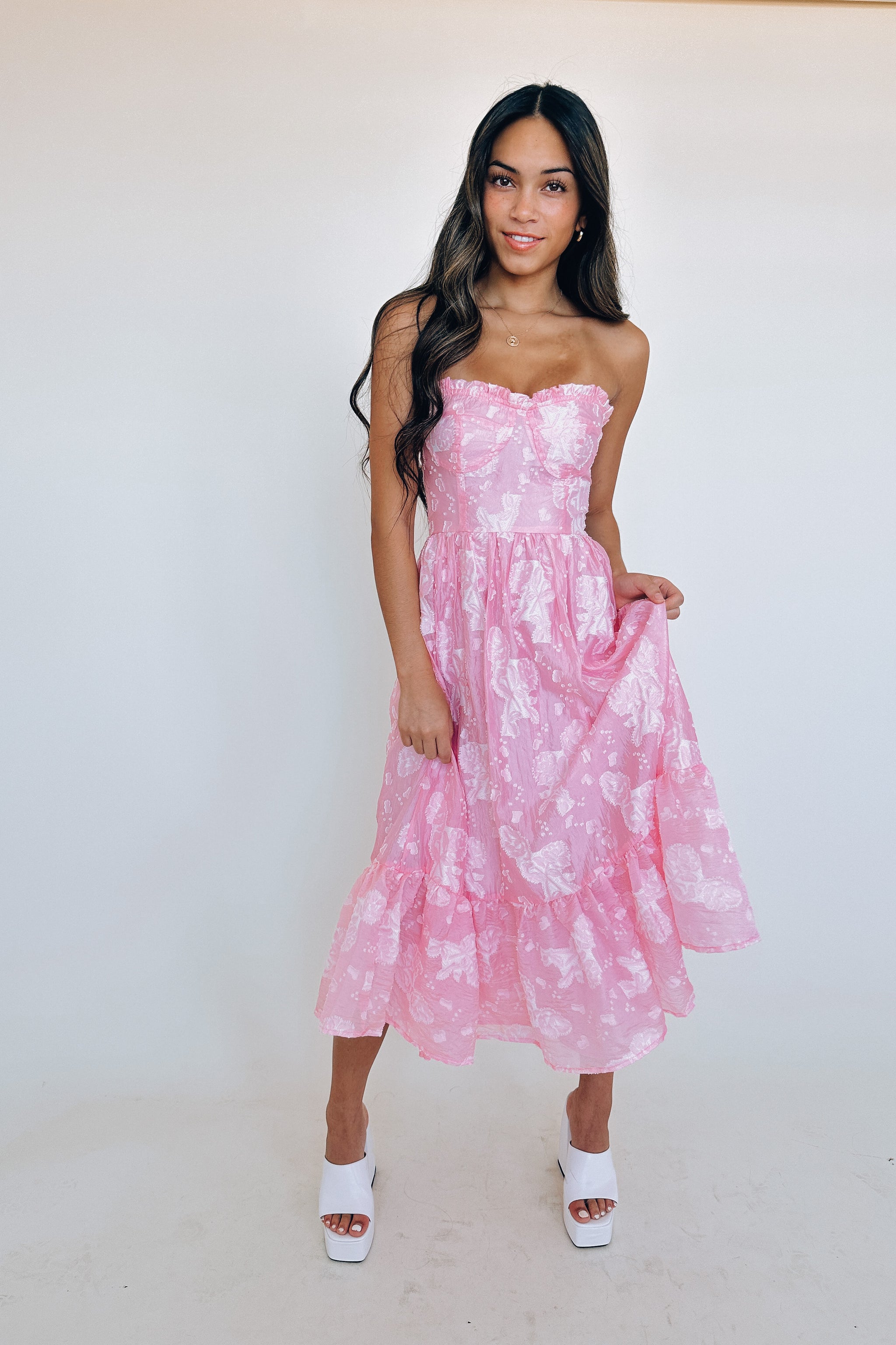 Our Scarlett Ruffle Midi Dress is a fit and flare midi dress with the most beautiful floral design throughout. This adorable midi dress has a unique silhouette featuring an emphasized bustline with a sweetheart neckline, fitted bodice, pronounced empire waistline and flared skirt with a ruffle hemline. The printed organza overlay provides a little extra drama while giving the dress more volume throughout the skirt. The dainty ruffle detail along the neckline is an additional detail that gives this dress a beautiful feminine look. This dress is completed with removeable straps, smocked detail in the back of the bodice, and hidden zipper closure with a hook and eye clasp. This dress is fully lined and is true to size.