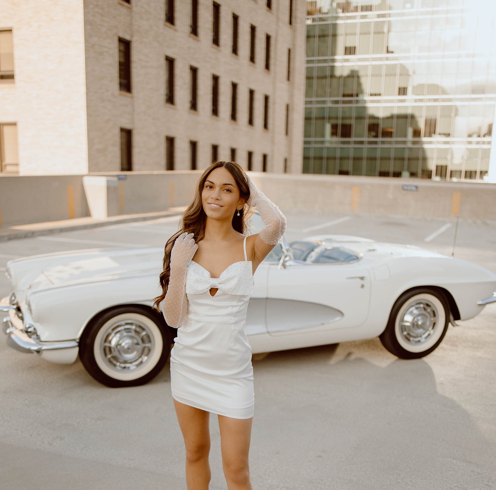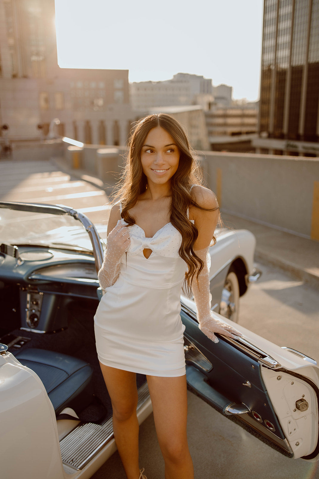 Our Rae Rhinestone Bow Mini Dress is a satin mini dress with an oversized bow embellishment. This statement mini dress features adjustable spaghetti straps, prounced waistline, and large rhinestone embellished bow across the bust. This dress is fully lined and is completed with a back zipper closure.