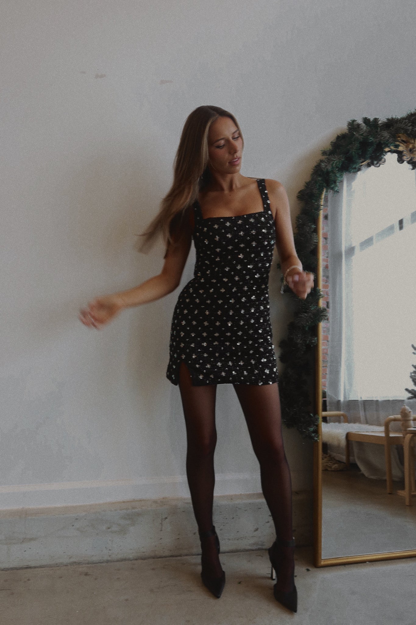 Our Kendyl Tweed Mini Dress has a tweed fabric that has some sparkle detail stitched into the fabric and sequin embellishments all throughout. This dress features a square neckline with fixed straps and a slim fitting silhouette. It is completed with a mini notch slit in the hemline and a hidden side zipper closure. The inside of this dress is fully lined and has little stretch, so we recommend sizing up if you are in between sizes.