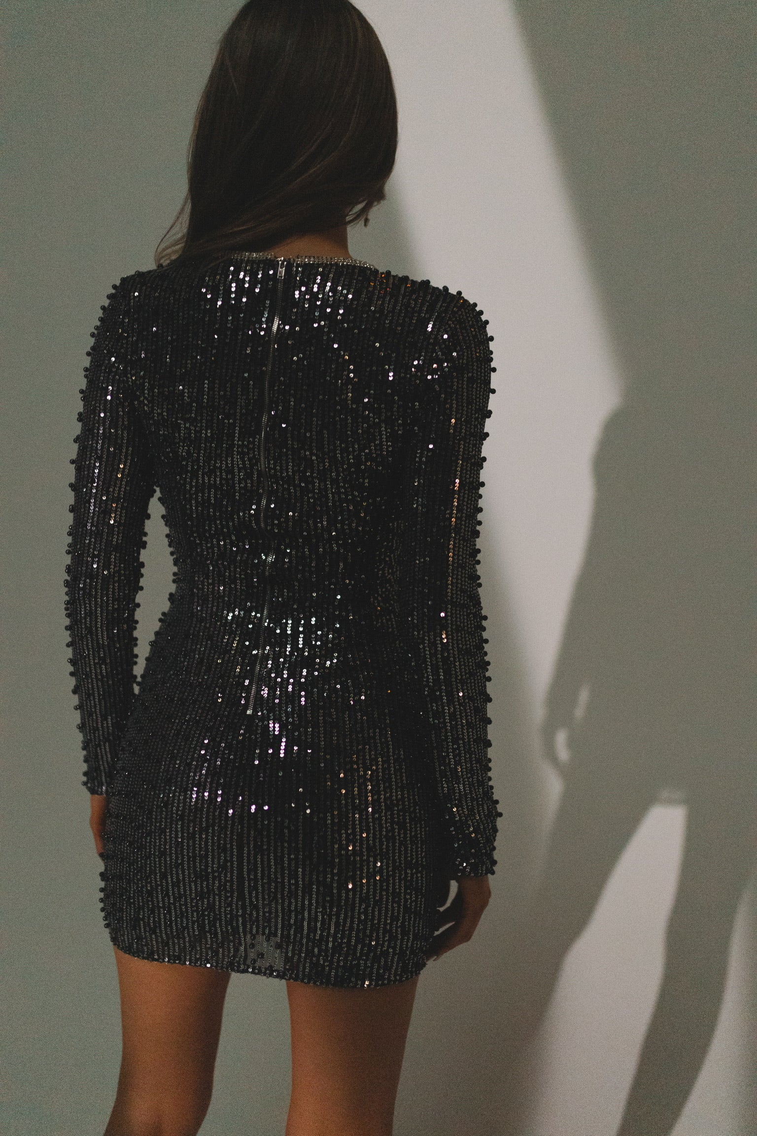 Our Show Stopper Black Sparkle Mini Dress is a long sleeved fitted mini dress that has a deep v-neck neckline. This dress has a sequin and pearl detail all over the fabric and the inside of this dress IS LINED with a soft to the touch fabric. The back of the dress is completed with a back zipper closure with a hook and eye clasp. This is the perfect Holiday dress for a night on the town!