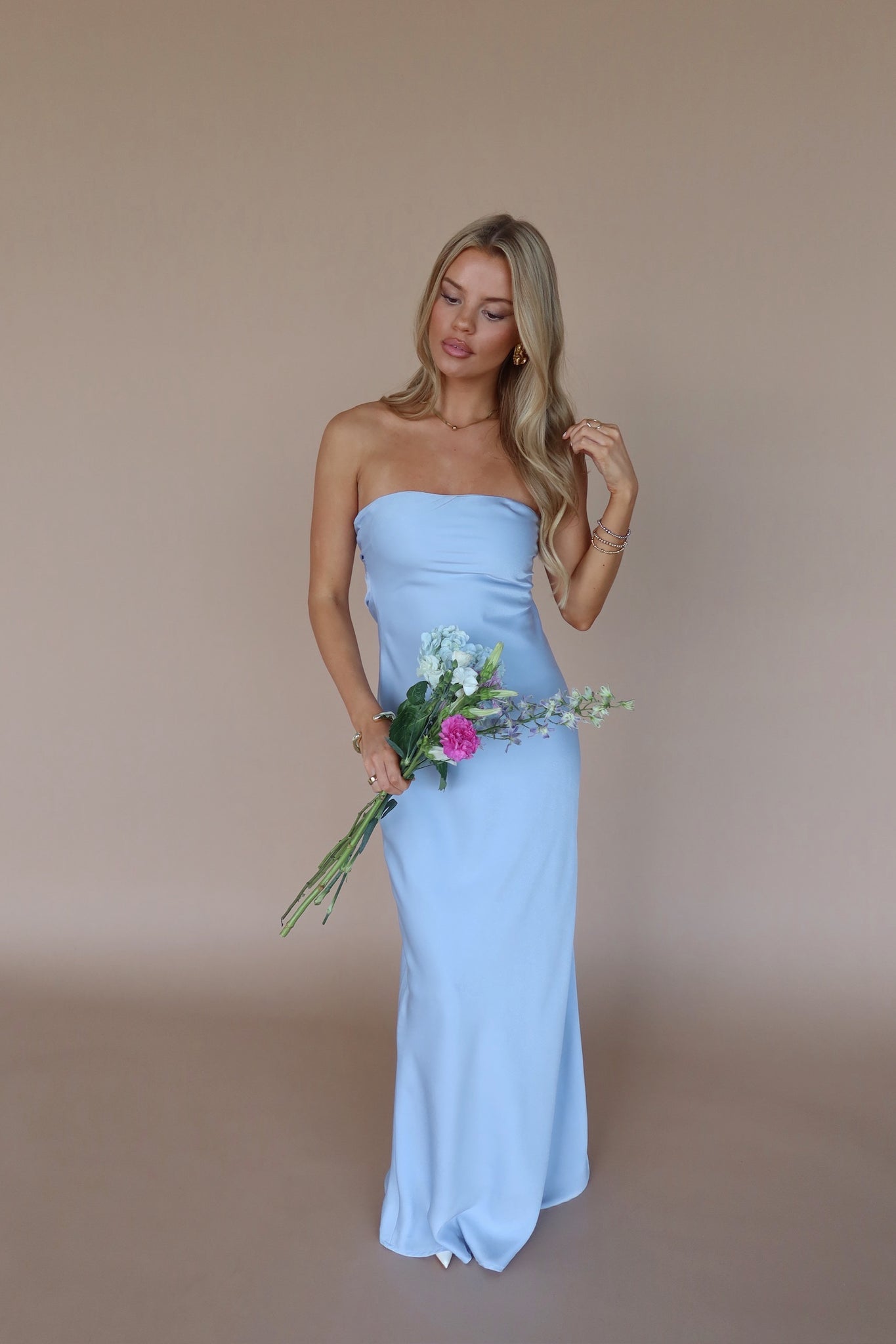 Carter Satin Strapless Maxi Dress In Dusty Blue