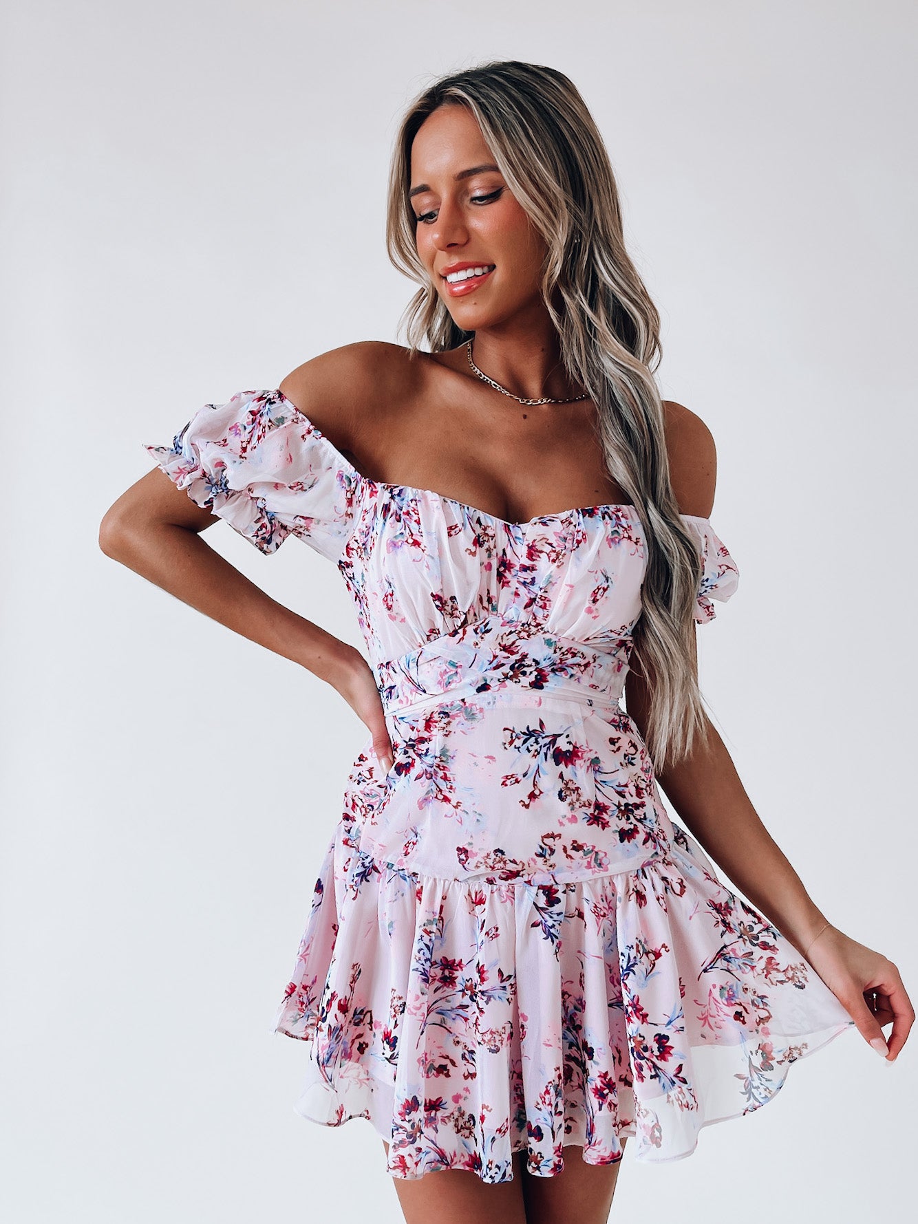 Our Alara Floral Off The Shoulder Dress has off the shoulder puff short sleeves with a ruffle detail. There is a cross over detail on the front under the bust that turns in to a self tie bow on the back. There is a back zipper closure with a hook and eye clasp. The bottom of this dress also has a ruffle detail. The inside of this item is LINED.