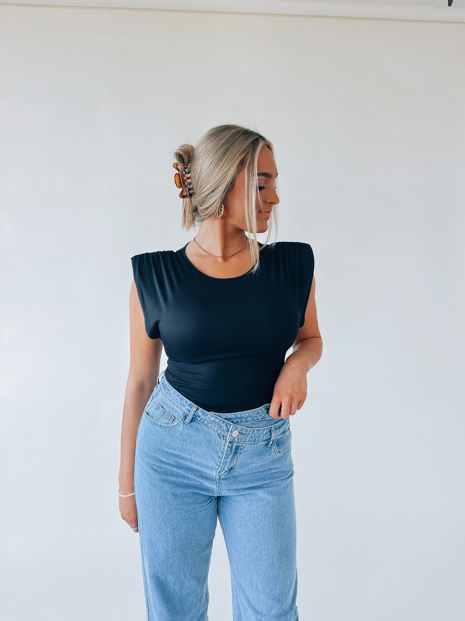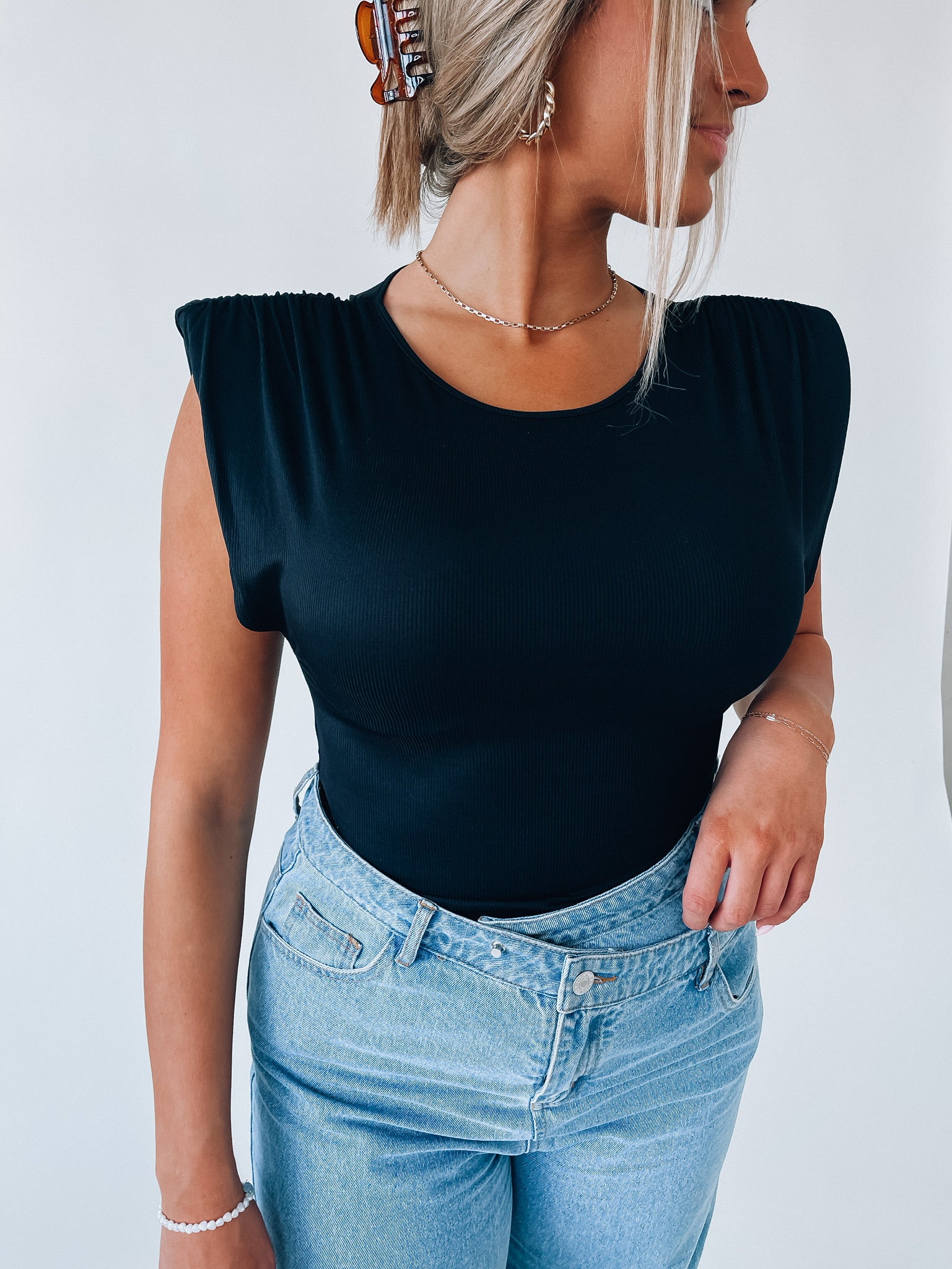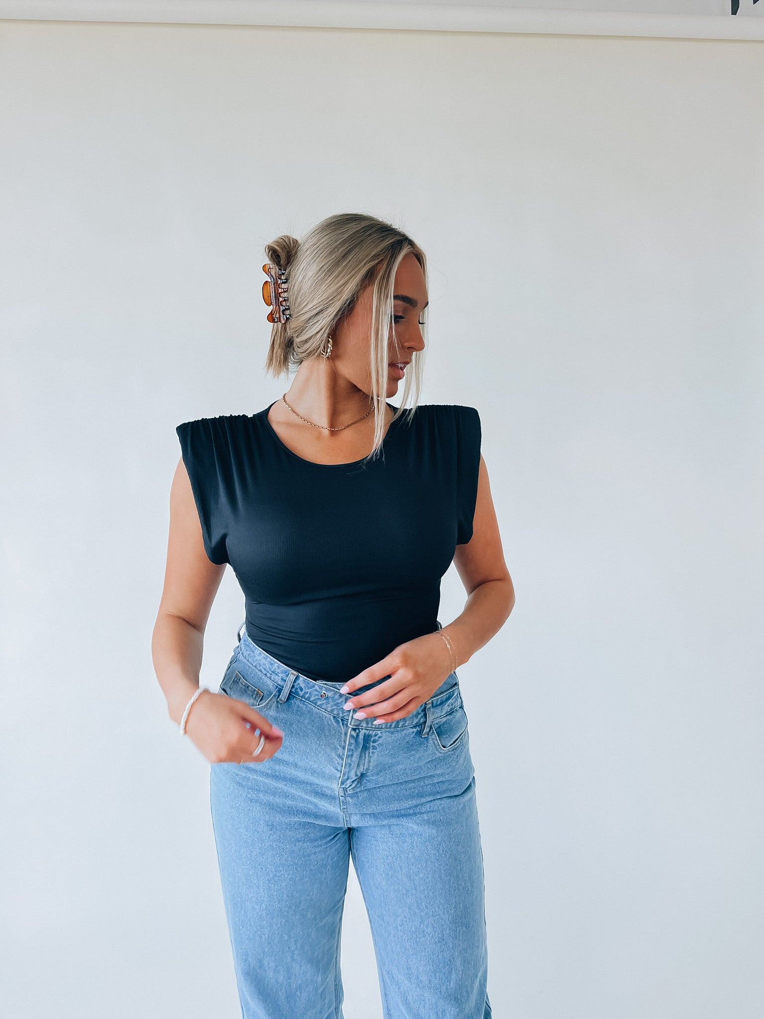 Our Black Trendsetter Bodysuit has a soft ribbed fabric that gives it a fitted silhouette. This bodysuit has puff shoulders, a sleeveless cut, low armhole, and has a snap button closure. Add this bodysuit to your closet to pair it with any items for a basic effortless look!