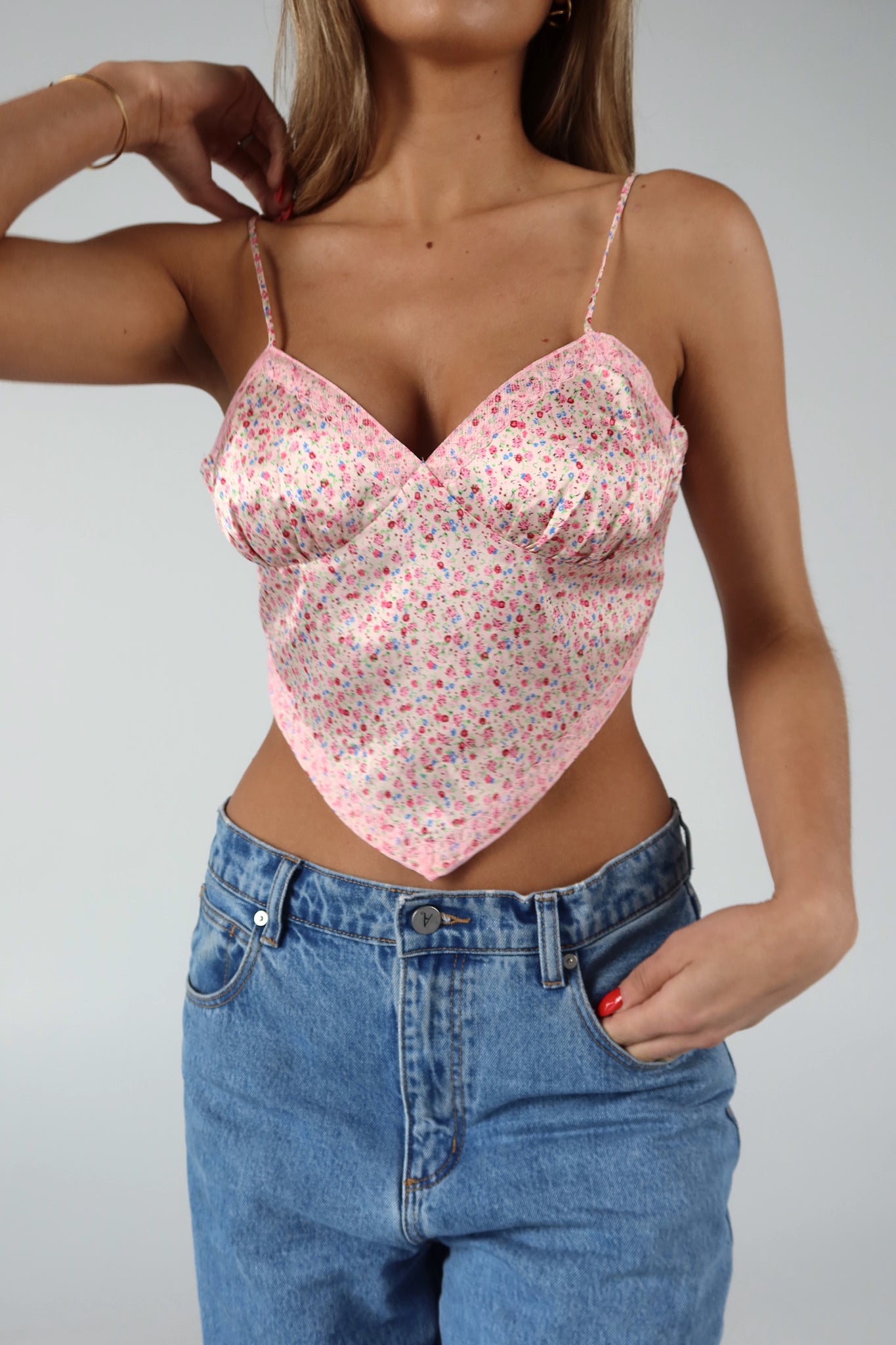 Our Blakely Bandana Top is a silky cropped tank with an asymmetrical hemline. This top features a dainty floral pattern all throughout, a v-neck neckline with ribbon lace along the neckline, and thin adjustable straps. The back of this top is open with an adjustable thin self tie closure.