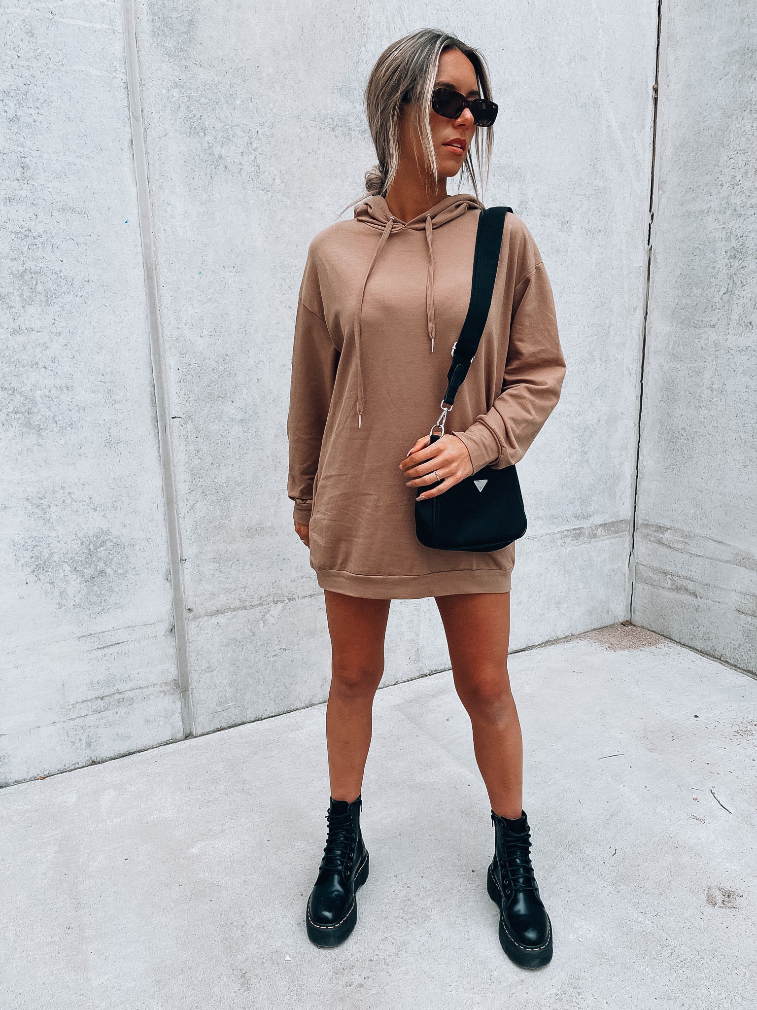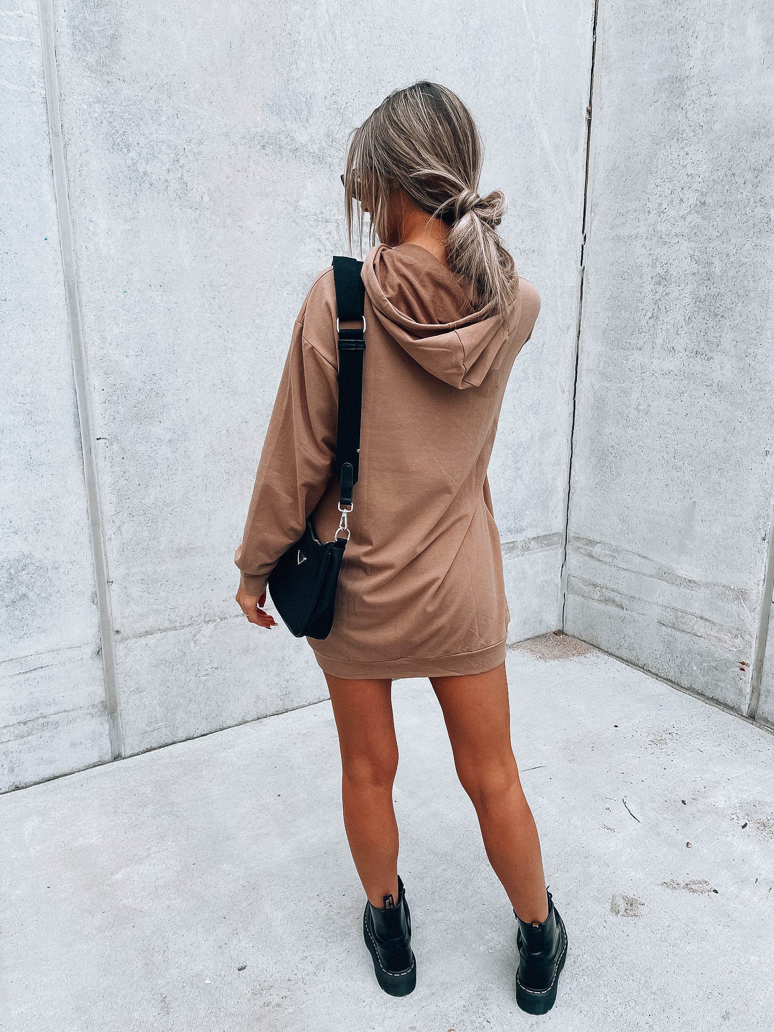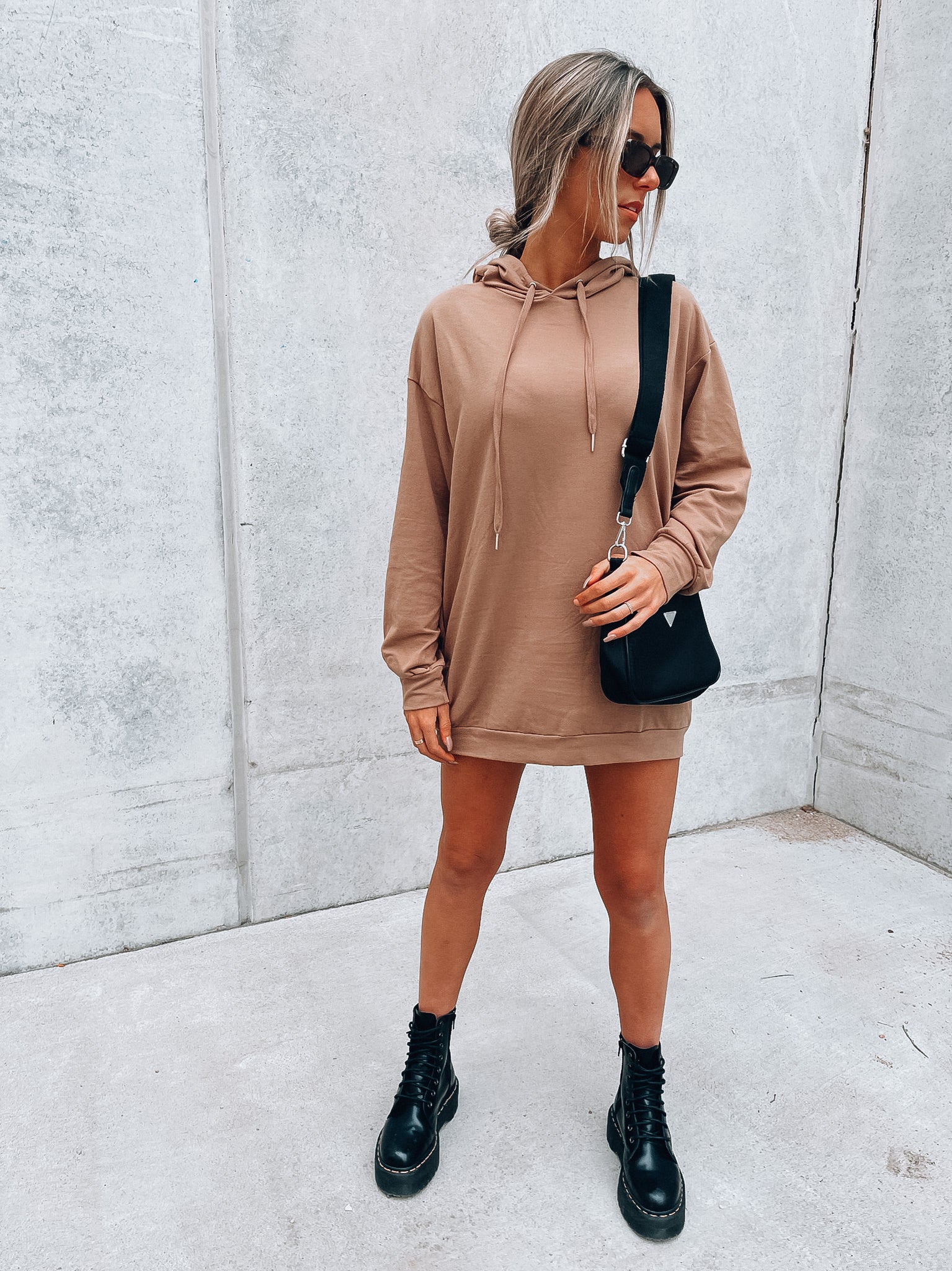 - Features: Long sleeve, hooded, soft cami materail, front pockets, full length bodice, relaxed fit silhouette