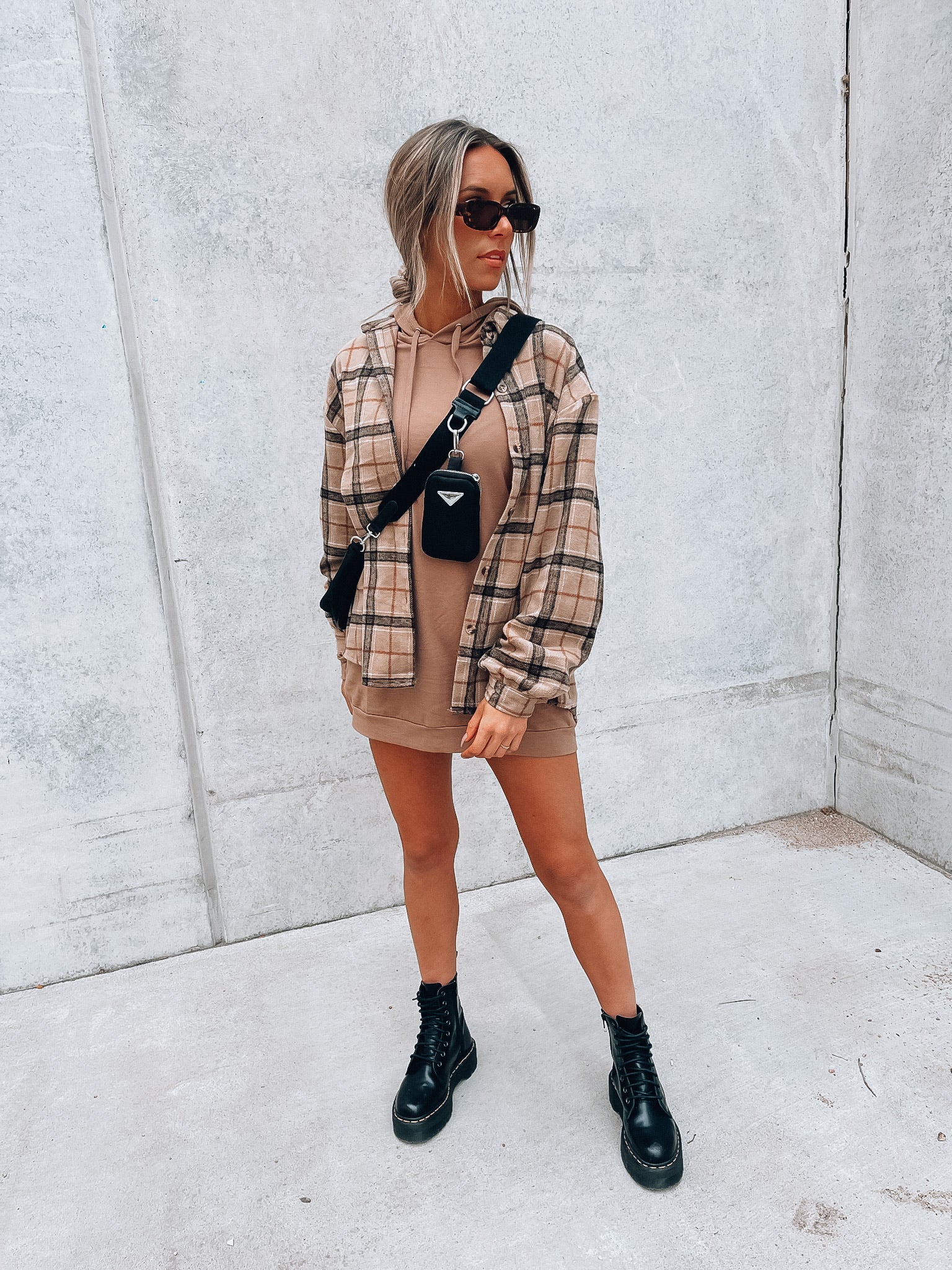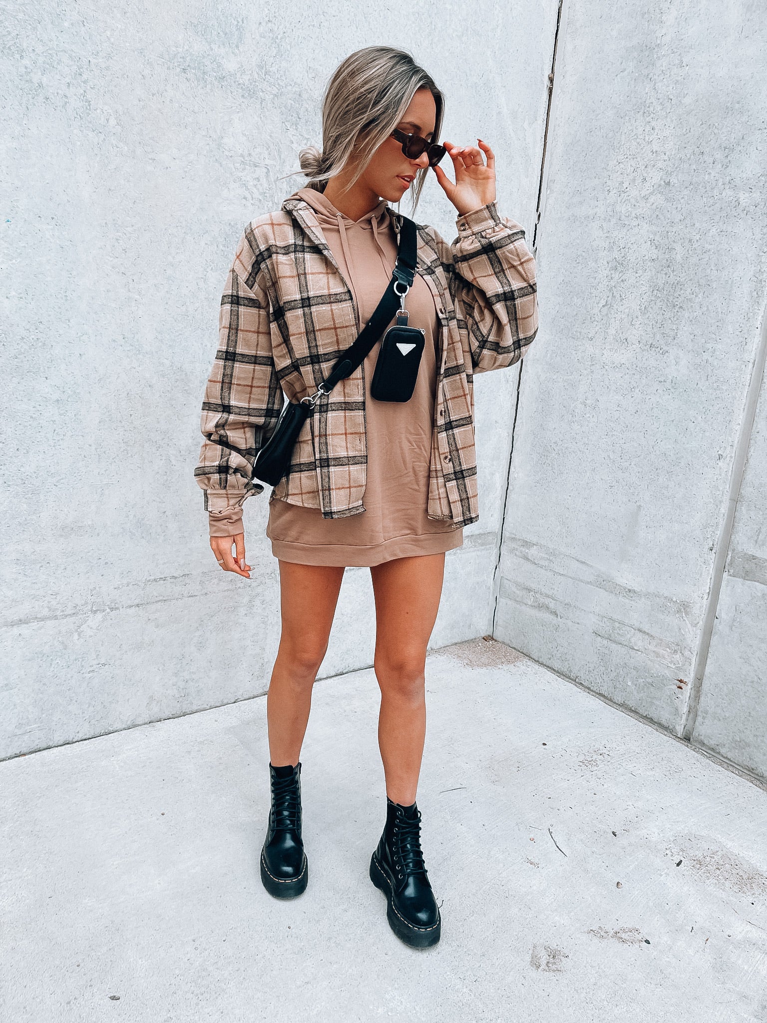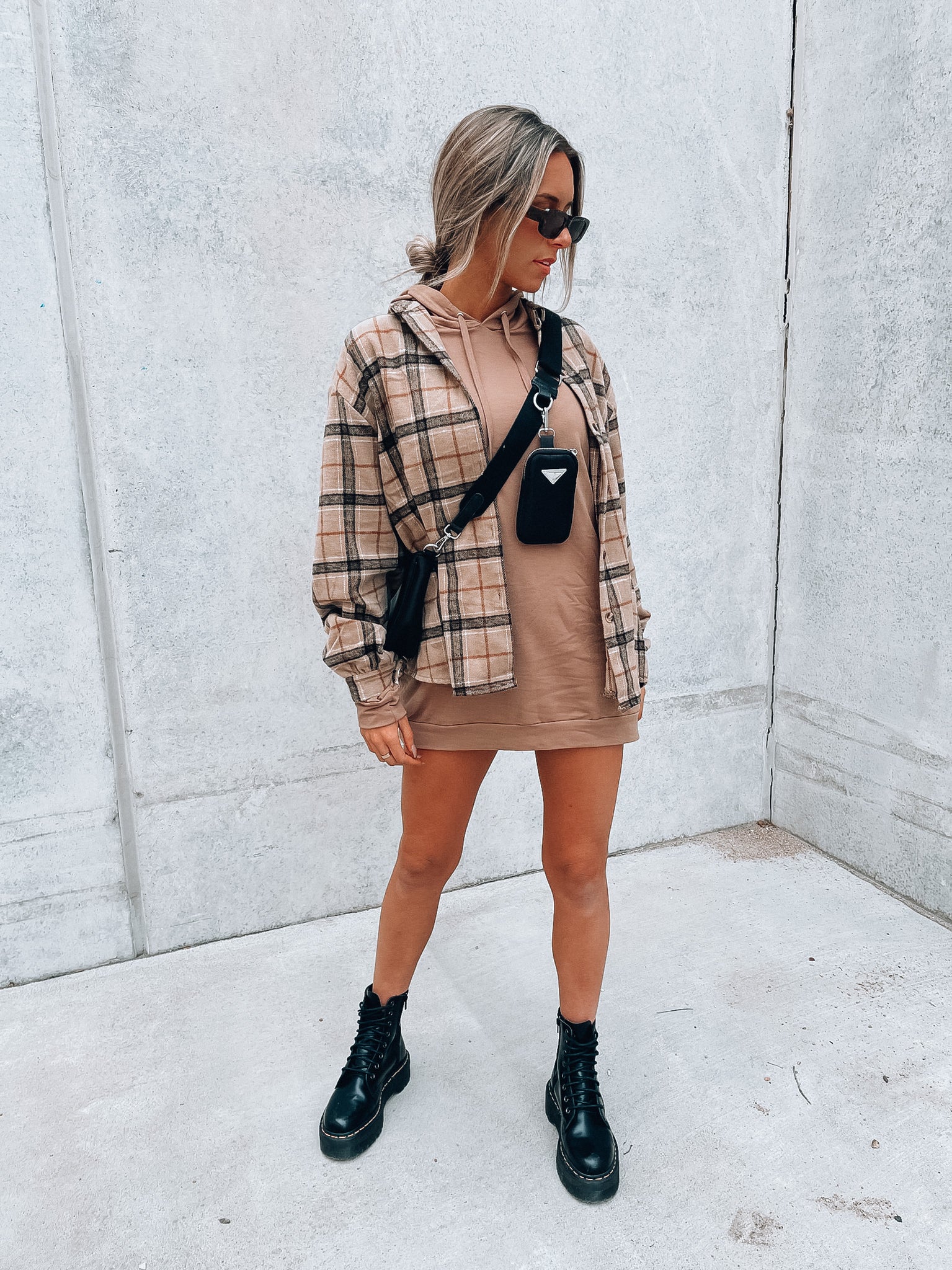 - Features: Long sleeve, hooded, soft cami materail, front pockets, full length bodice, relaxed fit silhouette