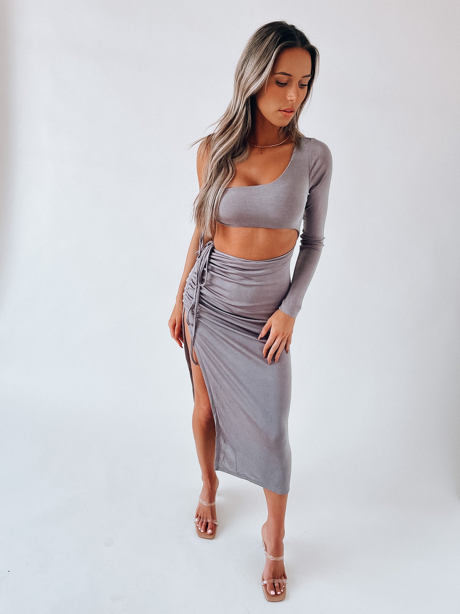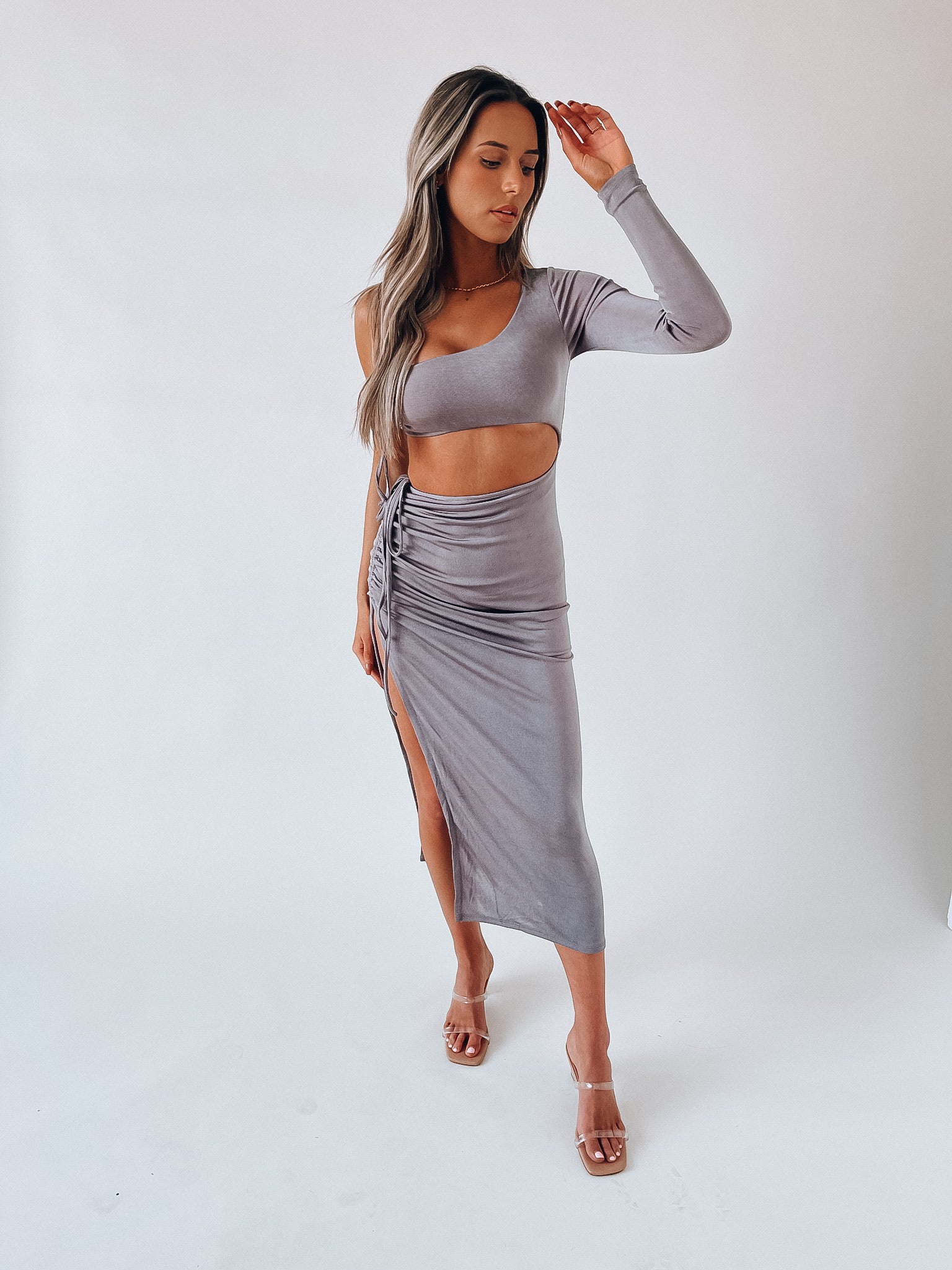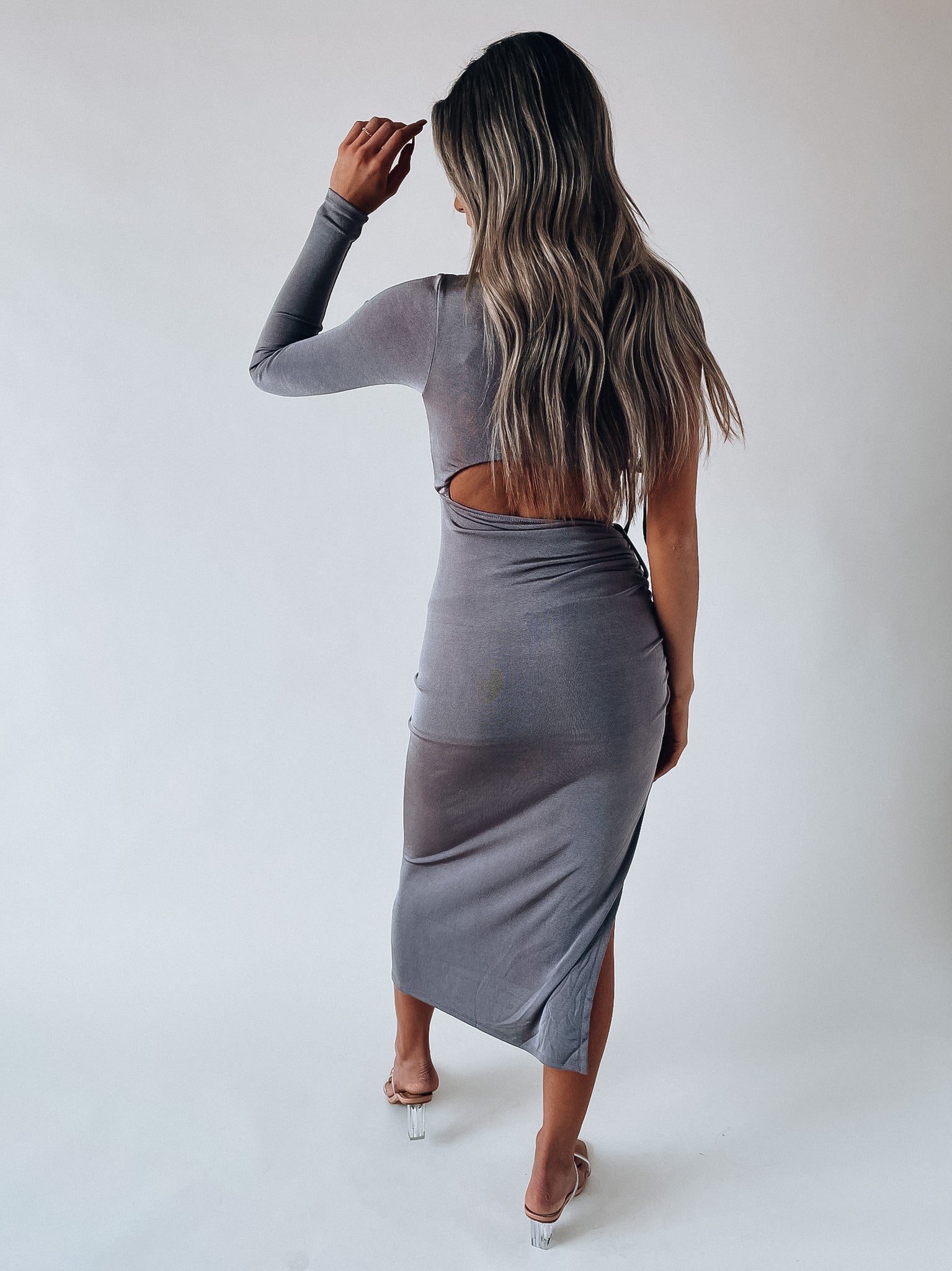 - Features: Midi length, one shoulder long sleeve, cut out detail on bodice, ruching, fitted silhouette