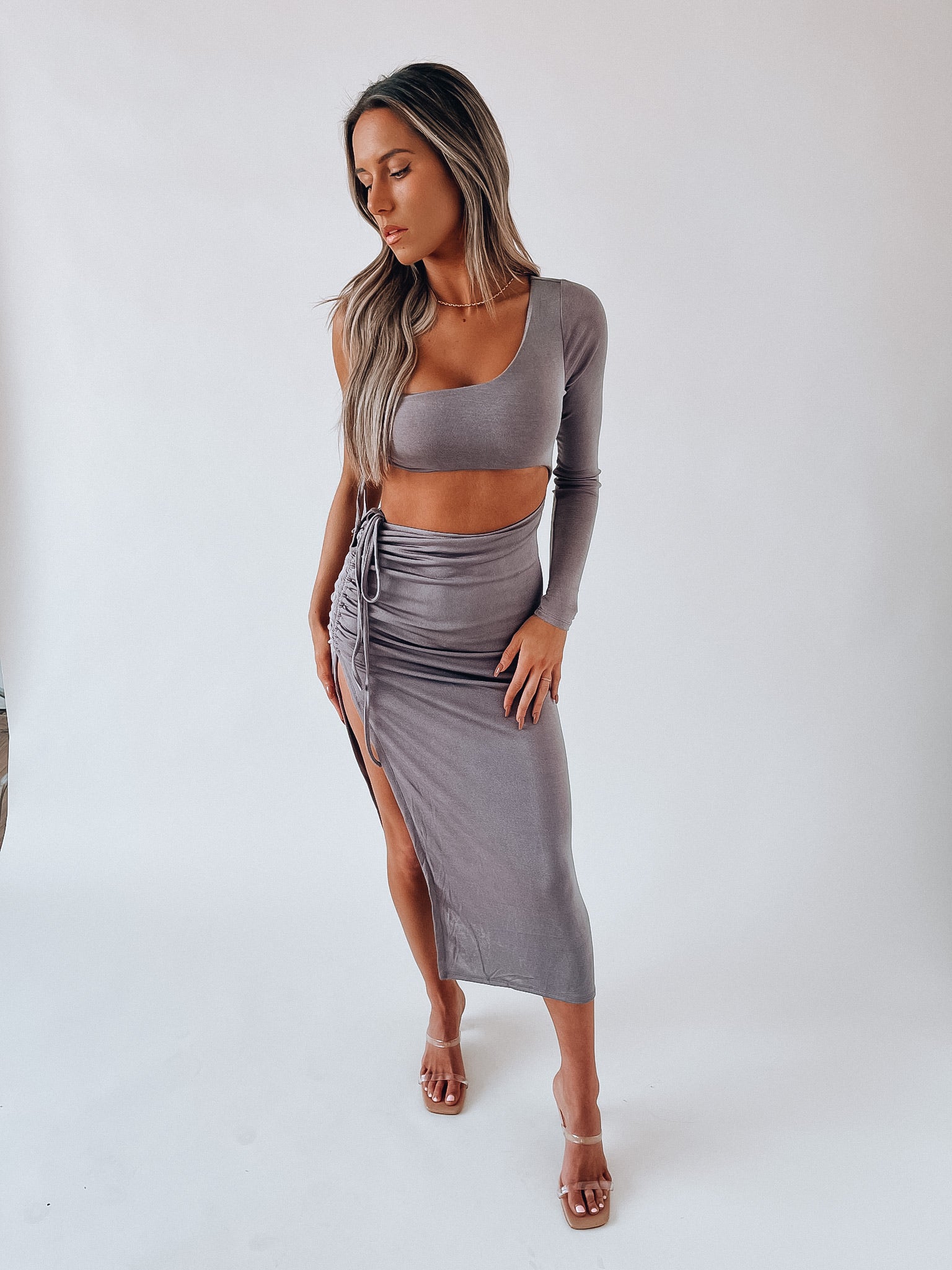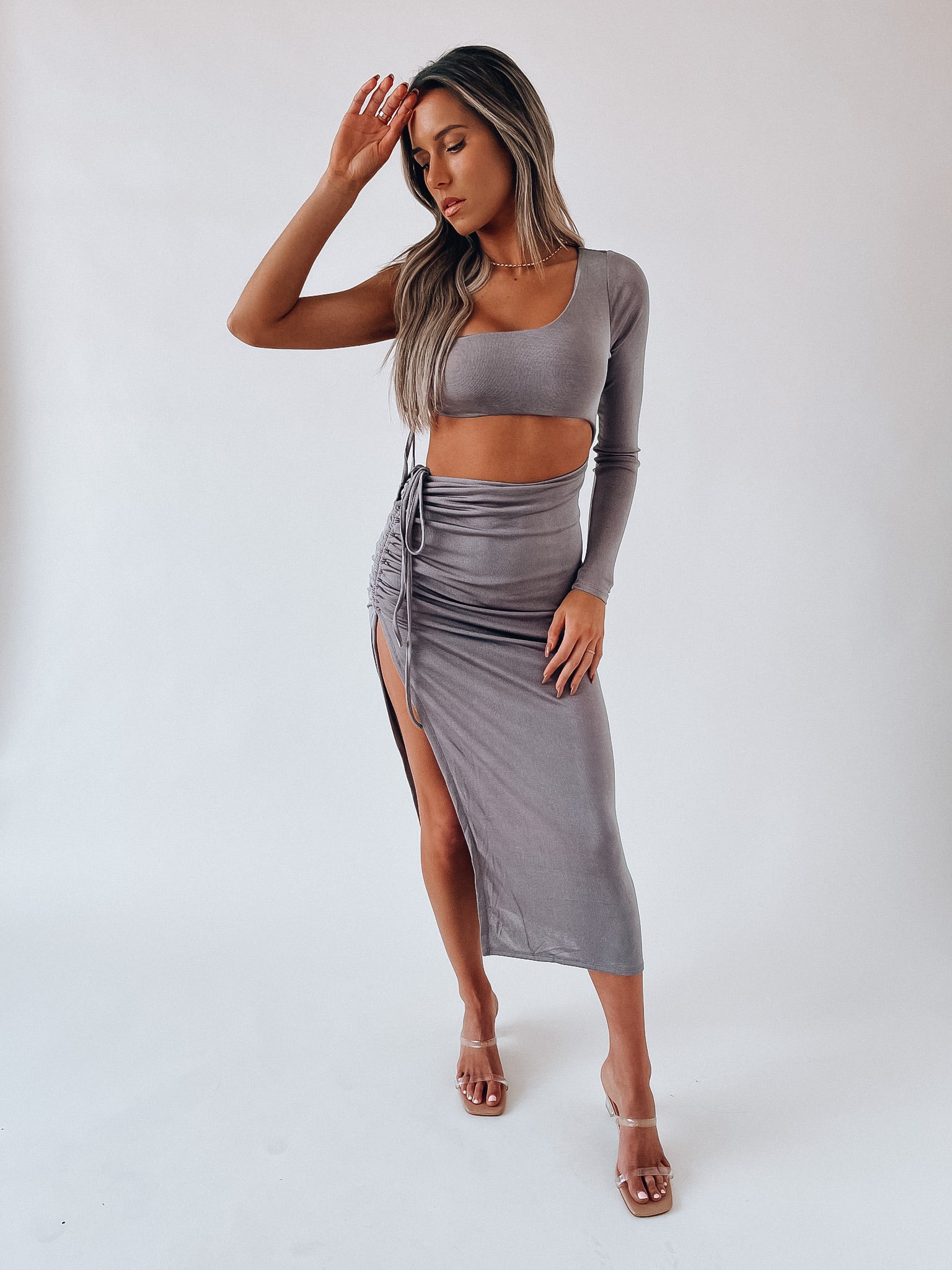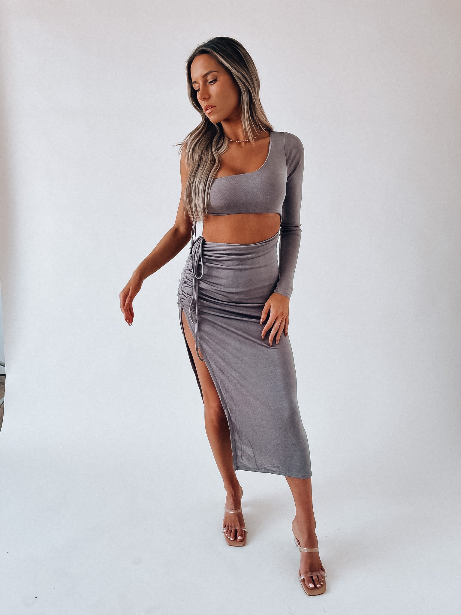 - Features: Midi length, one shoulder long sleeve, cut out detail on bodice, ruching, fitted silhouette