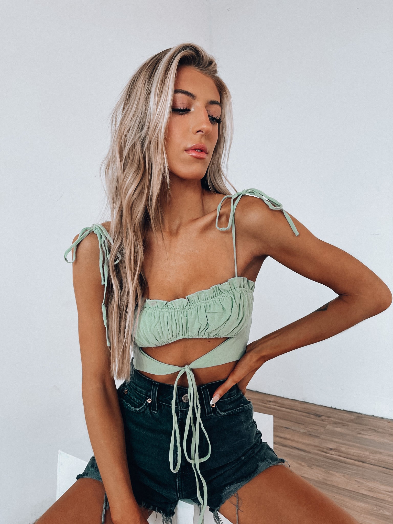 Our Eva Sage Cut Out Crop Top has a ruffle detail on the top with a keyhole detail on the front with a self tie. The back has a smocked back for comfort. This crop top has two self tie straps. The front of this top also has a ruching detail on the bust.
