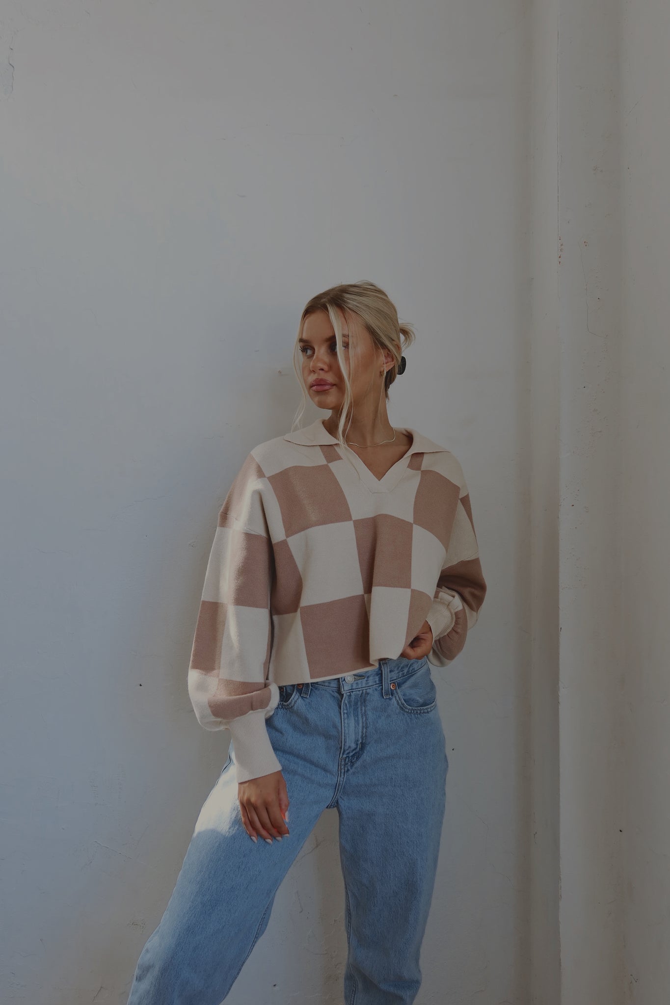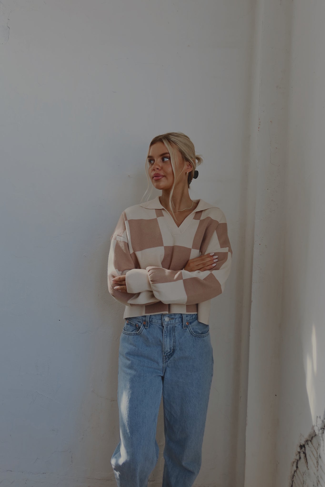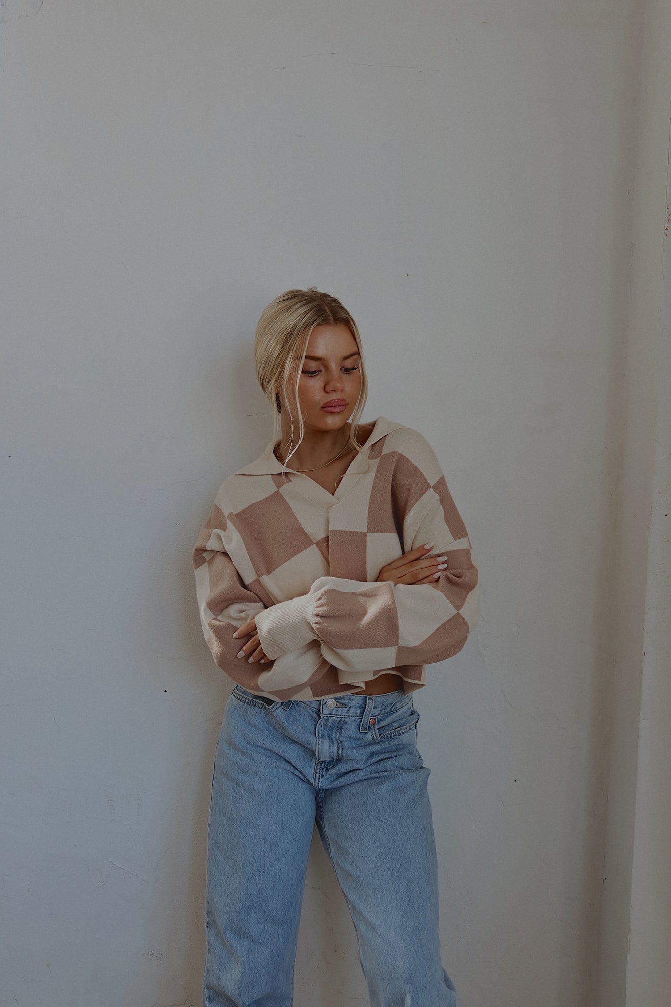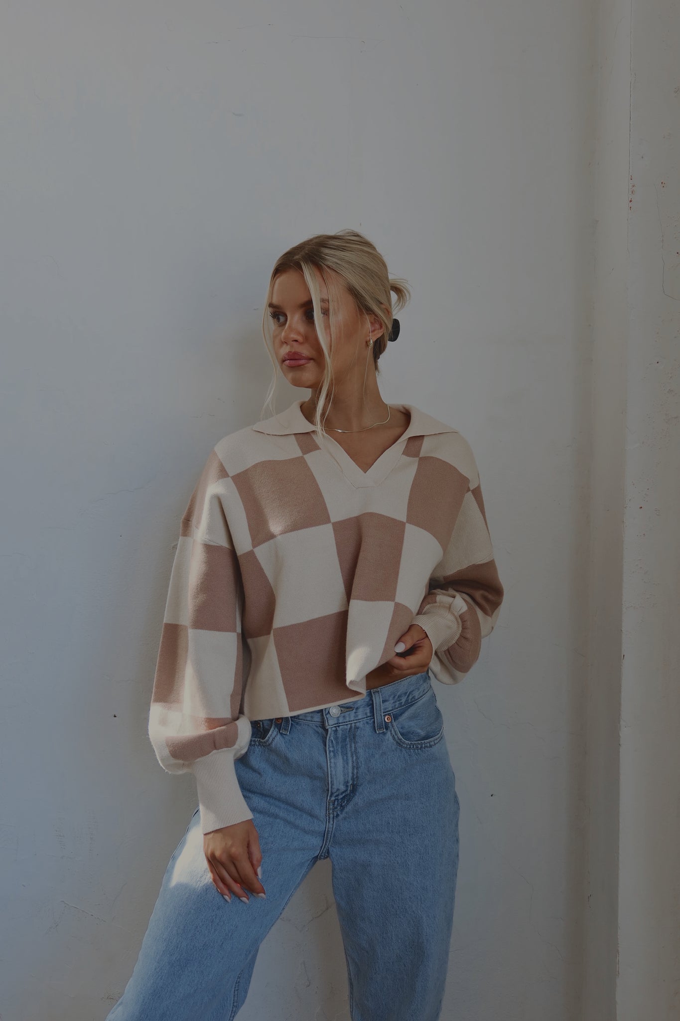 Our Murphy Checkered Sweater has a soft to the touch, knitted fabric with a checkered pattern. This sweater is cropped with a collared v-neckline. The neckline and cuffs are ribbed. There is a tan and beige checkered pattern all throughout. This runs true to size.