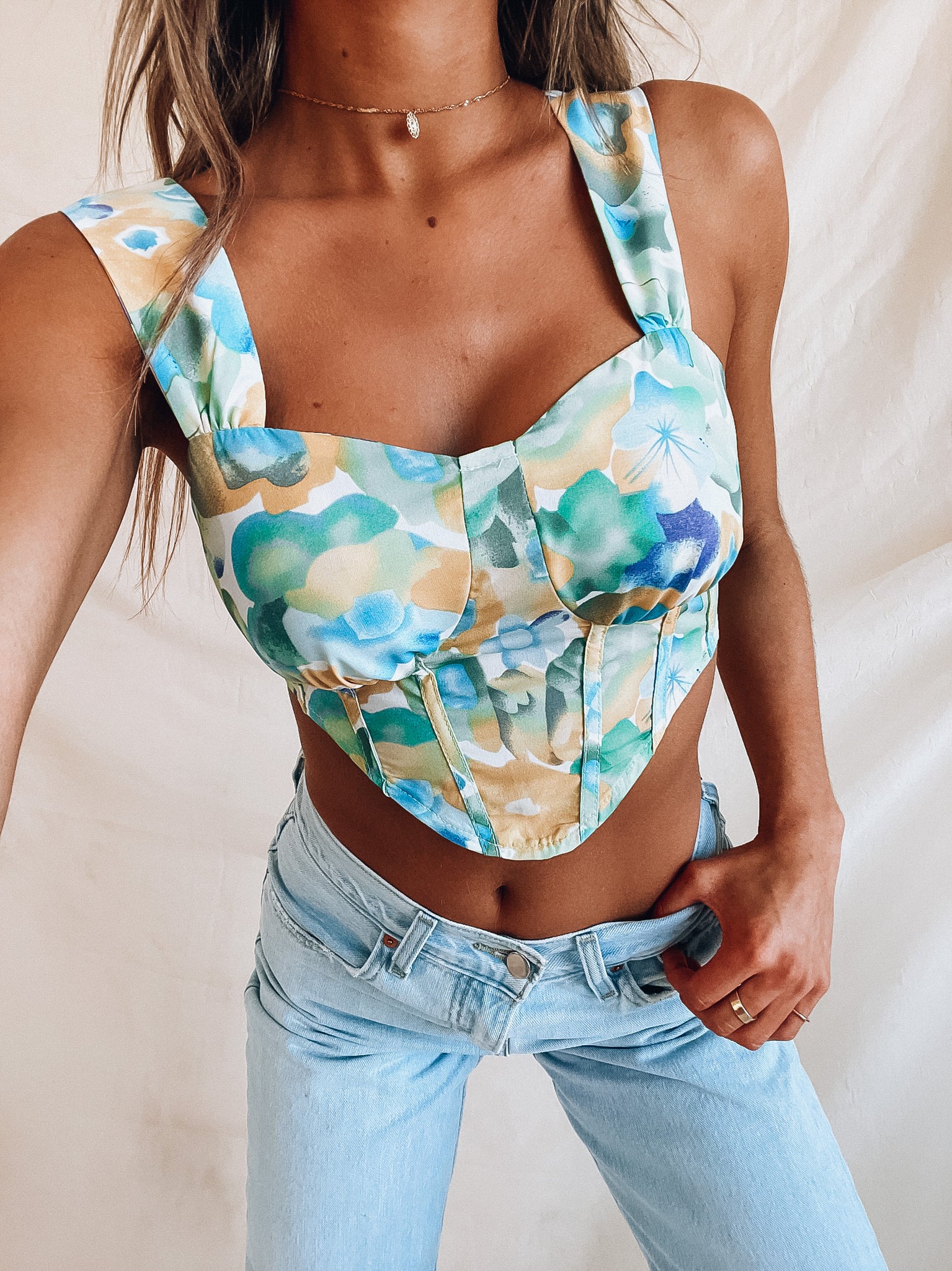 Our Charleigh Watercolor Bustier Crop is a cropped fitted crop. There are seams to make it look more like that busiter look. The bust area is lined. The back has a thick synched back. This lightweight top can we worn with denim shorts, jeans, or a skirt!