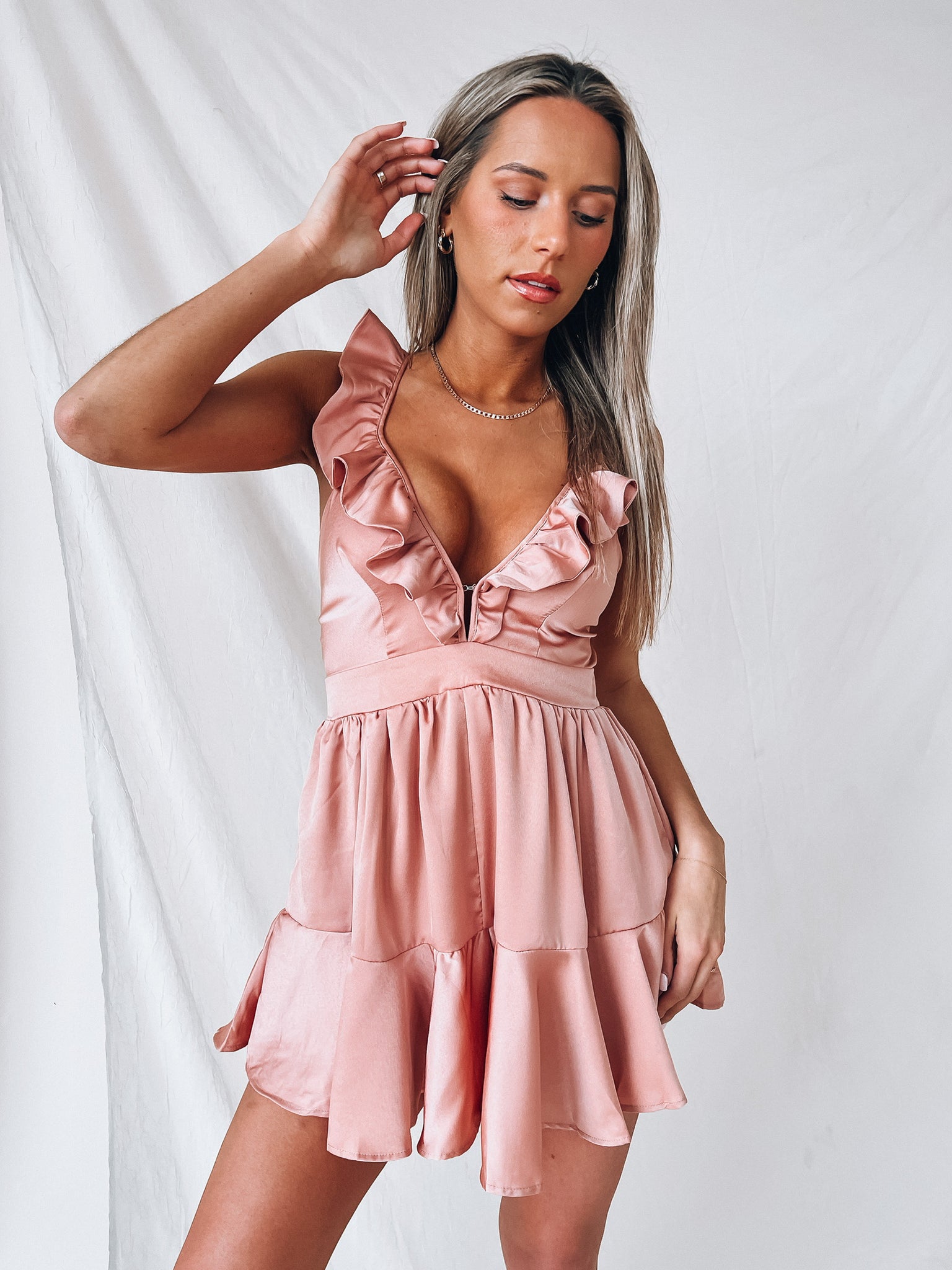 Our Whitnie Silk Ruffled Mini Dress is a super cute lightweight, flowy, silky dress. The front of the dress has ruffles running up the strap and the straps on the back turn into a crossed back self tie closure. The back of the dress has a zipper closure with a hook and eye clasp. The front of the dress have a v neck with a hook and eye clasp to keep it open or closed. The inside of this dress is lined.