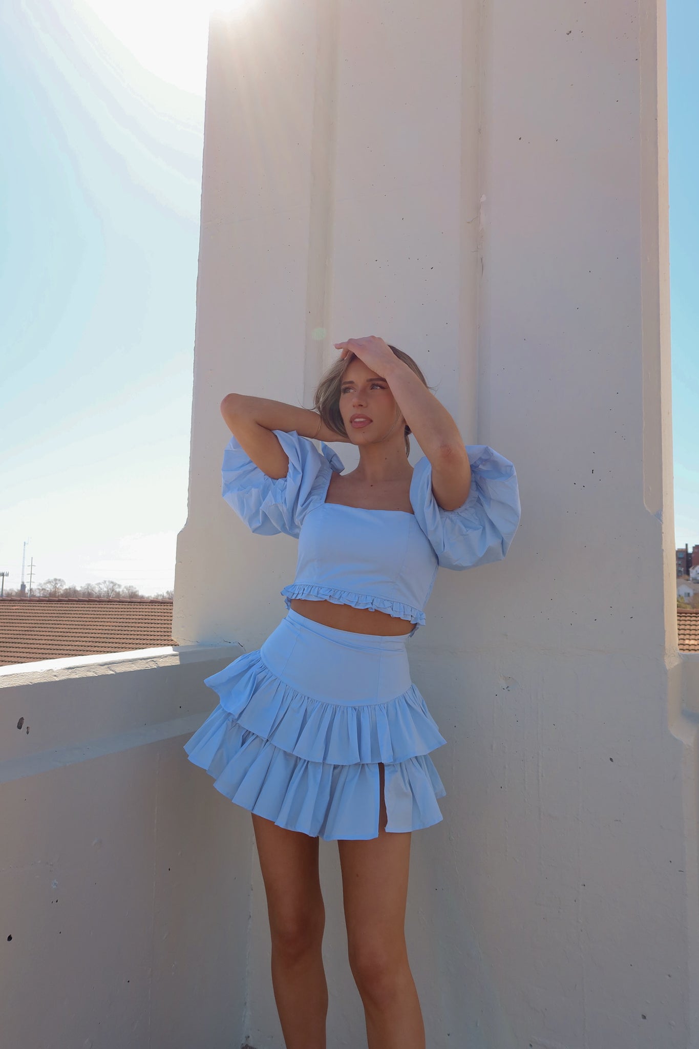 Our stunning Zoe Puff Sleeve Crop Top And Skirt Set, a fashion-forward ensemble that exudes elegance and charm. Stand out with eye-catching three-quarter length puff sleeves adorned with charming bows and delicate ruffle details. The crop top features a chic square neckline and a flirty ruffled hemline, adding a touch of femininity to your look. Paired with the matching mini skirt boasting two tiered ruffled layers, this set is sure to turn heads wherever you go. Designed for convenience and comfort, both pieces are equipped with zip closures for easy wear. With a true-to-size fit, the Zoe Puff Sleeve Crop Top And Skirt Set is the perfect choice for making a stylish statement on any occasion.