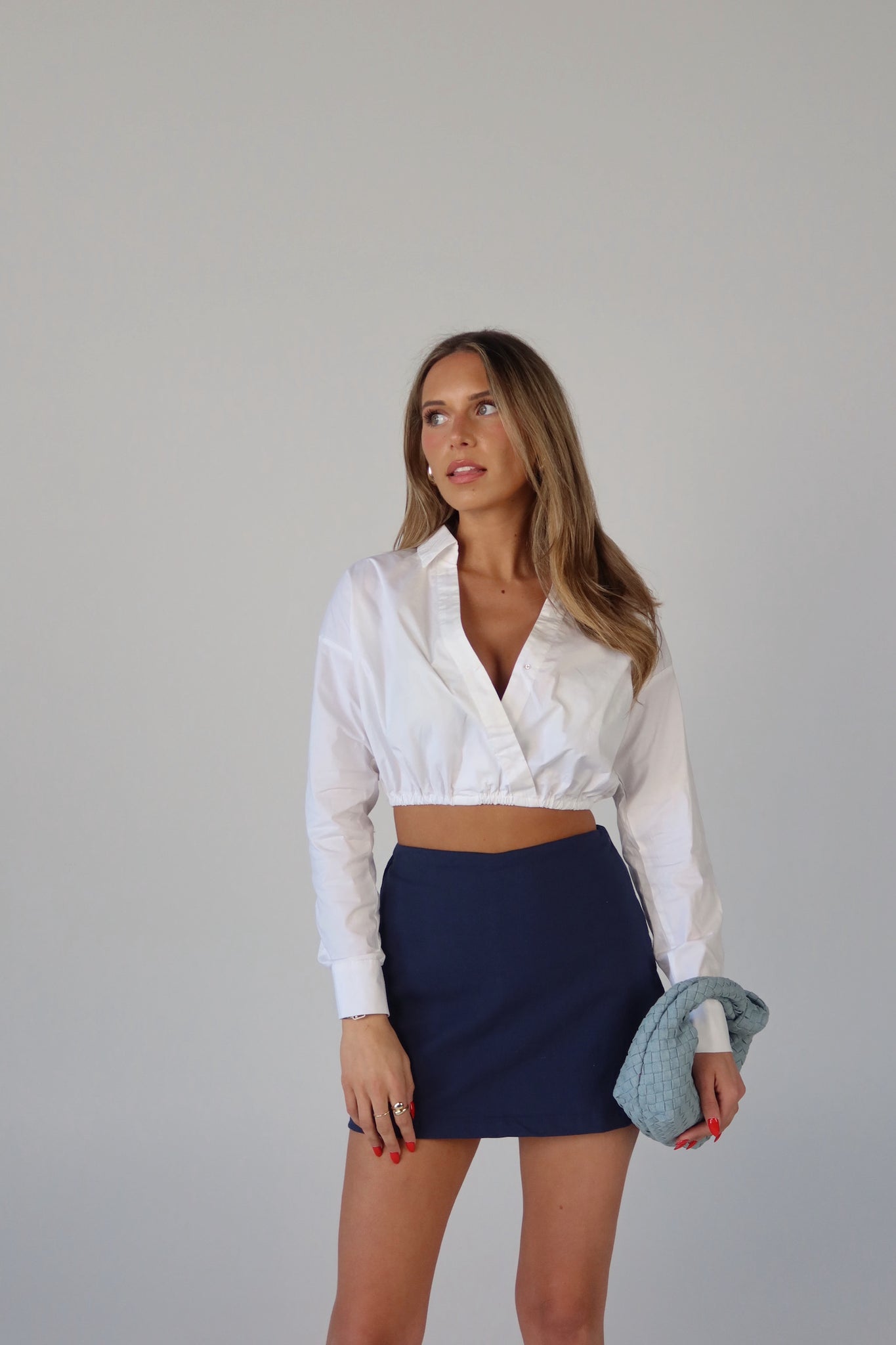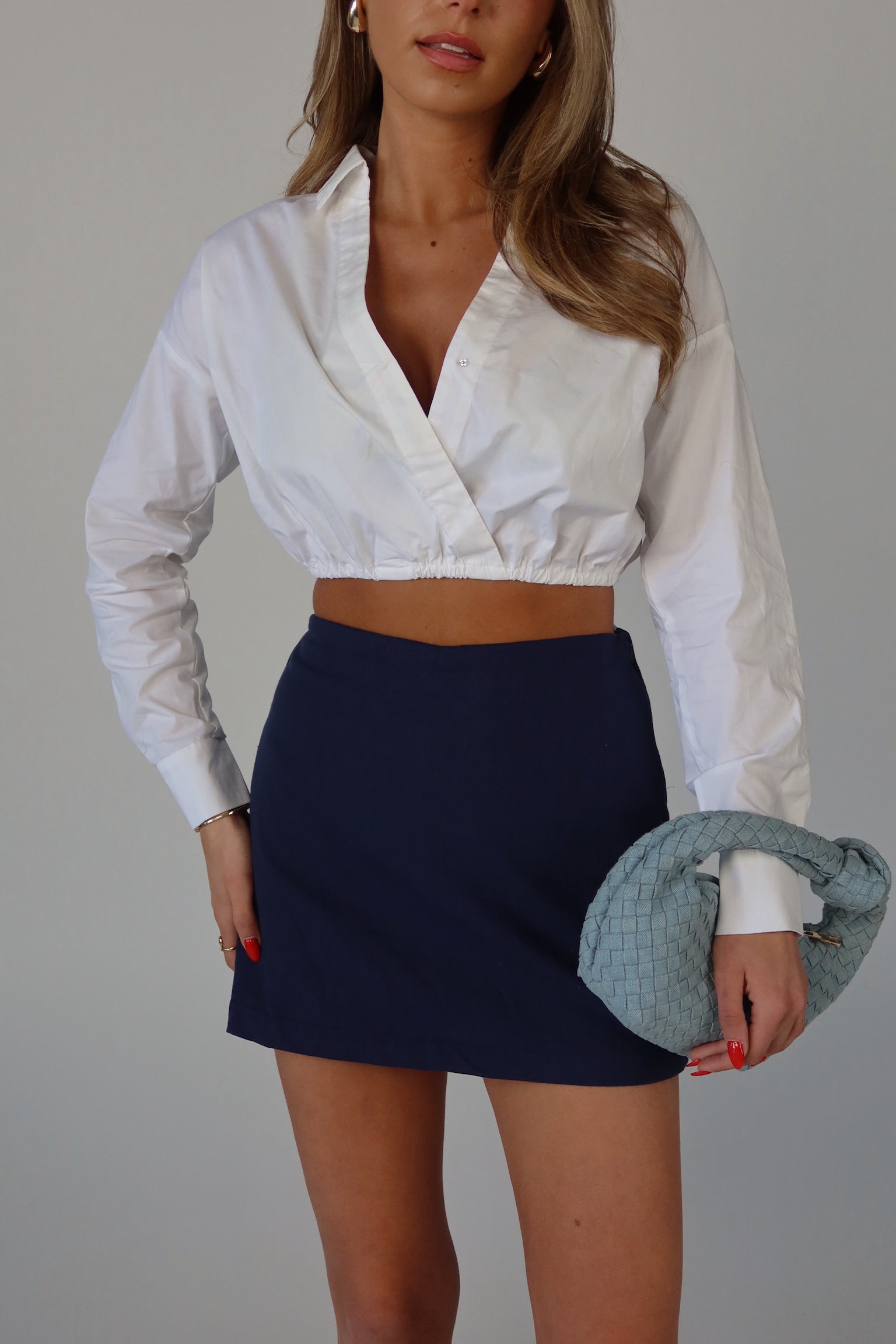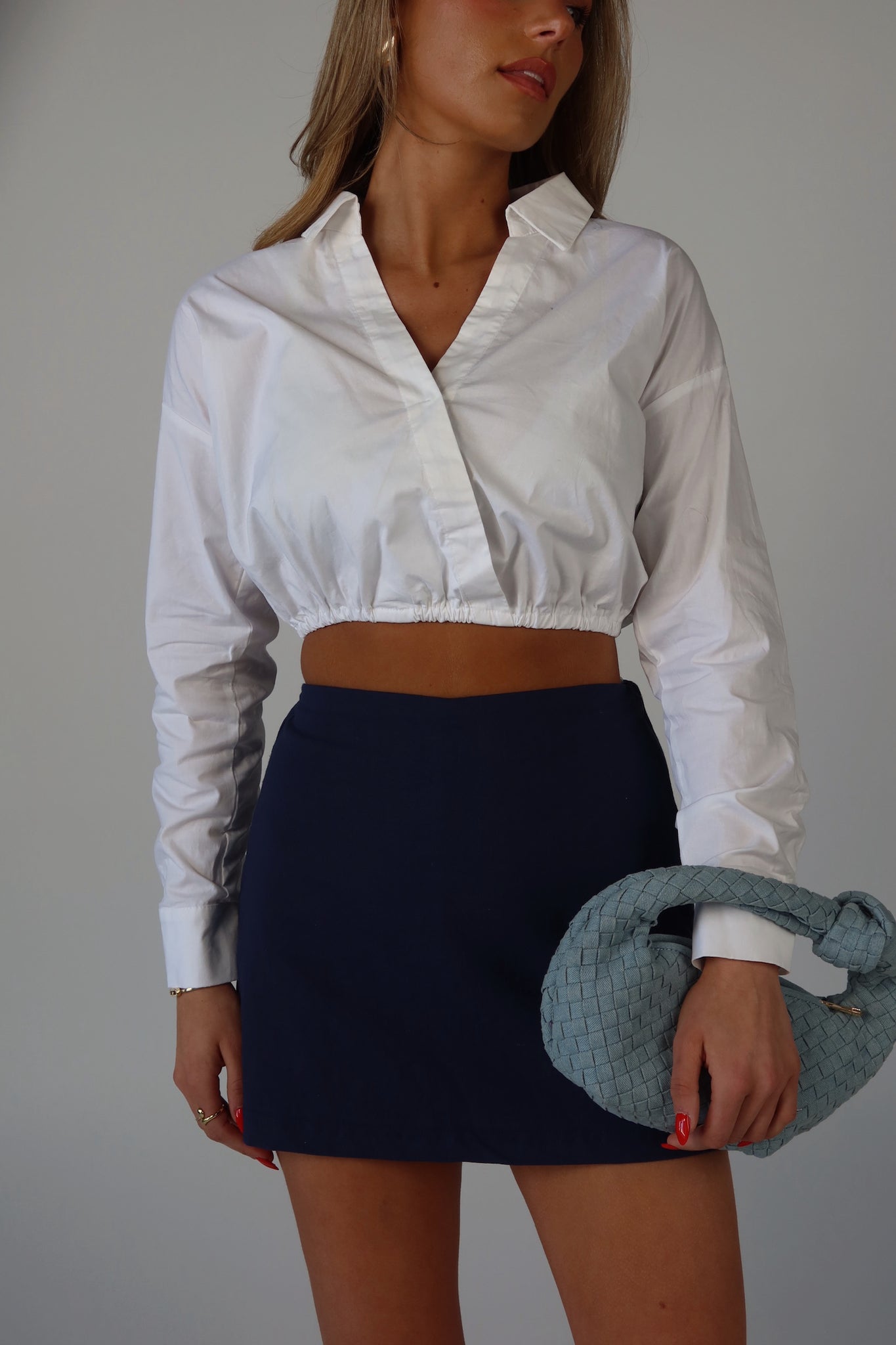 Our Zaria Collared Top is a cropped top with mid length sleeves and elastic hemline. This top features a vneckline with overlap detail and snap closure. This top features a bubble style relaxed fit. The rolled sleeve detail gives a this top an extra chic look.