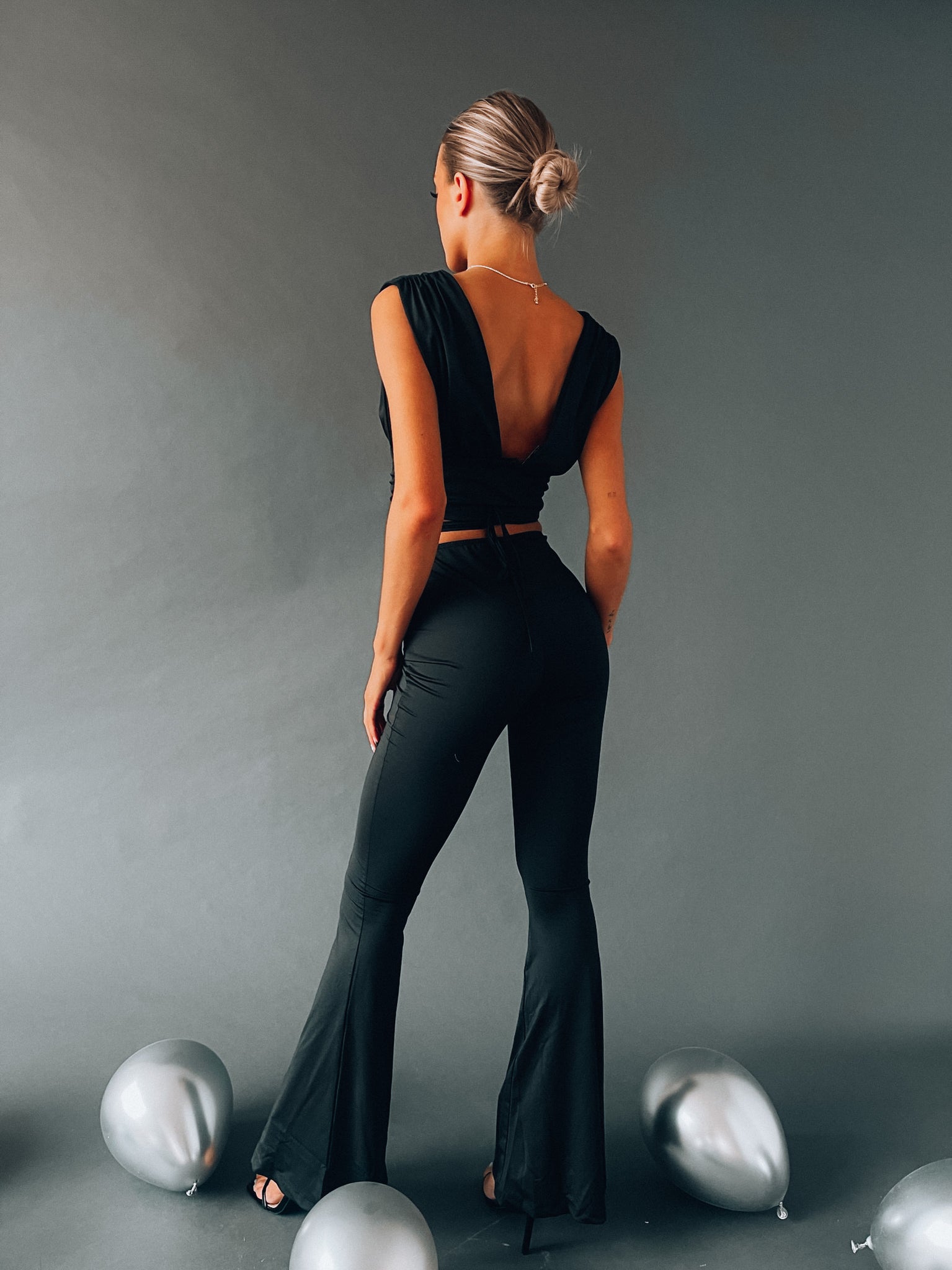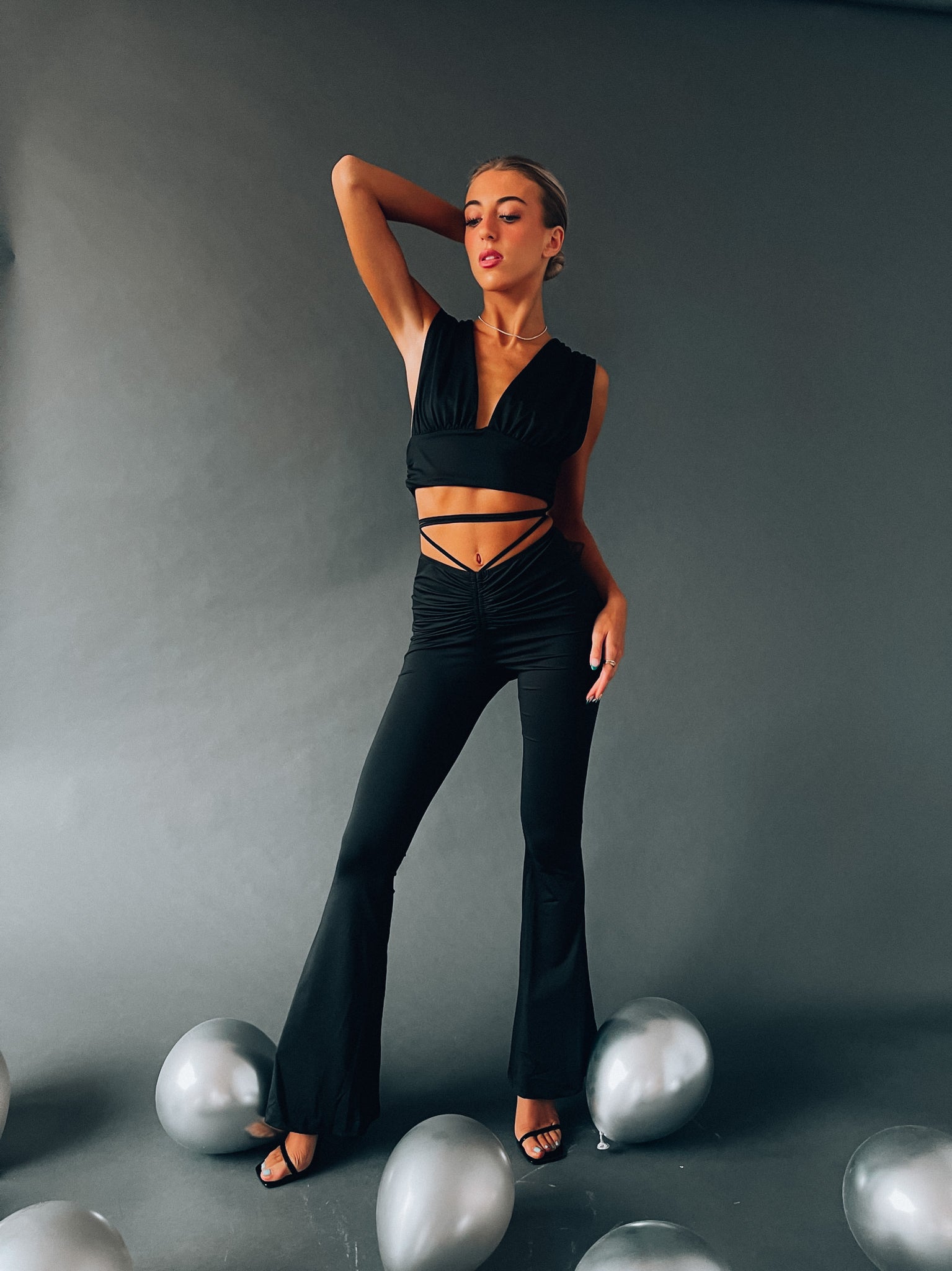 - Features: Sleeveless cropped top with plunge neckline, flare pant with elastic waistline, wrap detail on bodice, fitted silhouette