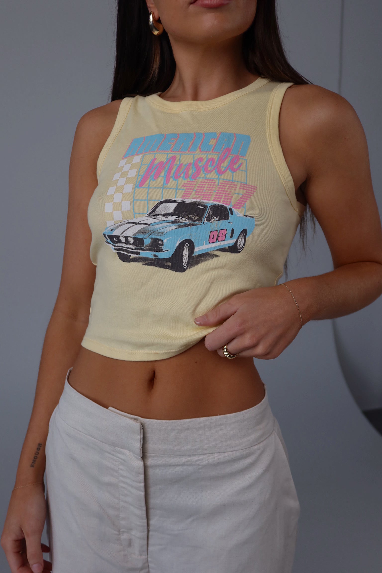 Our American Muscle Graphic Tank has a fitted racerback with a highneck scooped neckline. This top features a fun American Muscle car graphic and has a full length hemline fit. This tank top is made of a soft cotton material, fits true to size, and has stretch.