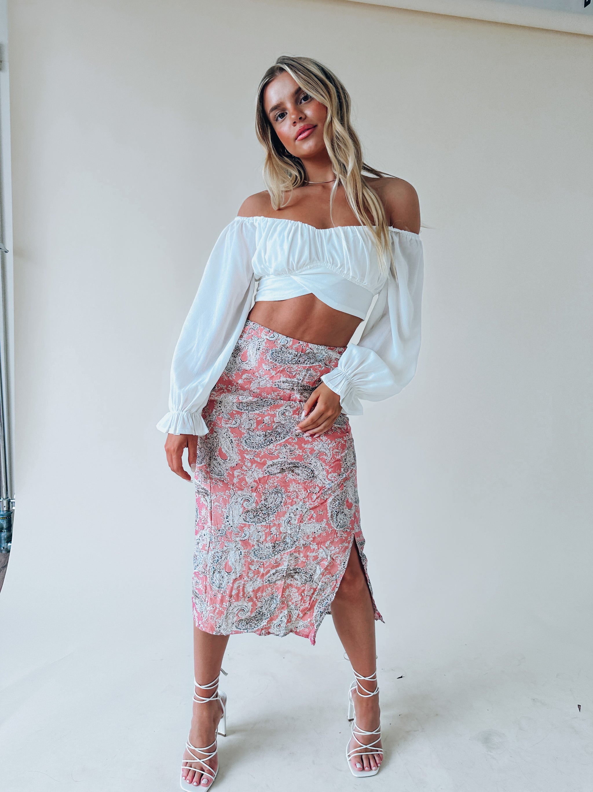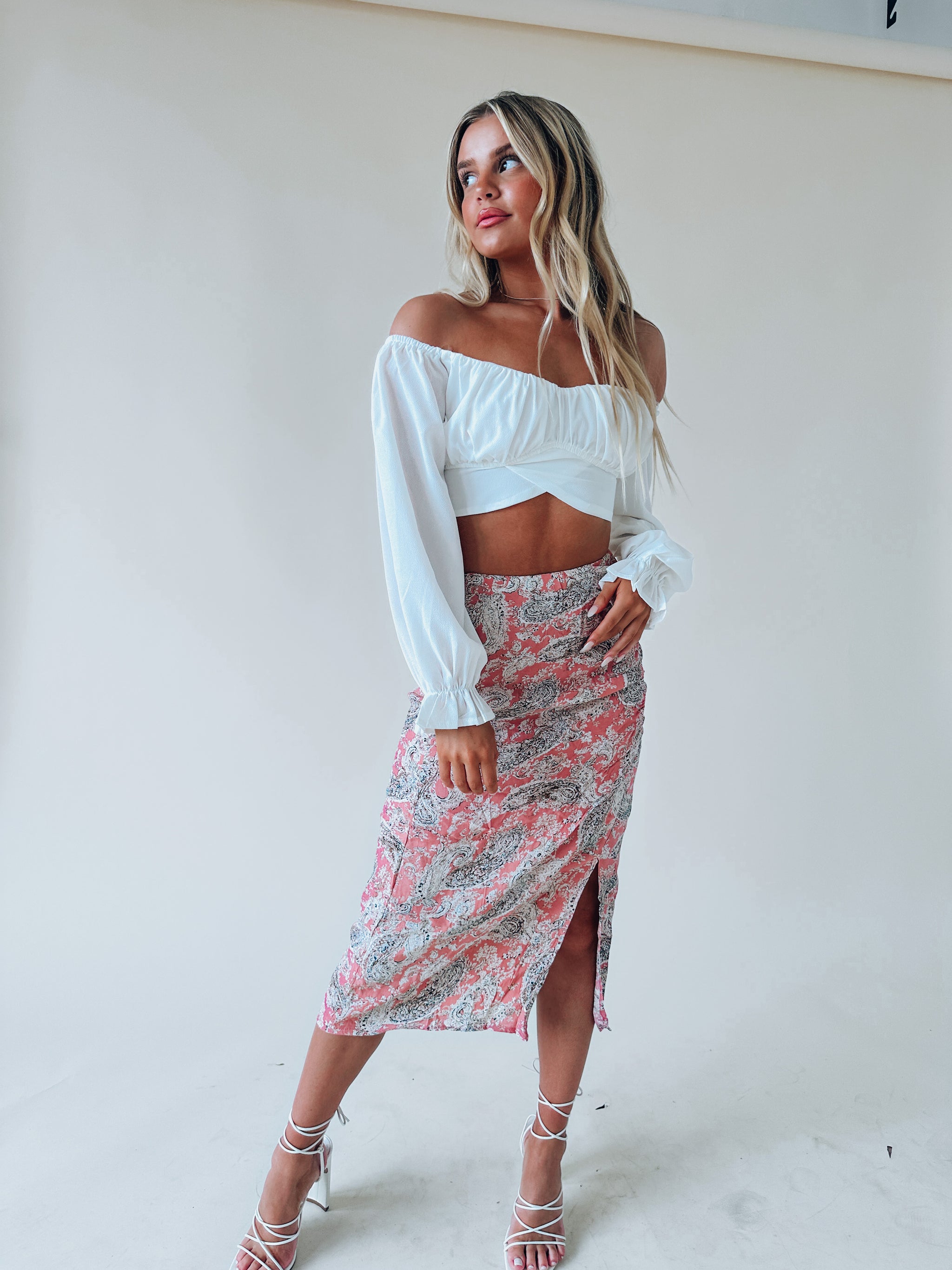 Our Paisley Print Midi skirt is high waisted and has a loose fit to it. This midi skirt is LINED on the inside and has a front slit. There is an elastic wasitband for a comfy fit and has a good stretch to it. This item has a hidden side seam zipper with a hook and eye clasp. Pair this skirt with an adorable top for a cute spring look!