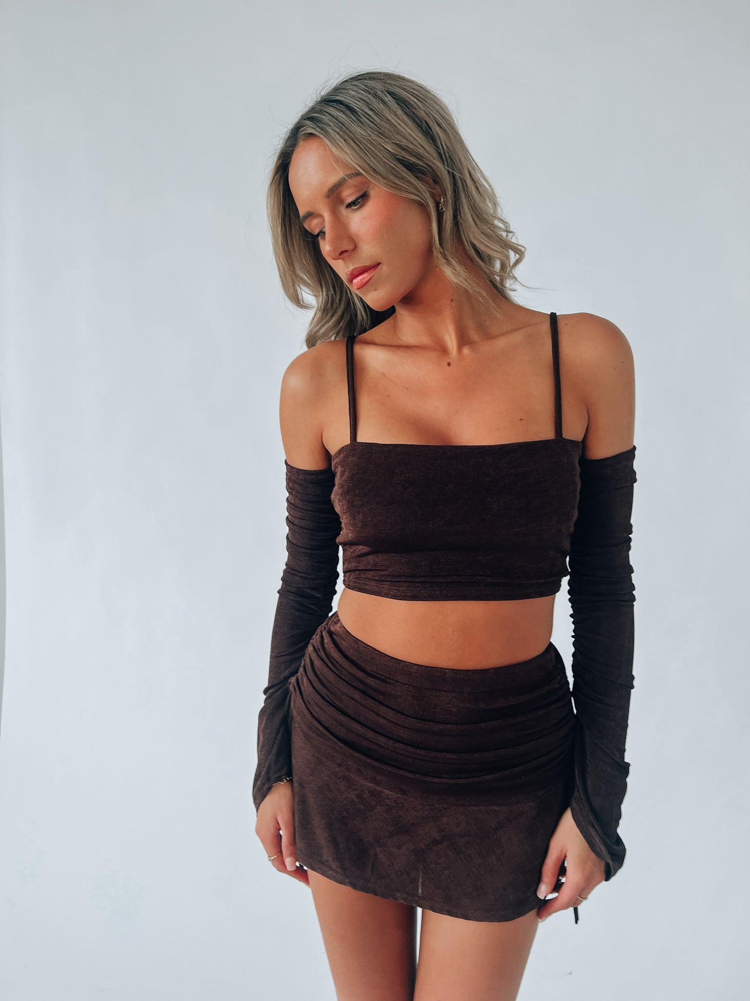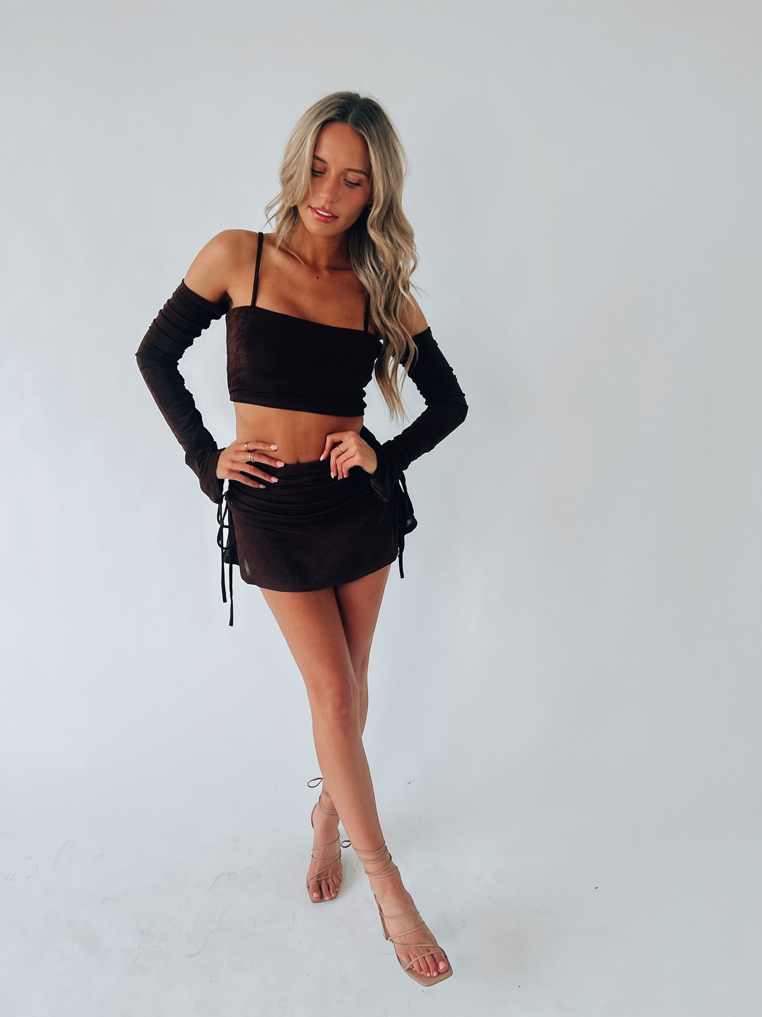 Our Jaiya Skirt Set is a skirt and top set that is loaded full of details. The top in this set is a fitted crop top with a square neckline with adjustable with back strap detail. This set is very stretchy and is fully lined for additional structure. The skirt includes hidden shorts, thick elastic waistline, cinchable side detail to create a more customizable fit ,and ruffle hemline.