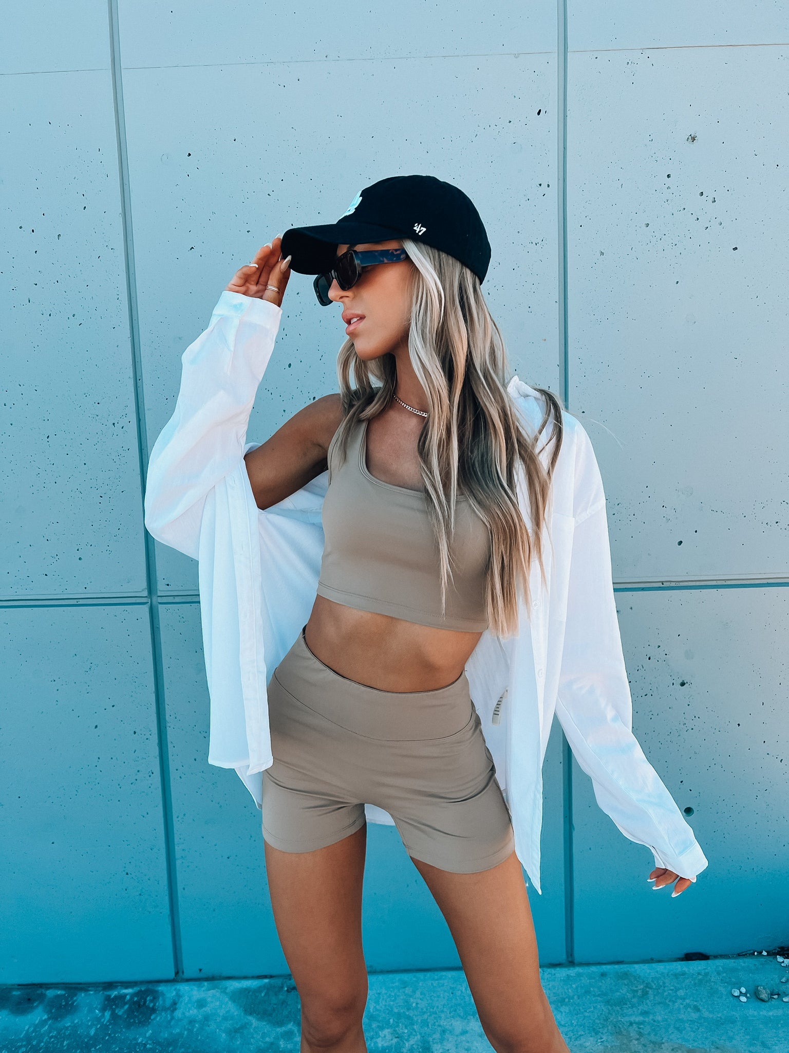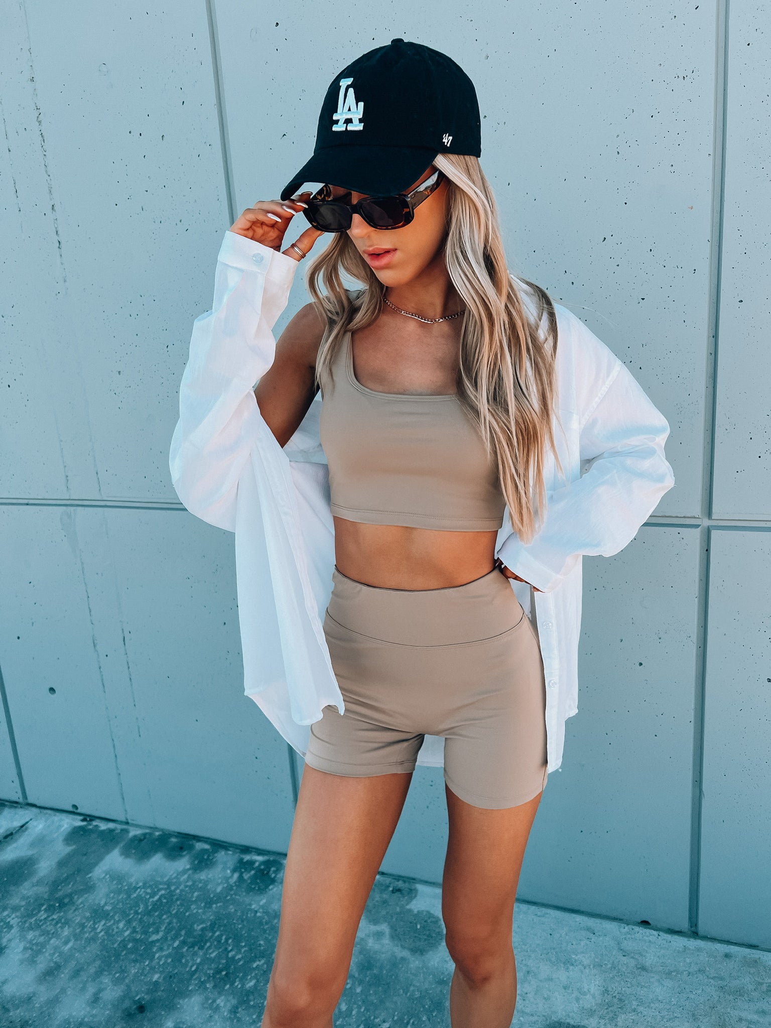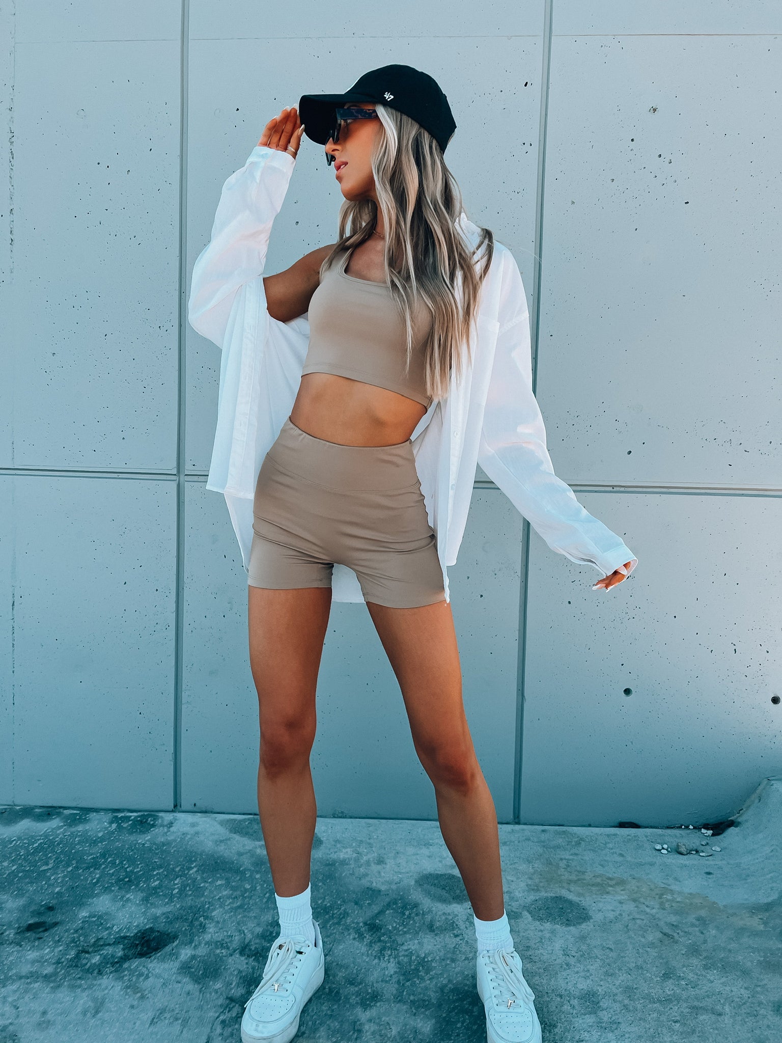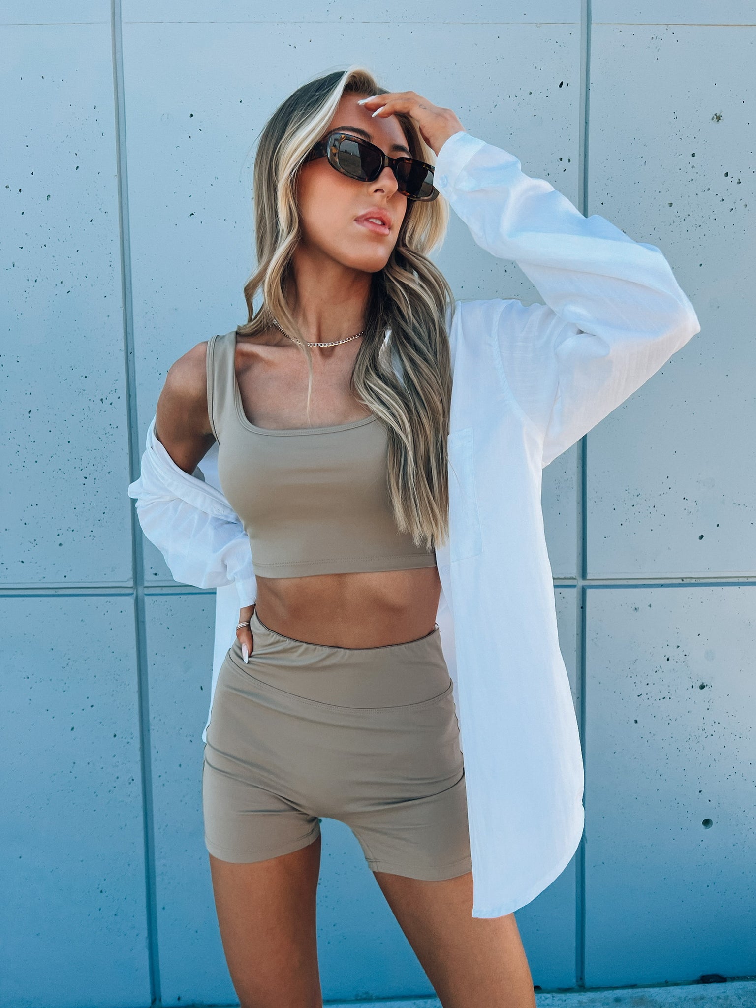 Our Lux Active Set In Taupe is a cropped two piece set. It comes with a cropped tank and biker shorts.