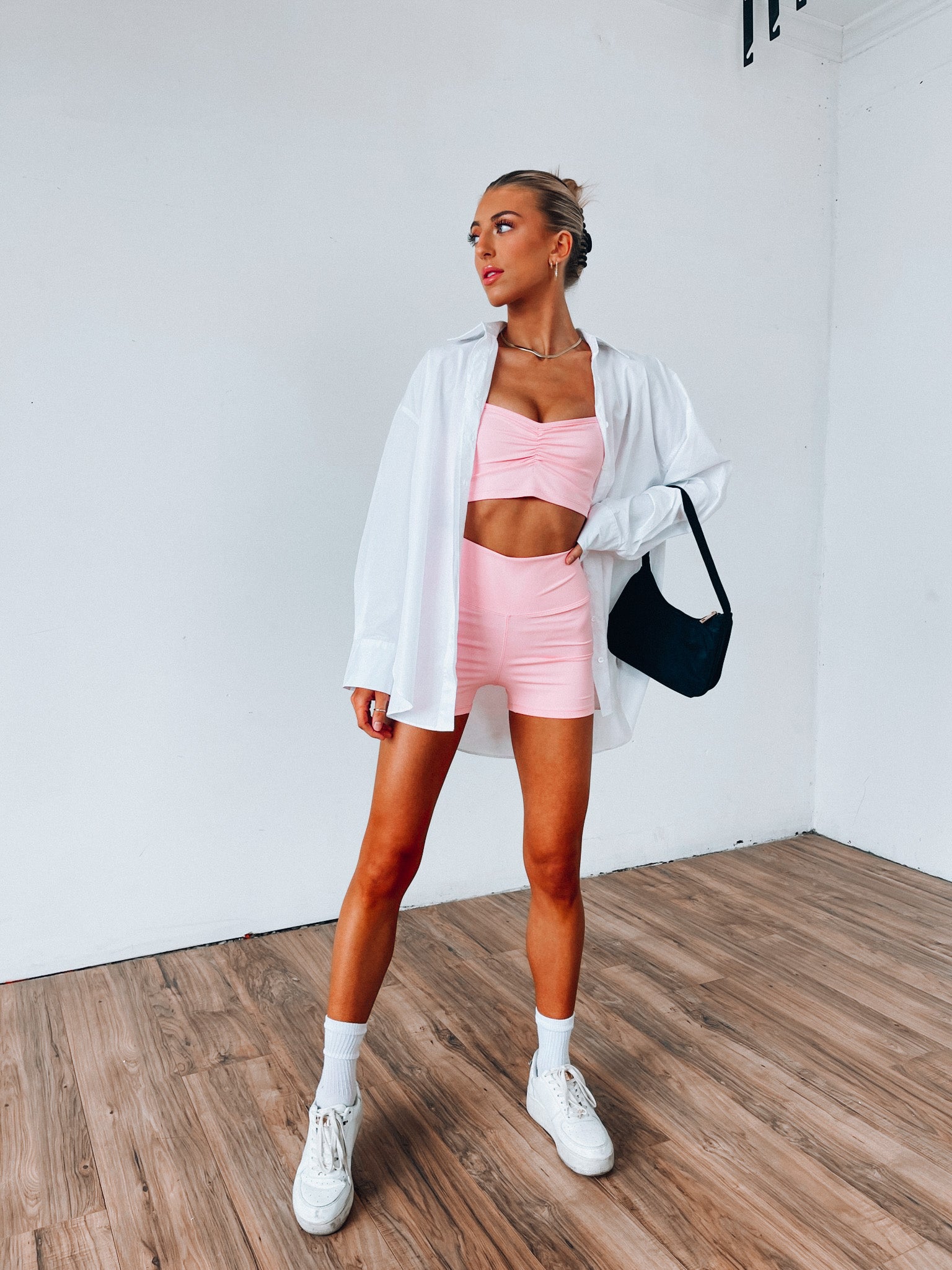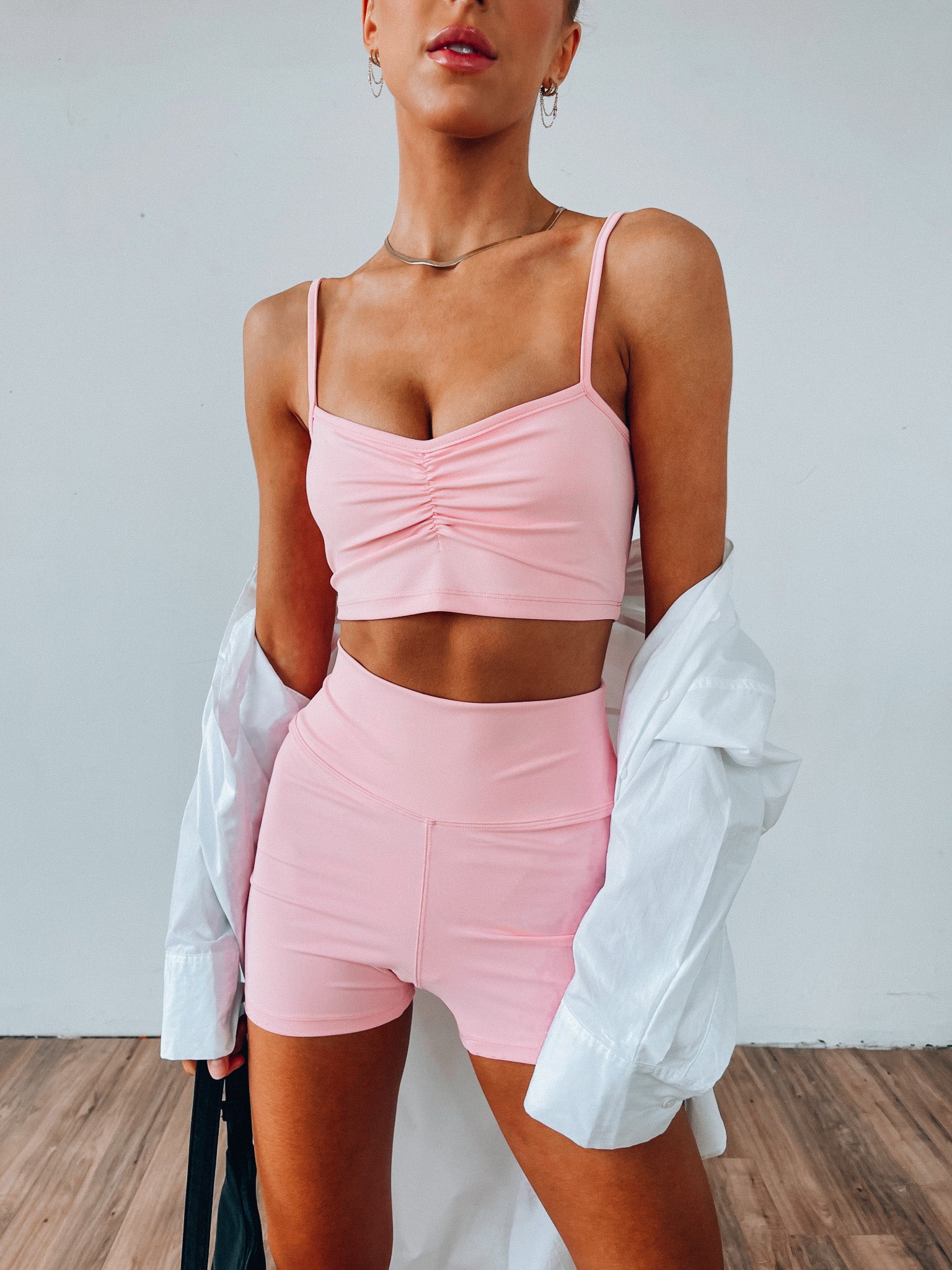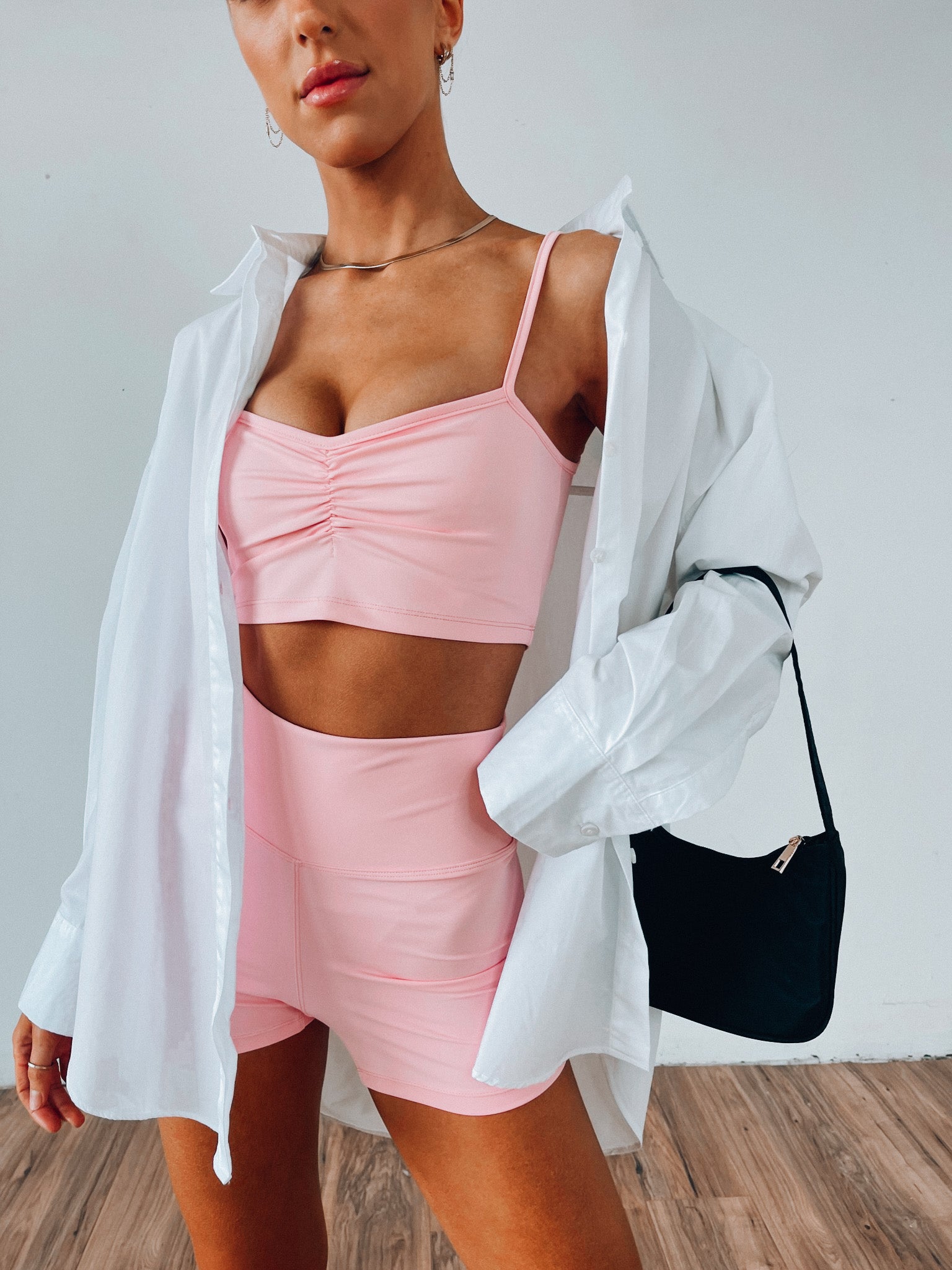 Our Ania Pink Athletic Set is a two piece set. The top has a synched detail between the bust and two thin adjustable straps. The bottoms are high waisted with a thick waist band. The back of the bottoms have a synched detail as well. This is the perfect on the go outfit for any day!