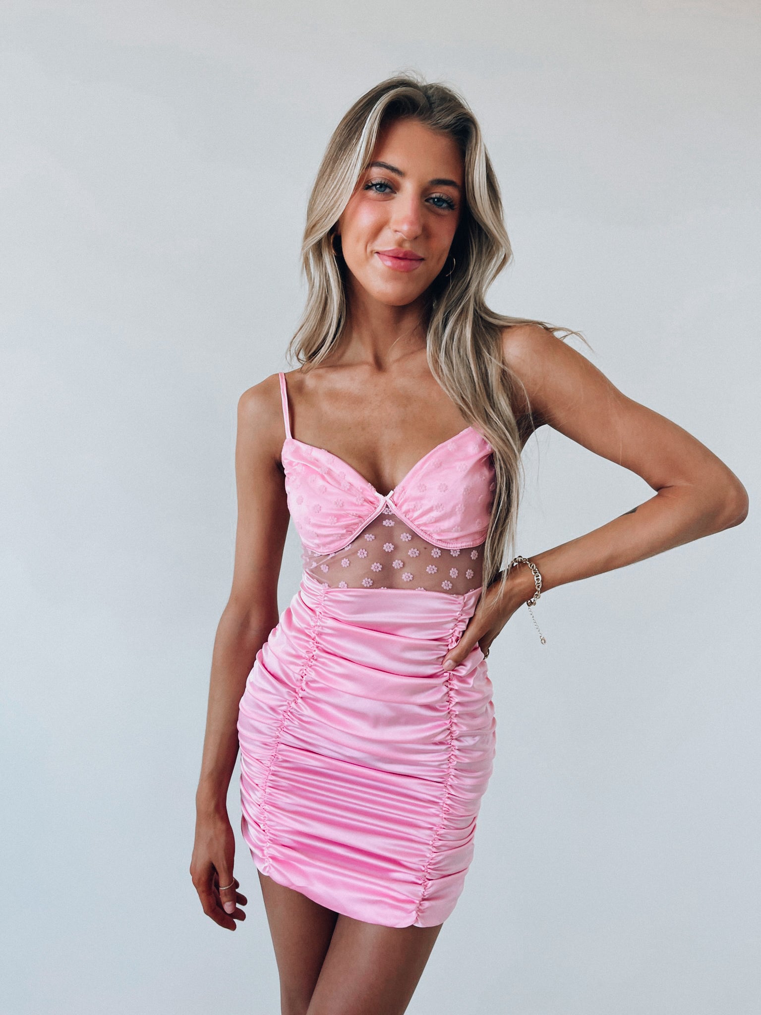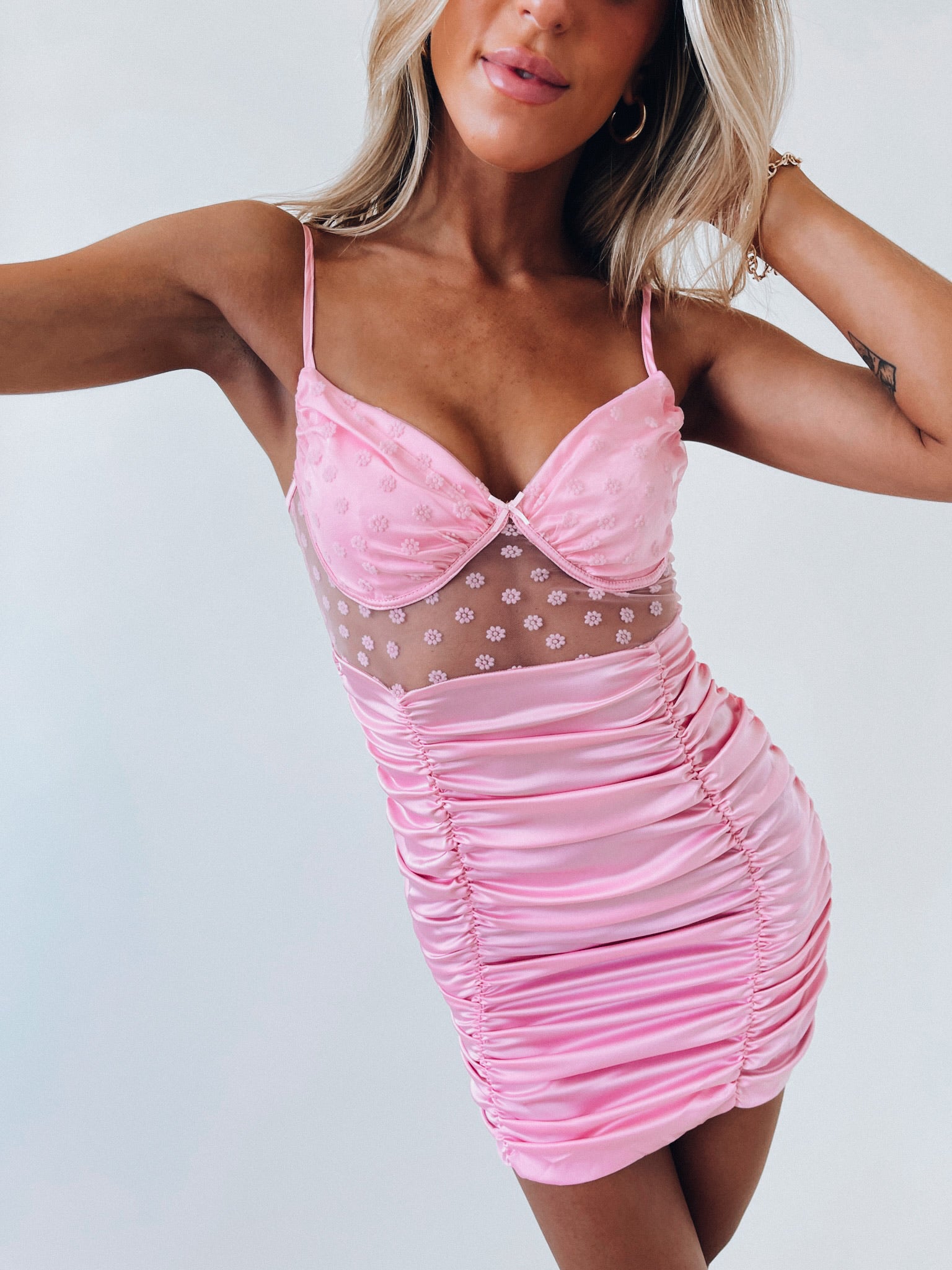 Our Blakely Bustier Dress has a lightweight, soft to the touch, silk fabric. This dress has a floral patter mesh detail over the bust and around the torso. This dress is LINED and has two thin adjustale straps. The back of this dress has a zipper closure.