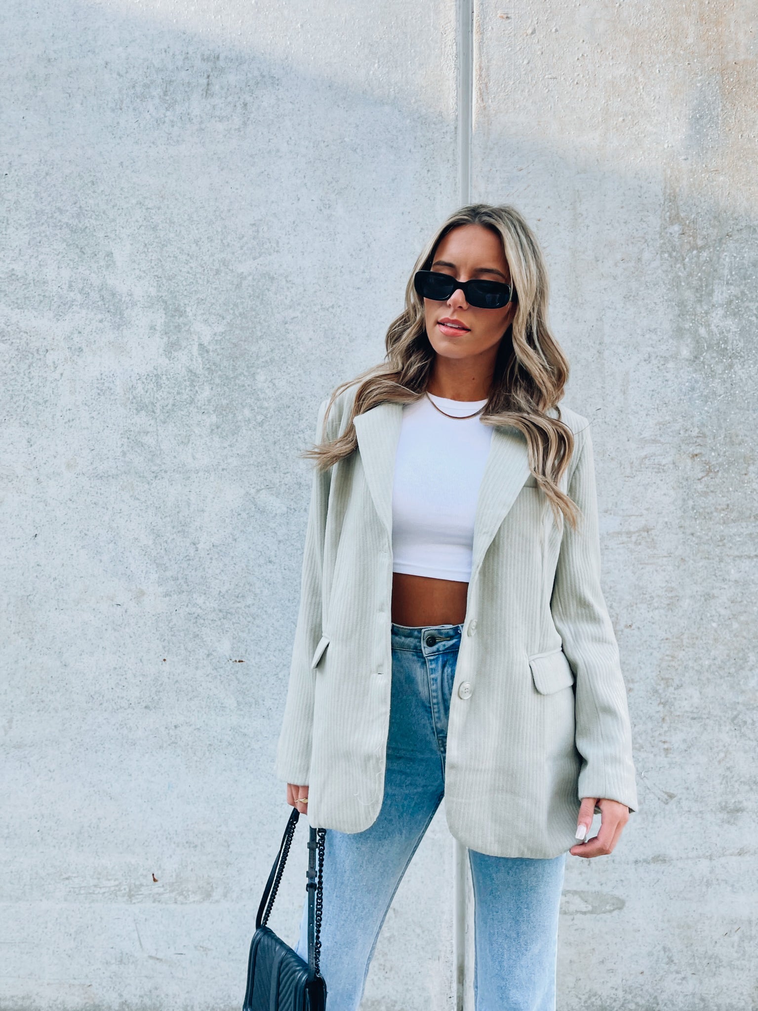 Our Parkler Wool Blend blazer is a sage full length blazer made of a thick wool blend material. This blazer features monochromatic button closure, shoulder pads, and an functional pocket details. This jacket features an oversized fit and is made of a high fashion ribbed winter weight material.