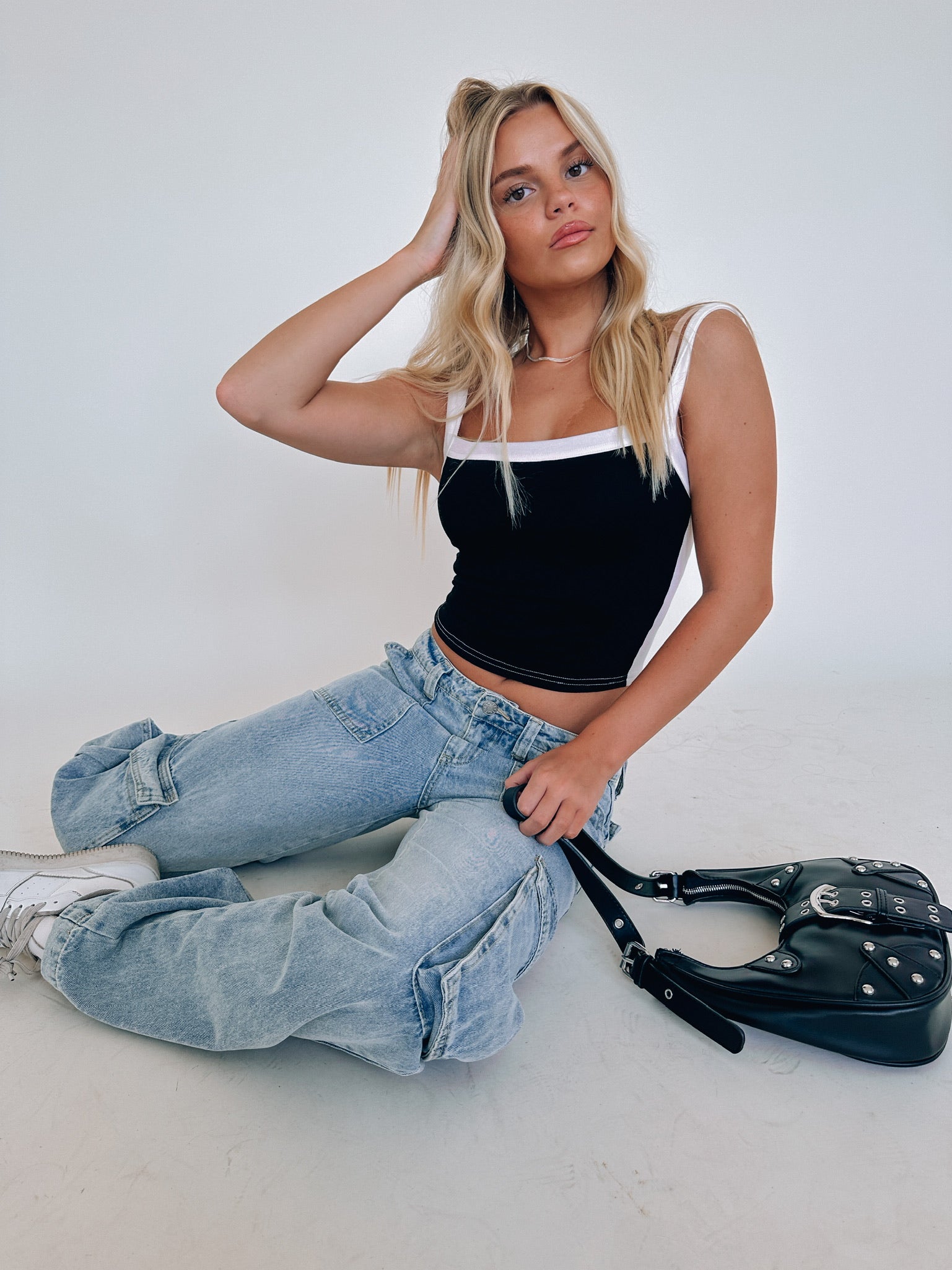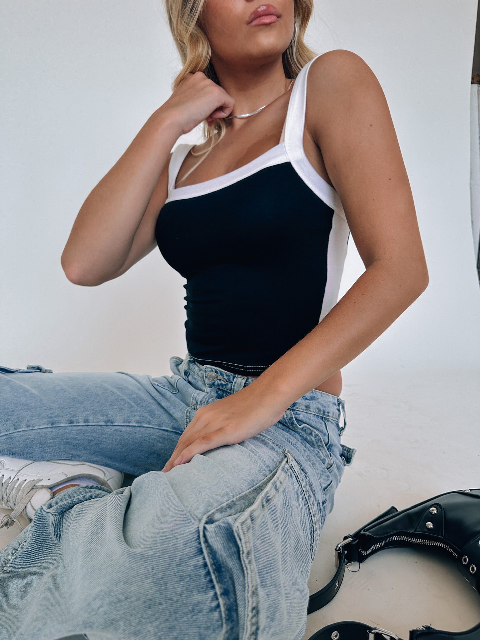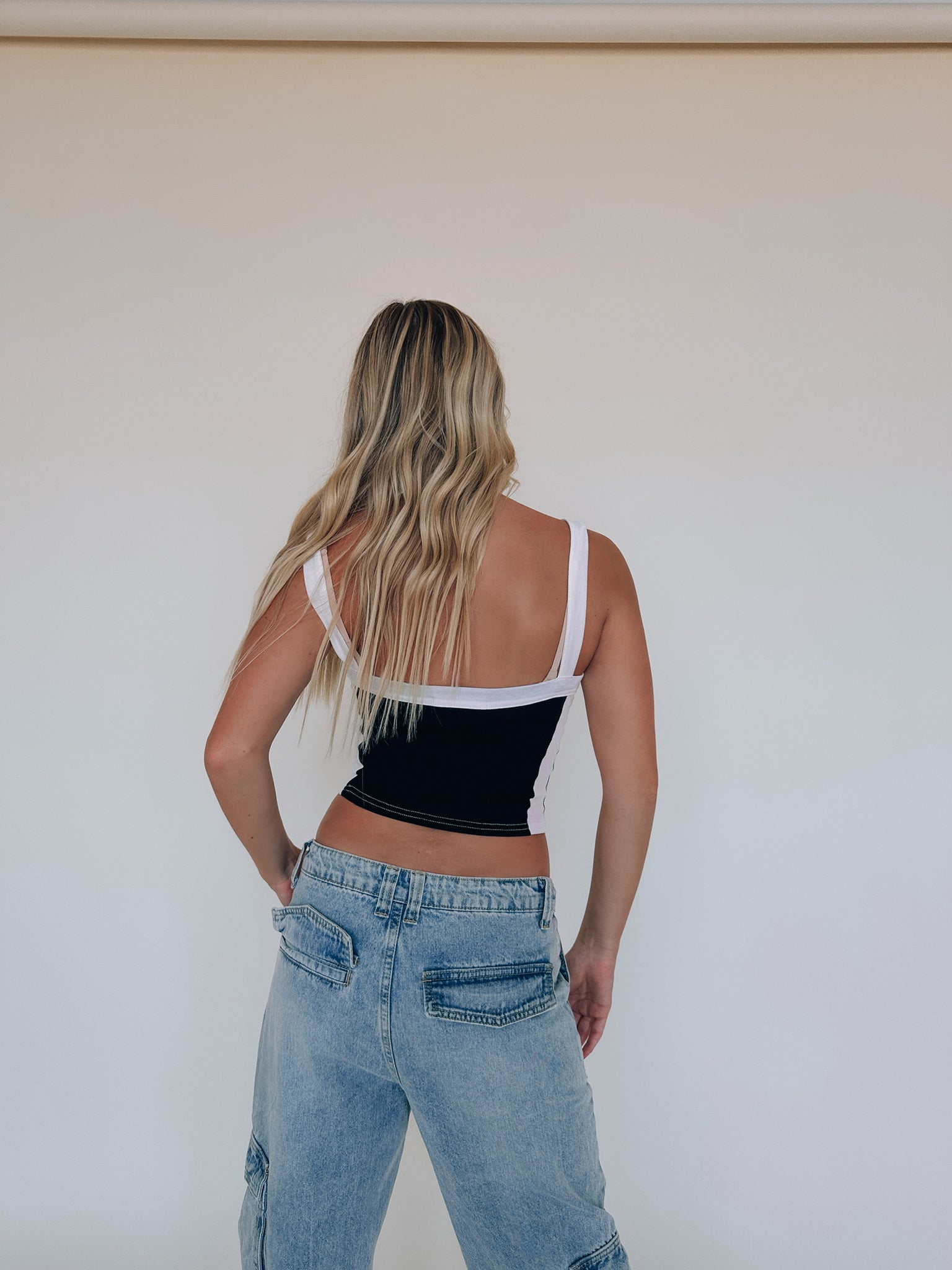 Our Reagan Contrast Tank is cropped tank with contrasting black and white colors. This tank features a square neckline, cropped fit, and contrasting white straps and the white goes along the sides and back seams, giving this tank a flattering look! This tank is made of lightweight material.