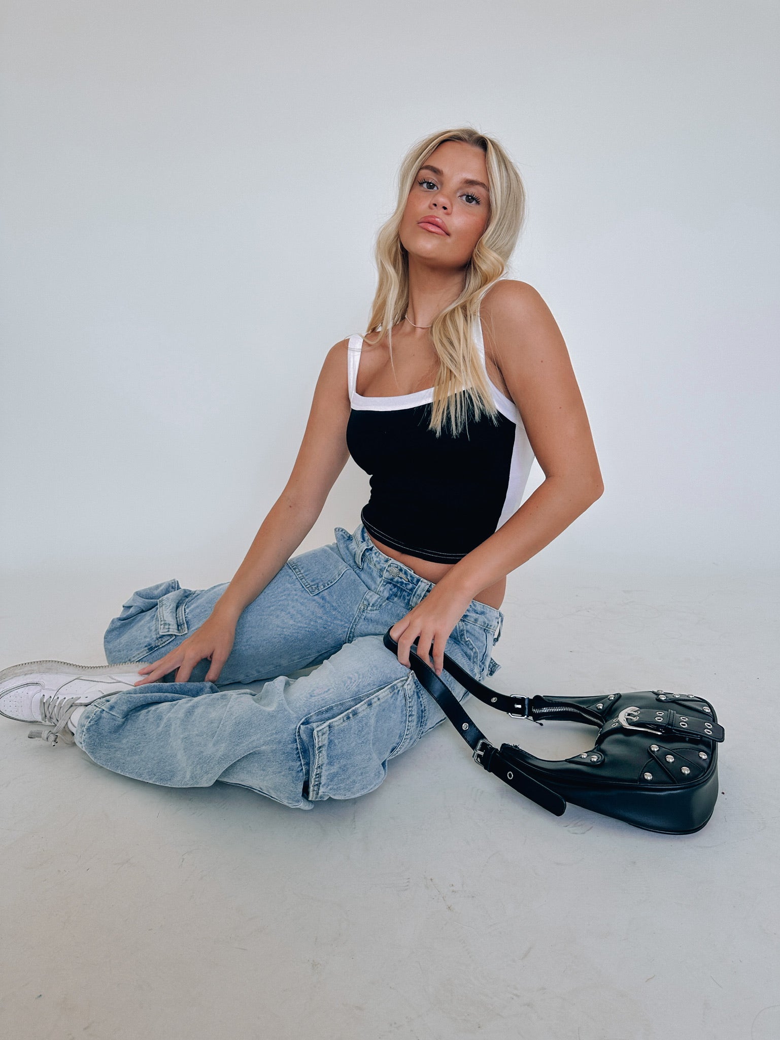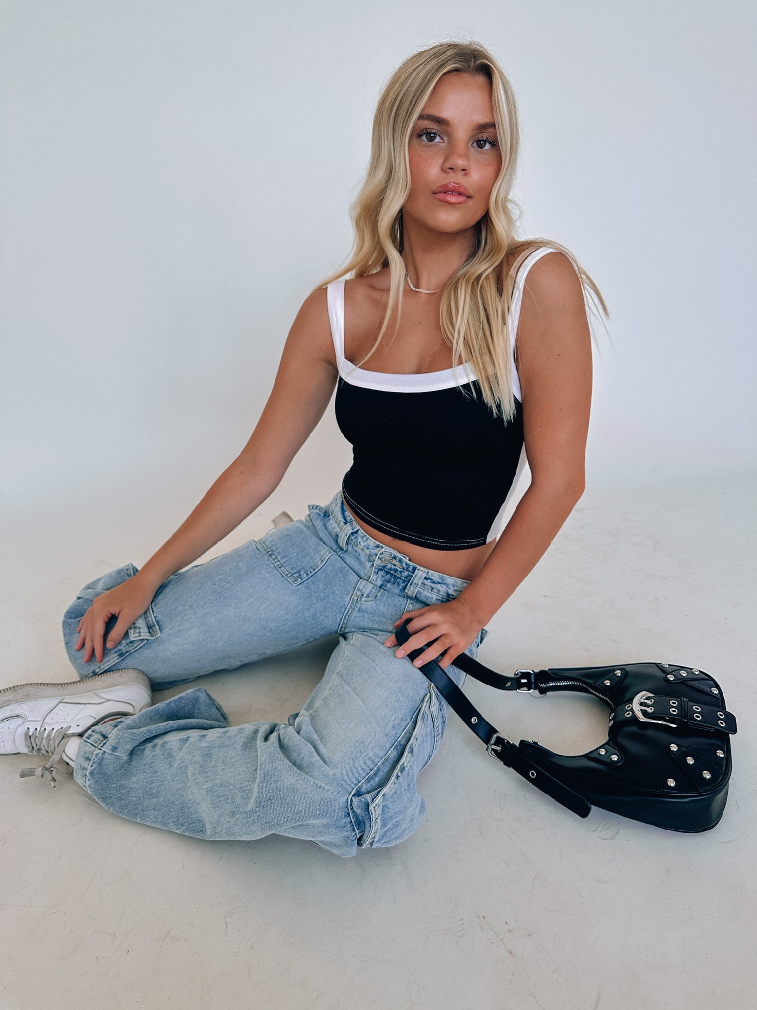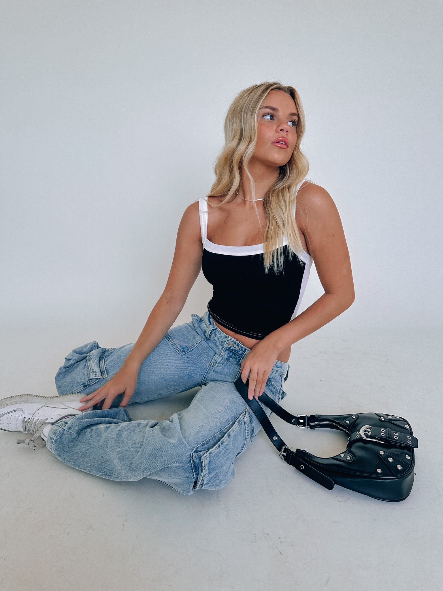 Our Reagan Contrast Tank is cropped tank with contrasting black and white colors. This tank features a square neckline, cropped fit, and contrasting white straps and the white goes along the sides and back seams, giving this tank a flattering look! This tank is made of lightweight material.