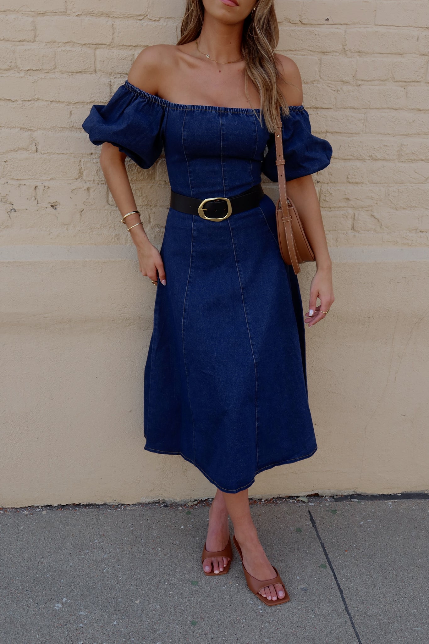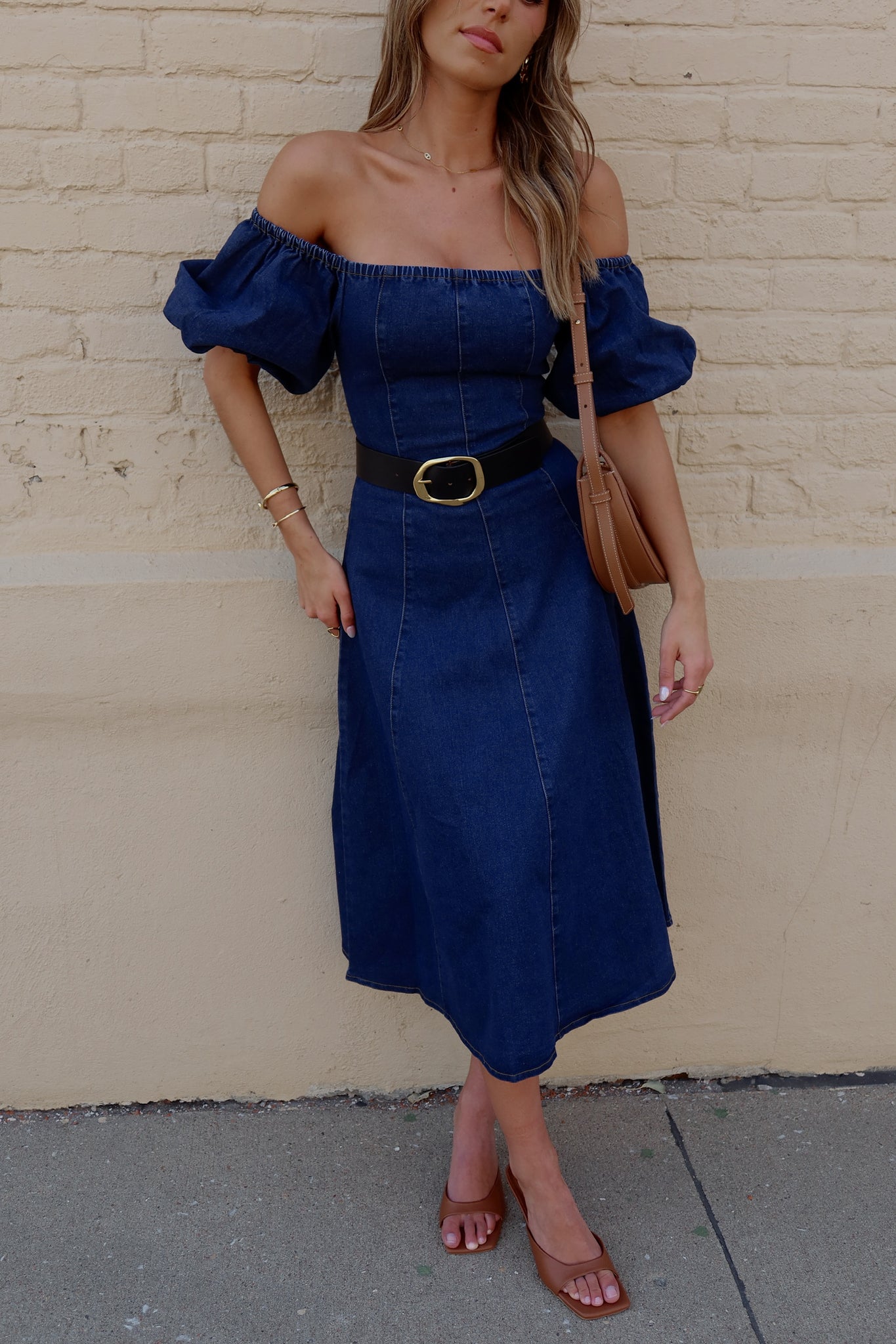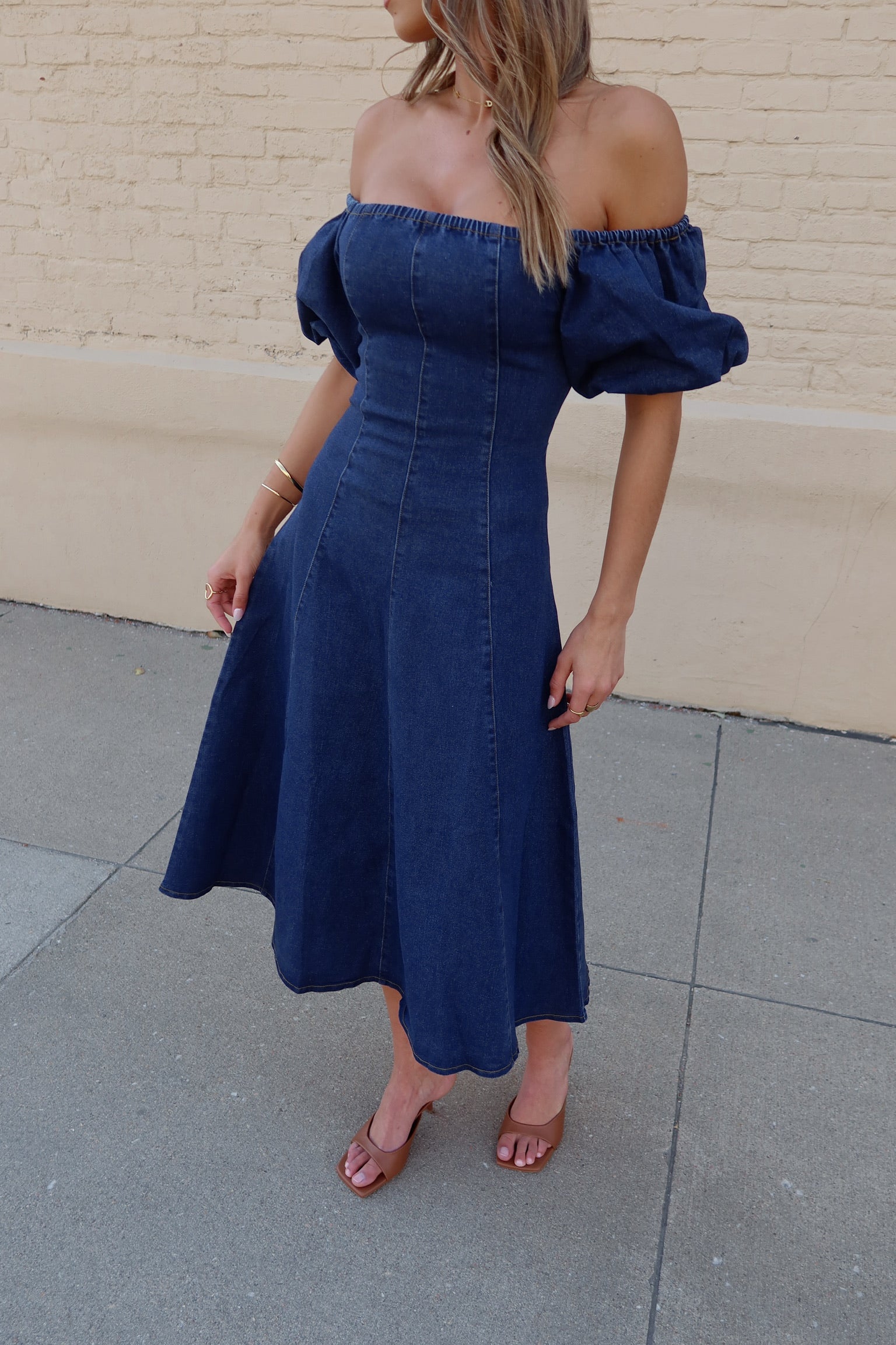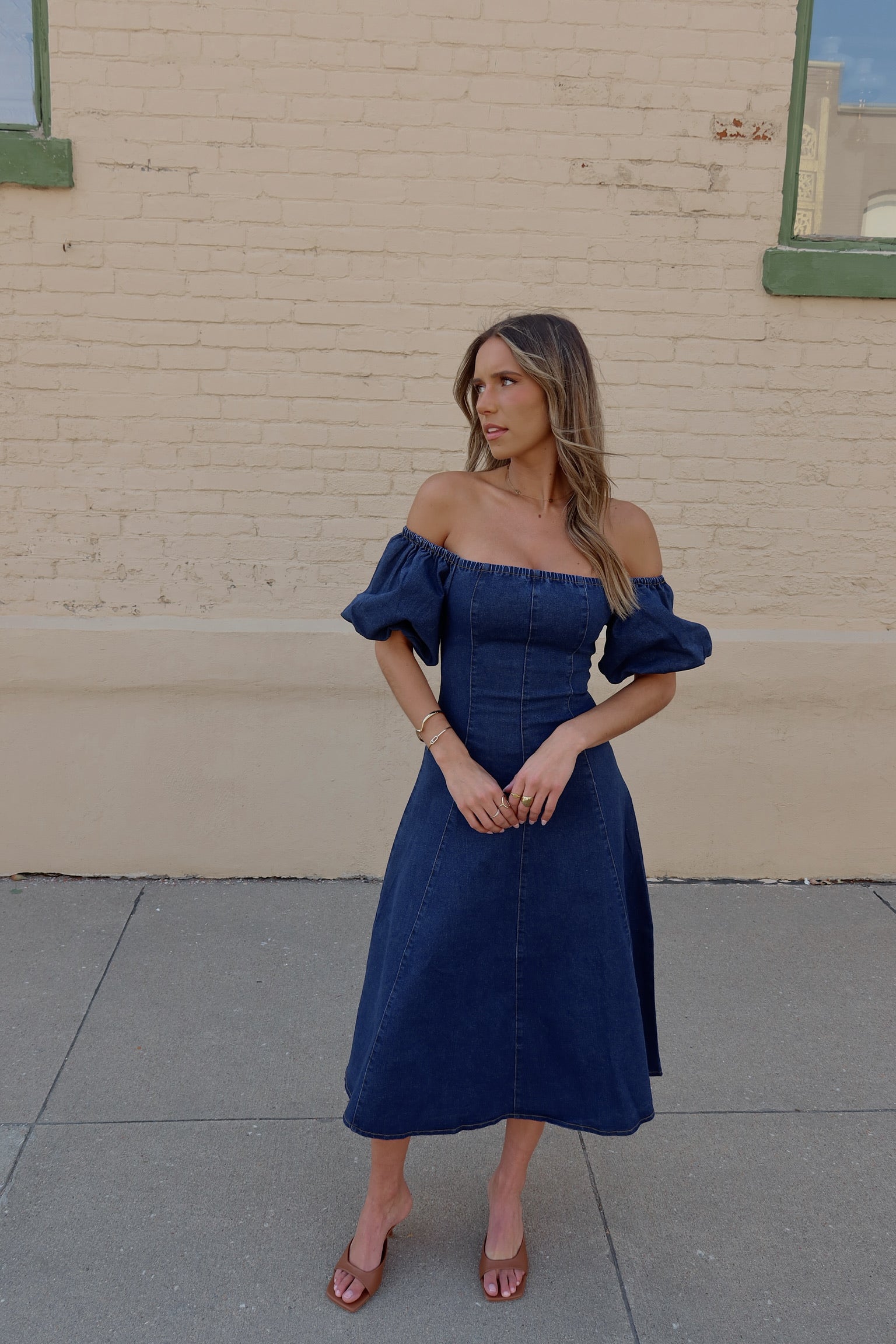 Denim Dreams Puff Sleeve A-Line Midi Dress