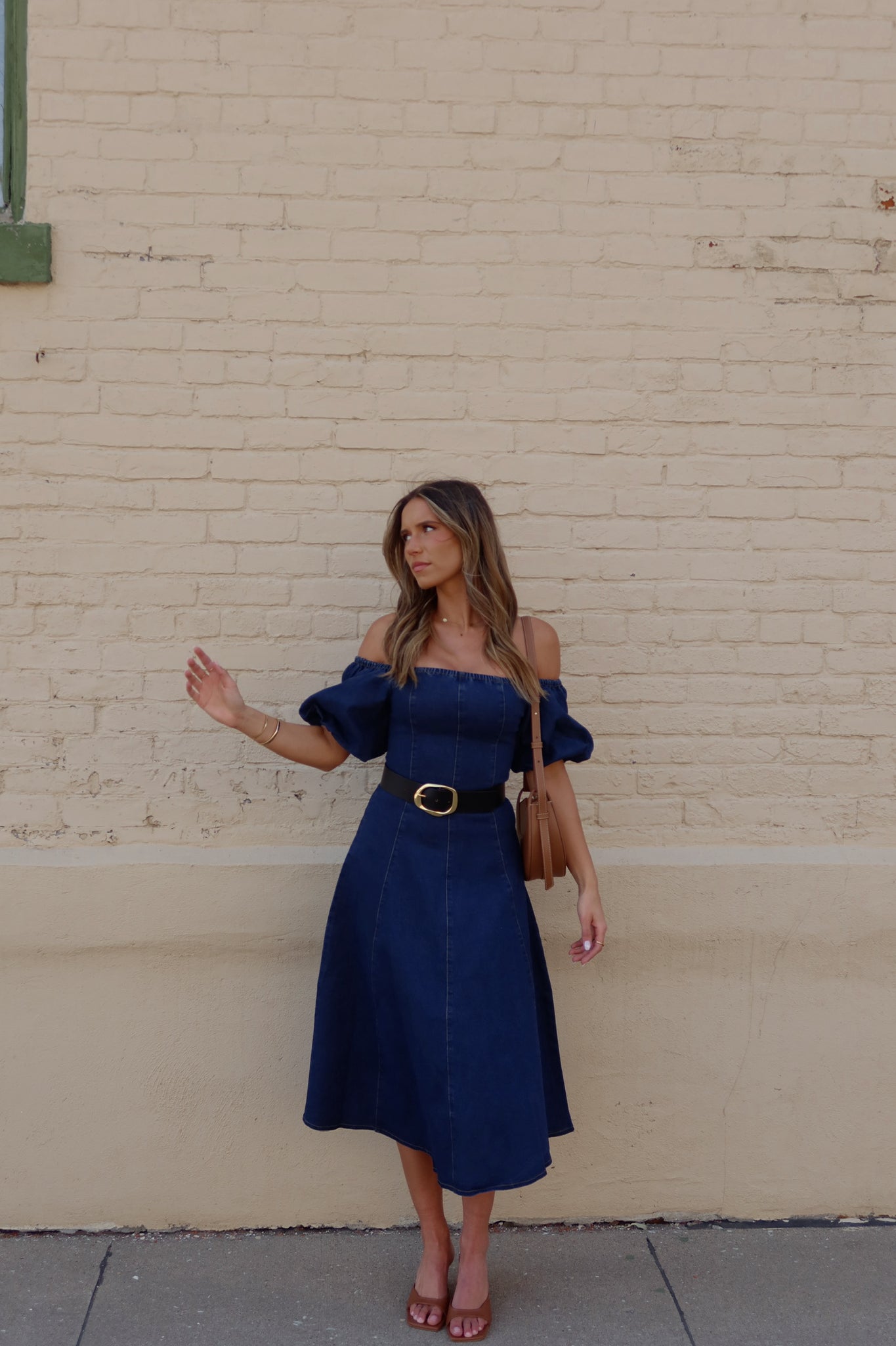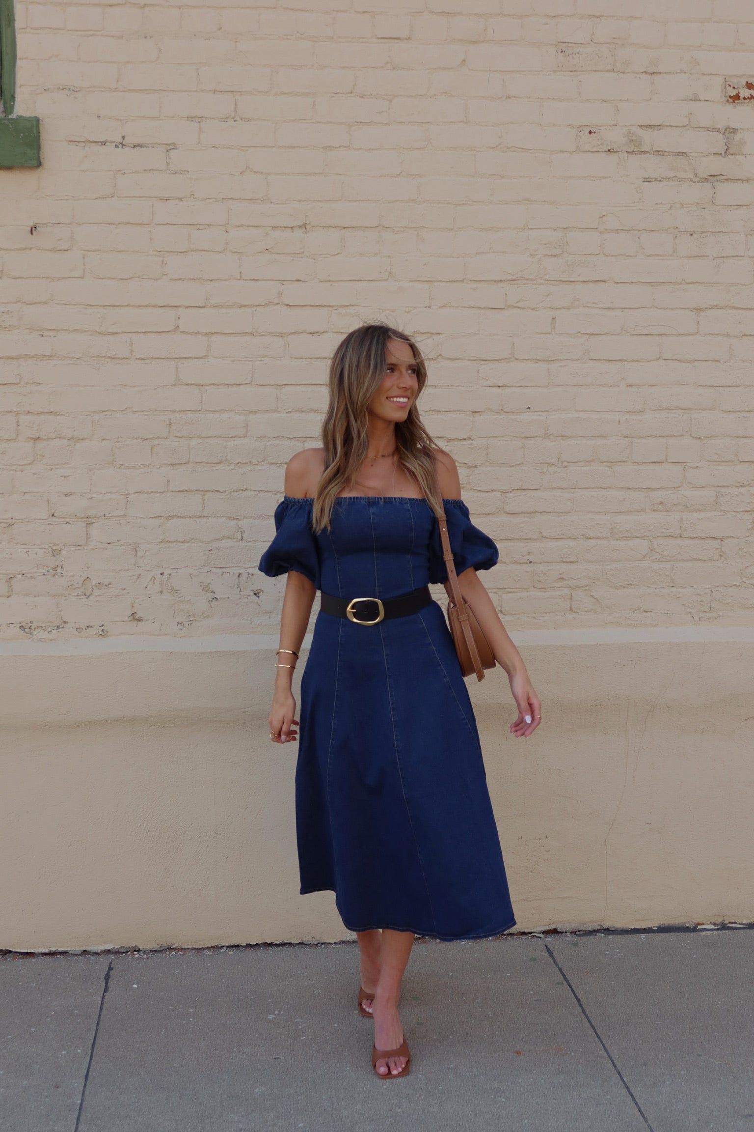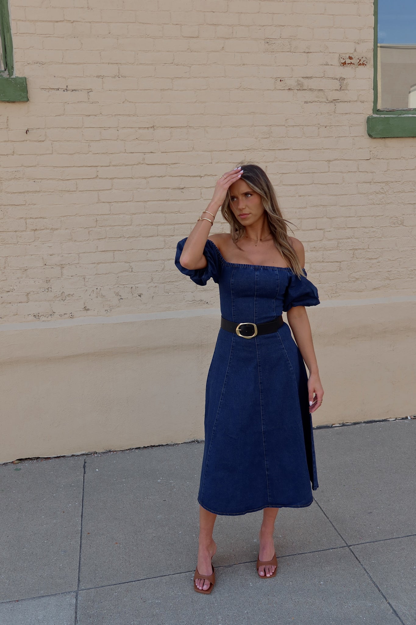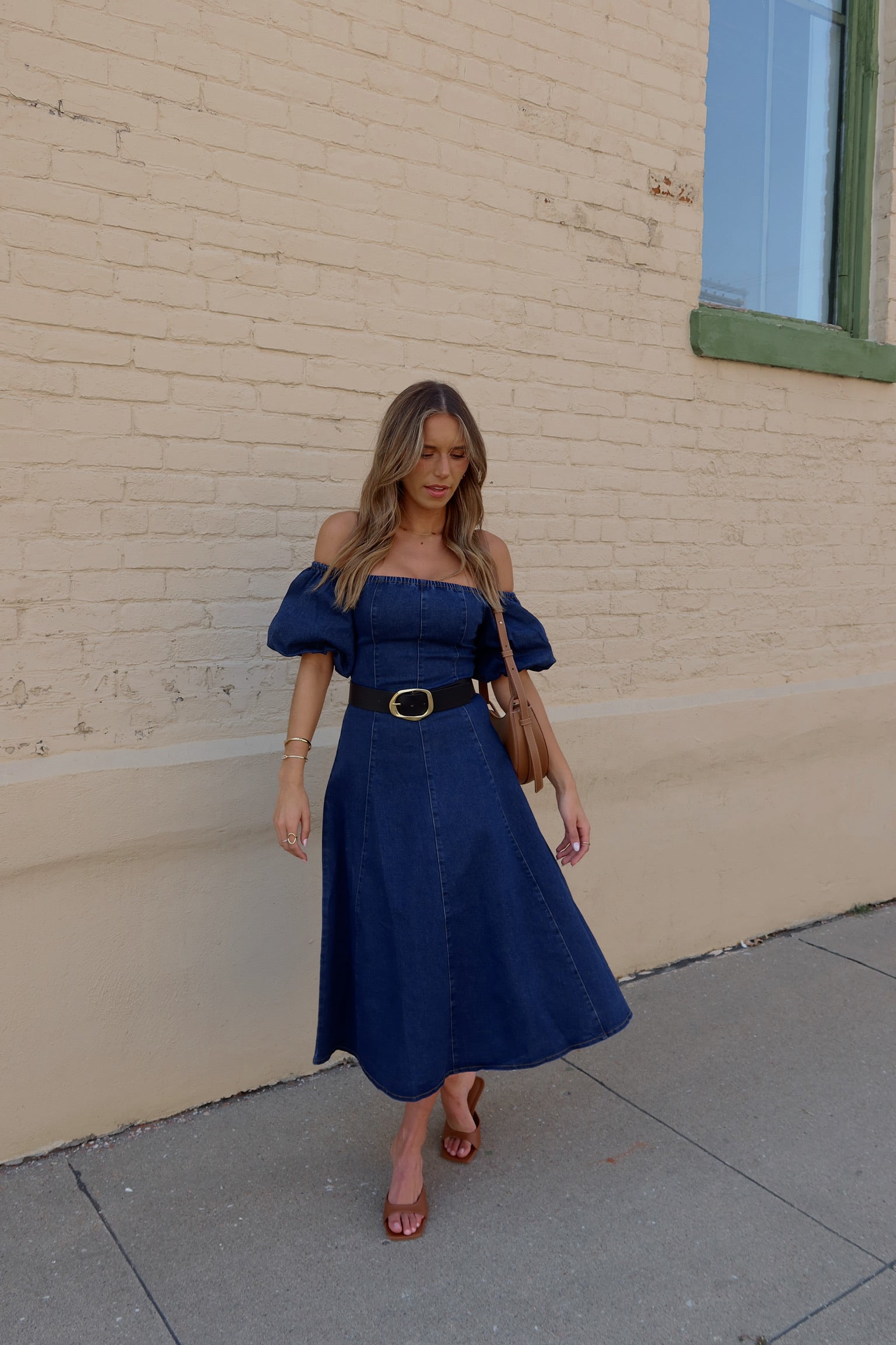 Denim Dreams Puff Sleeve A-Line Midi Dress
