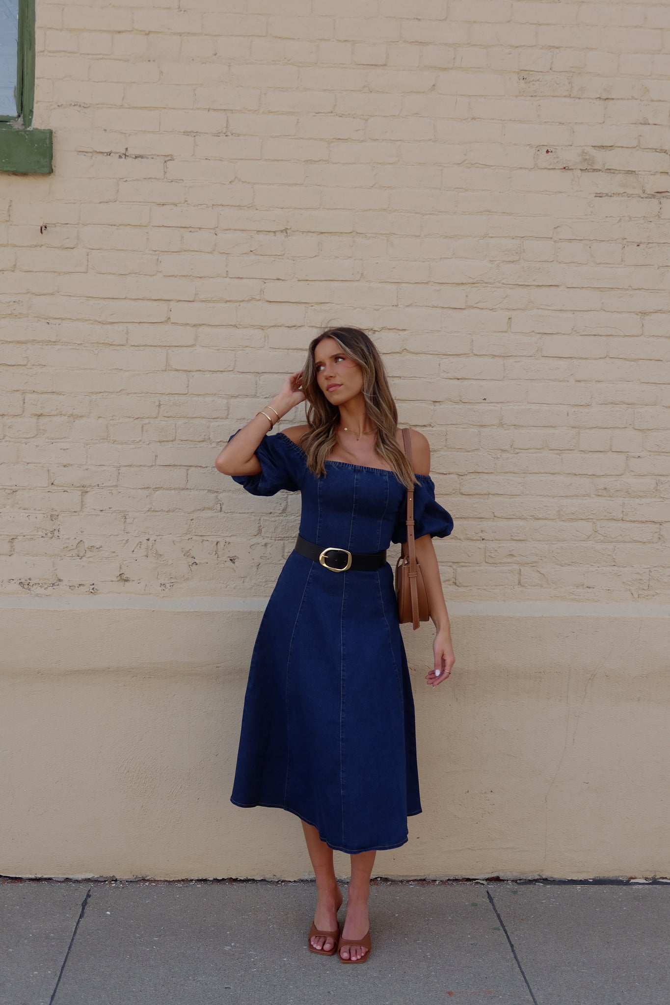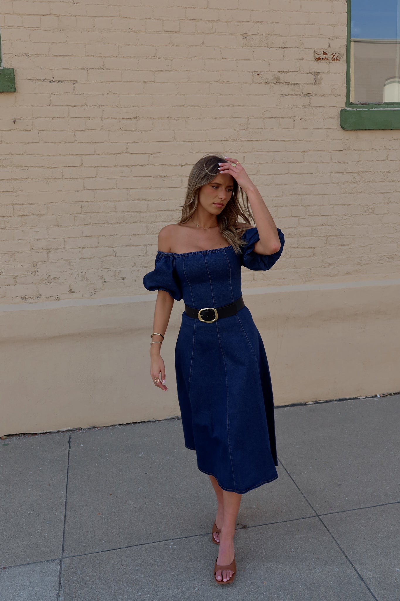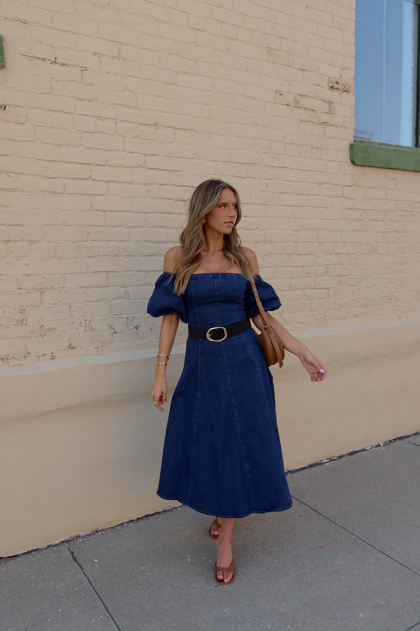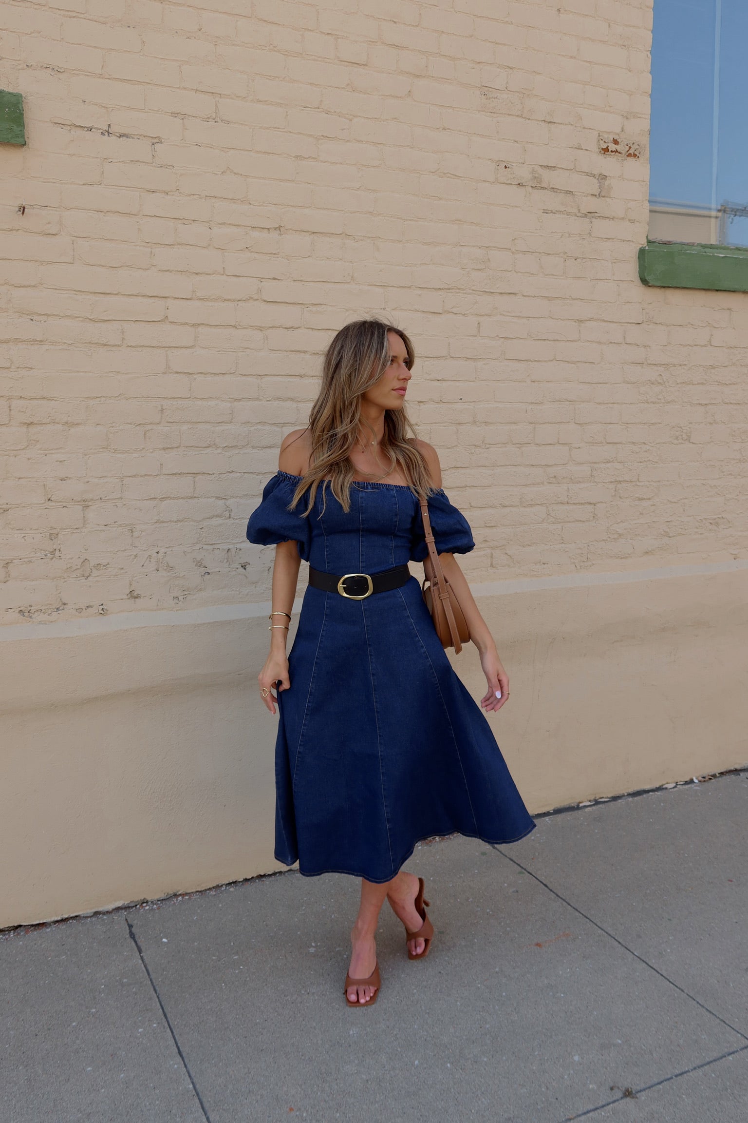 Denim Dreams Puff Sleeve A-Line Midi Dress