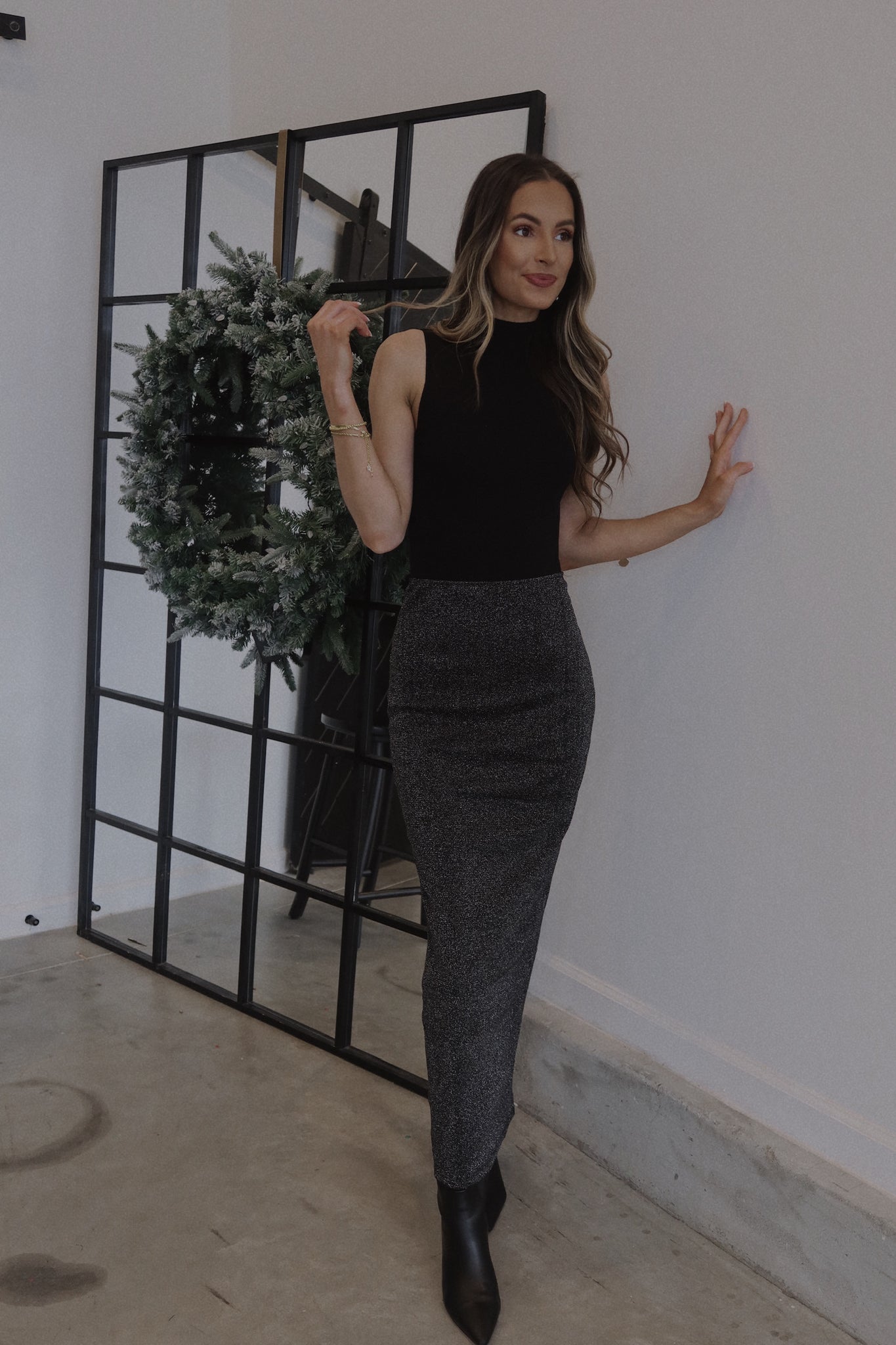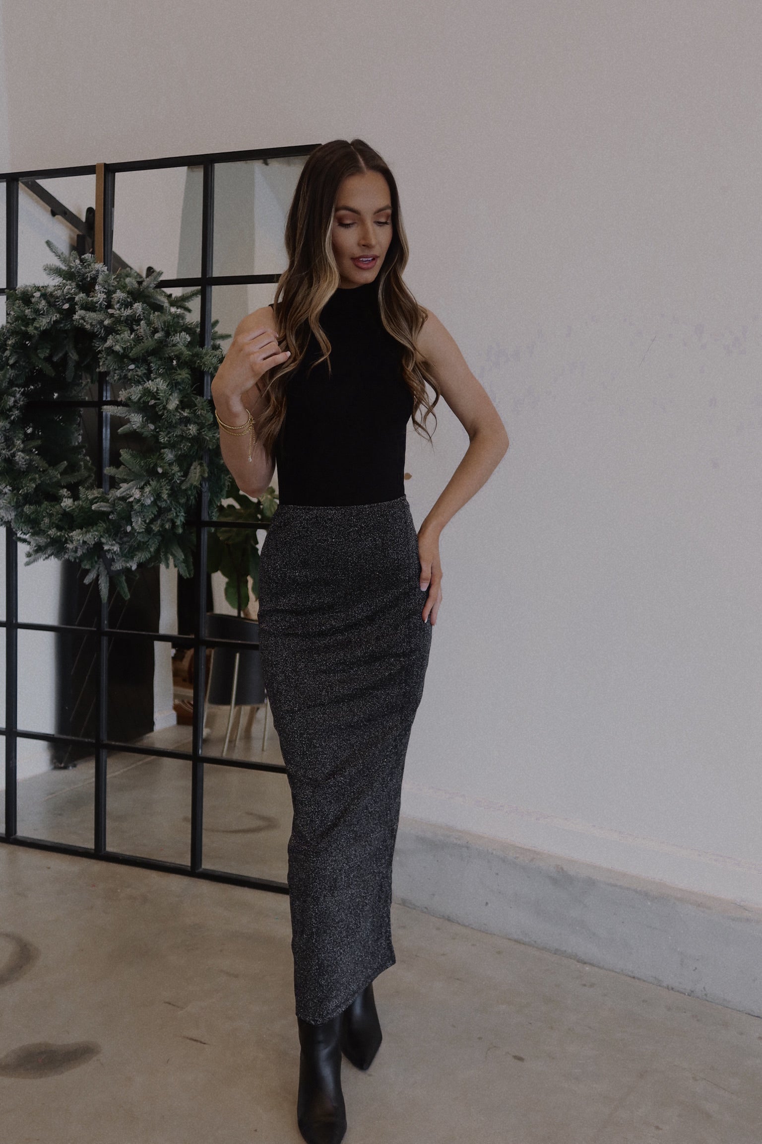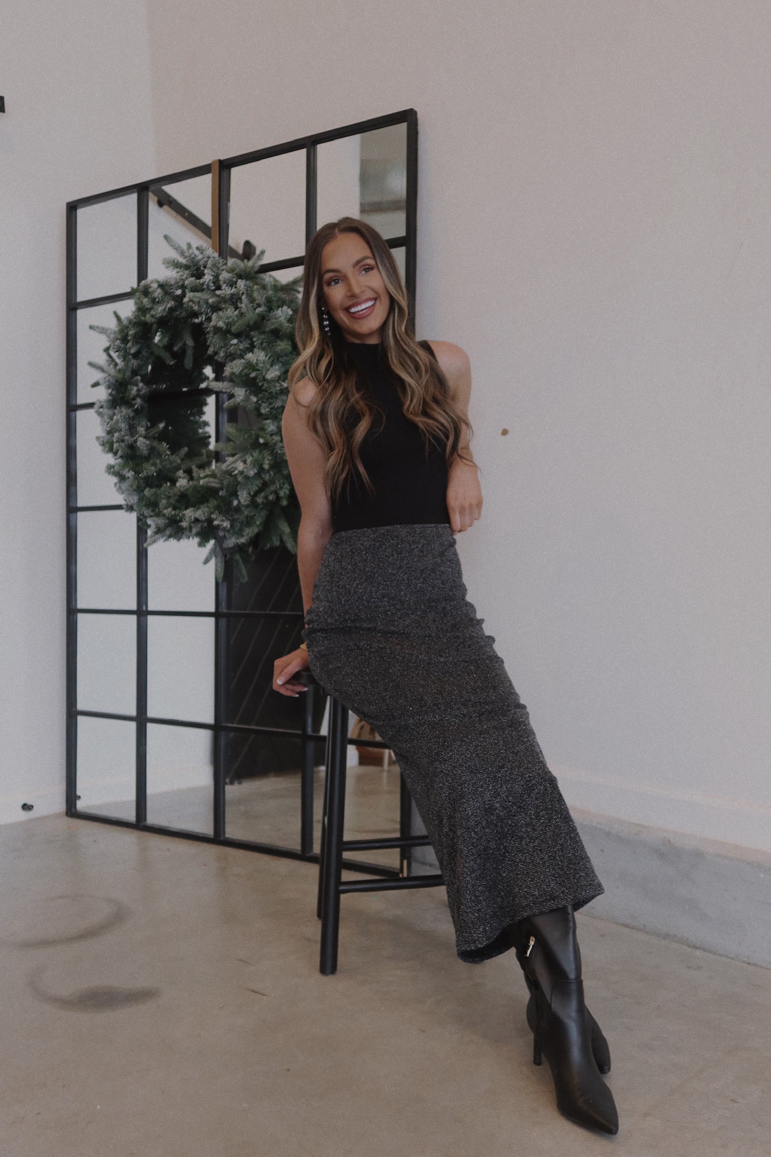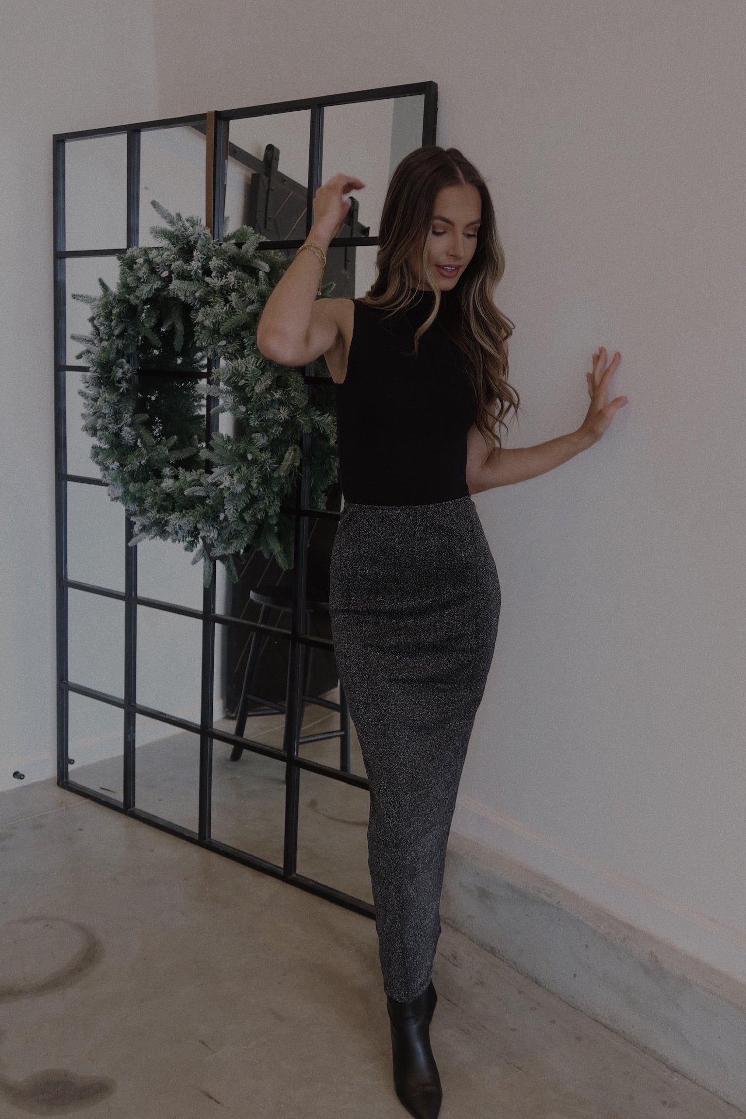 Our Elena Shimmering Midi Skirt is the perfect holiday skirt! This skirt features a fitted pencil style, with a silver shimmering sparkle all throughout. This skirt is completed with a hidden side zipper with a hook and eye closure. This skirt is fully lined and has stretch. This skirt has a matching top; the Elena Shimmering Crop Top.