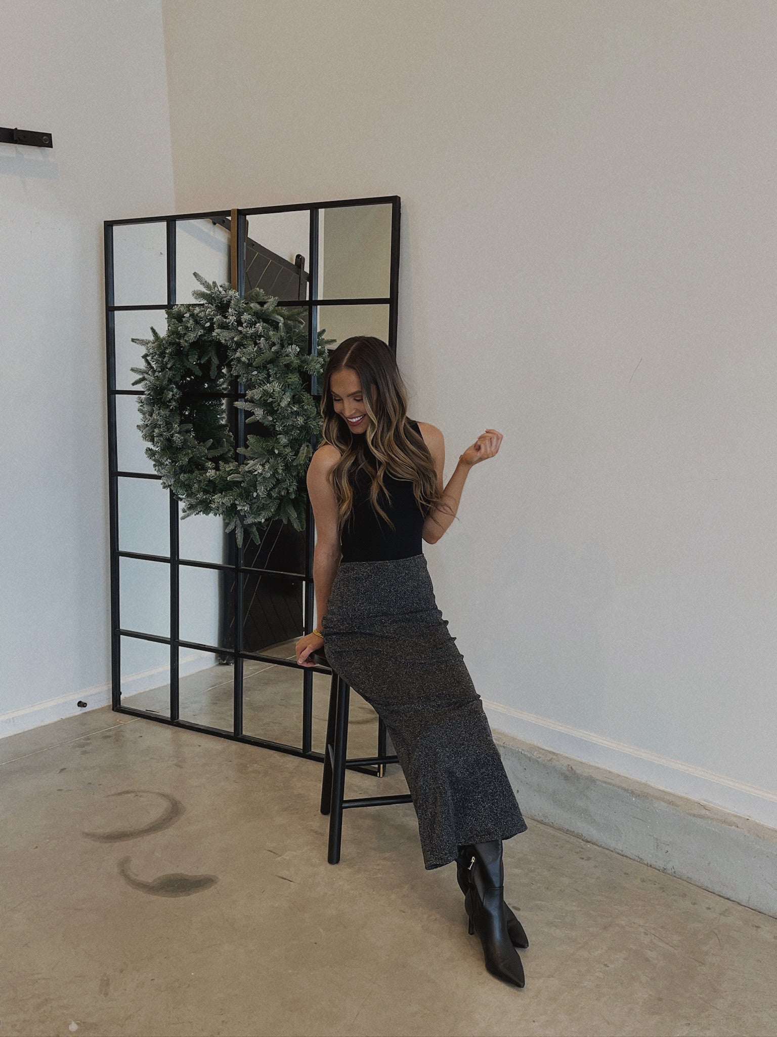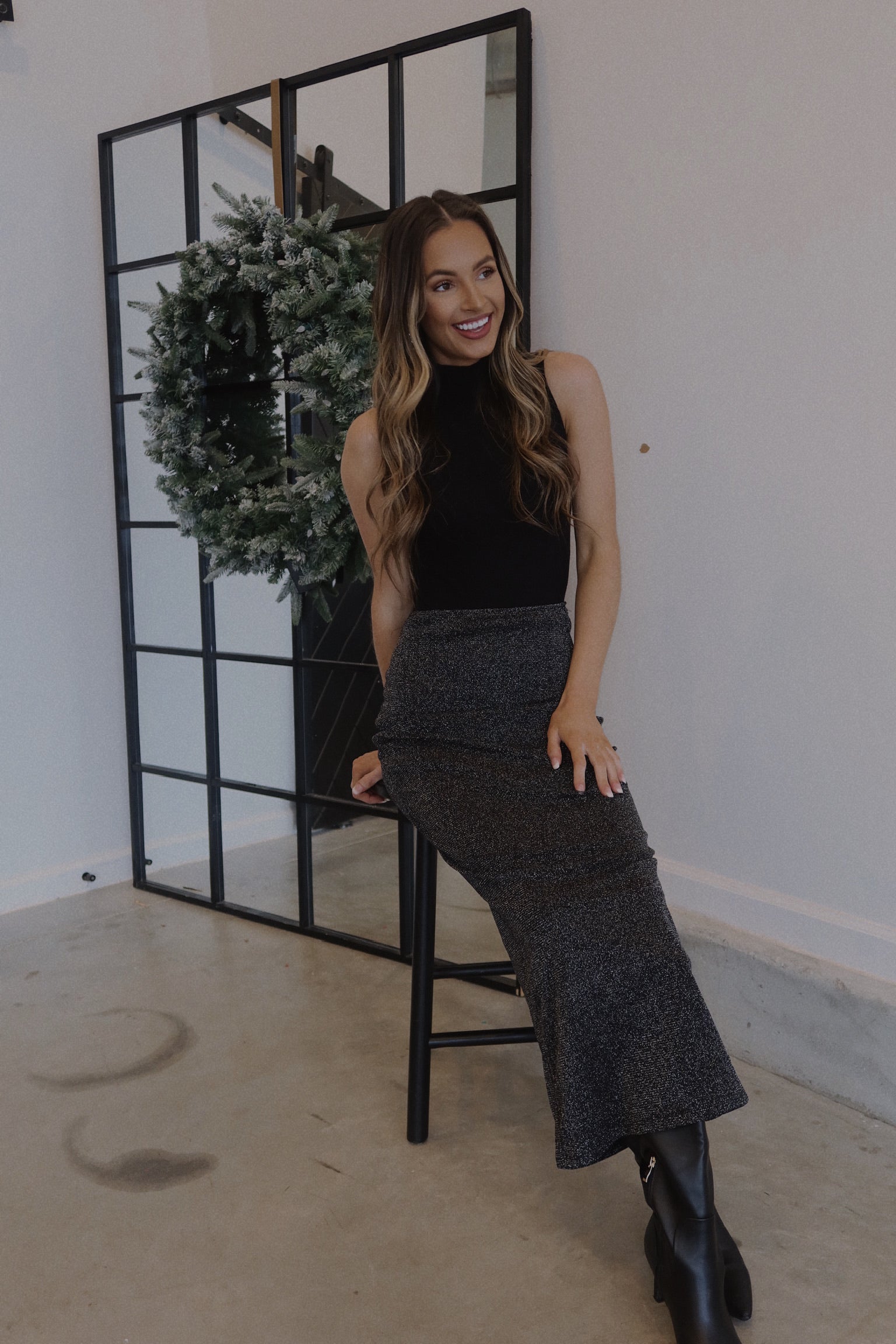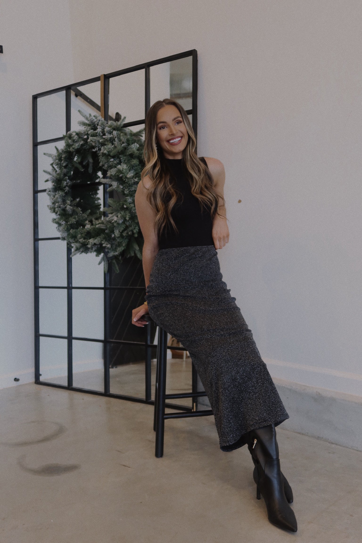 Our Elena Shimmering Midi Skirt is the perfect holiday skirt! This skirt features a fitted pencil style, with a silver shimmering sparkle all throughout. This skirt is completed with a hidden side zipper with a hook and eye closure. This skirt is fully lined and has stretch. This skirt has a matching top; the Elena Shimmering Crop Top.