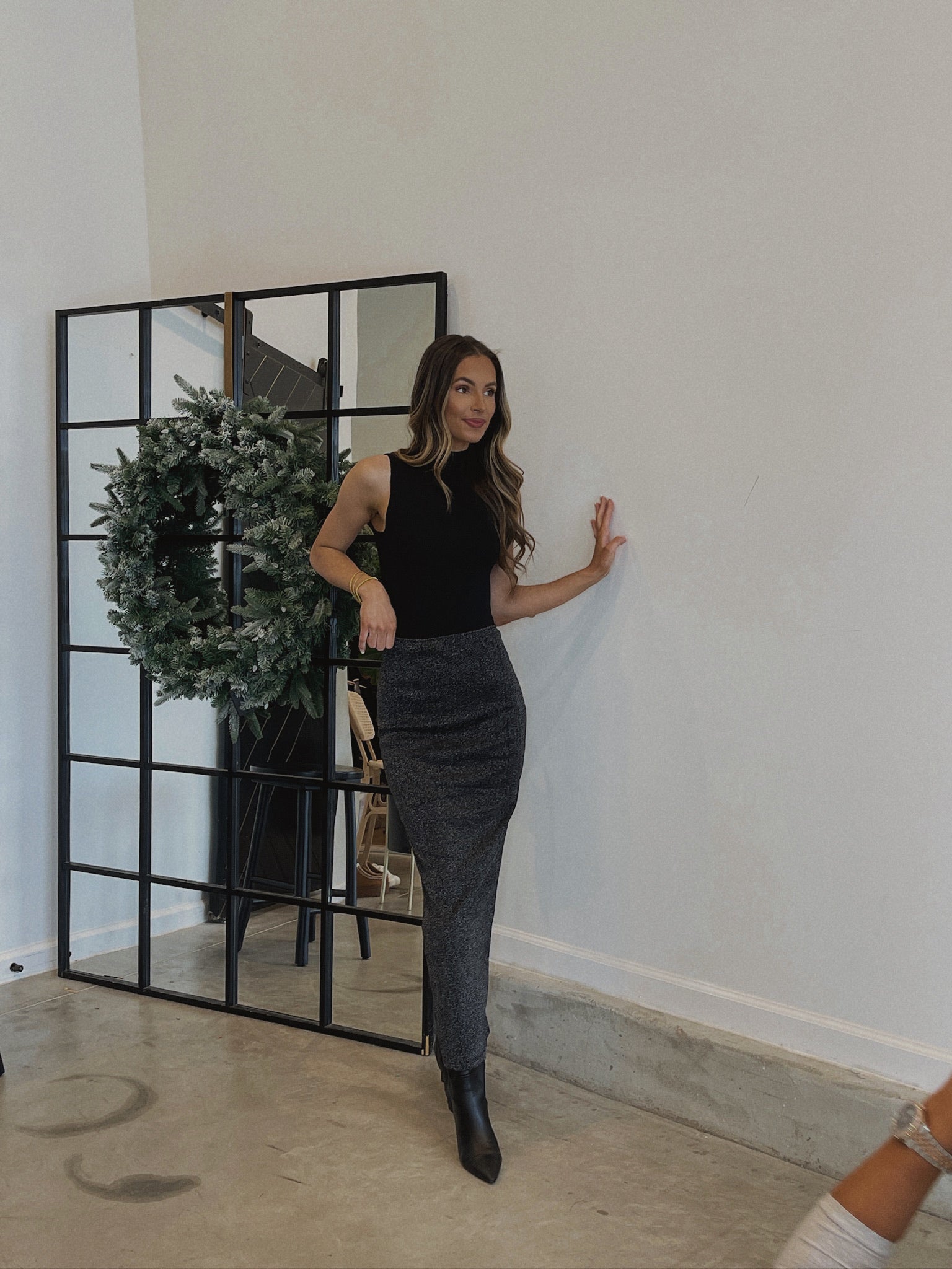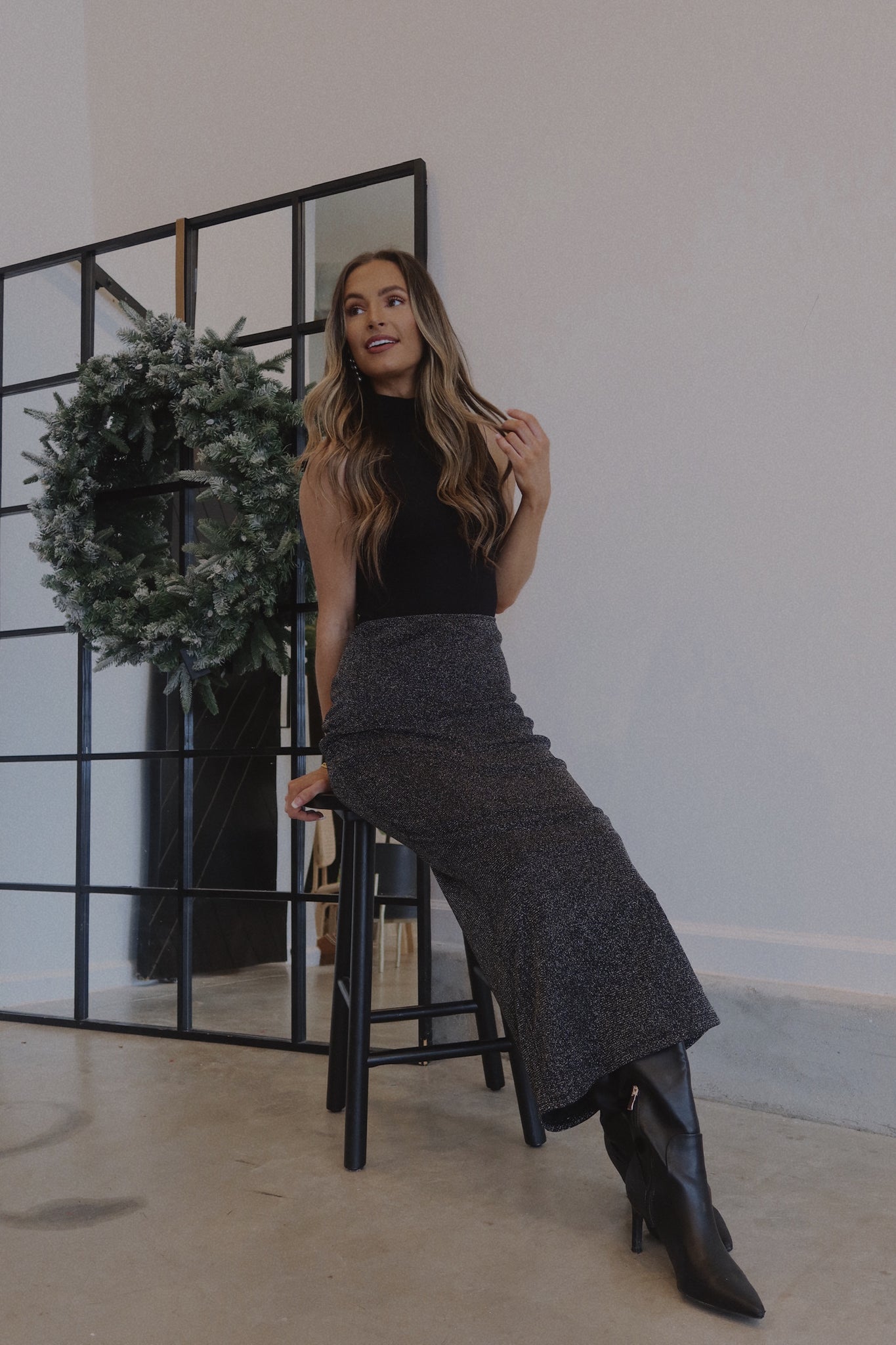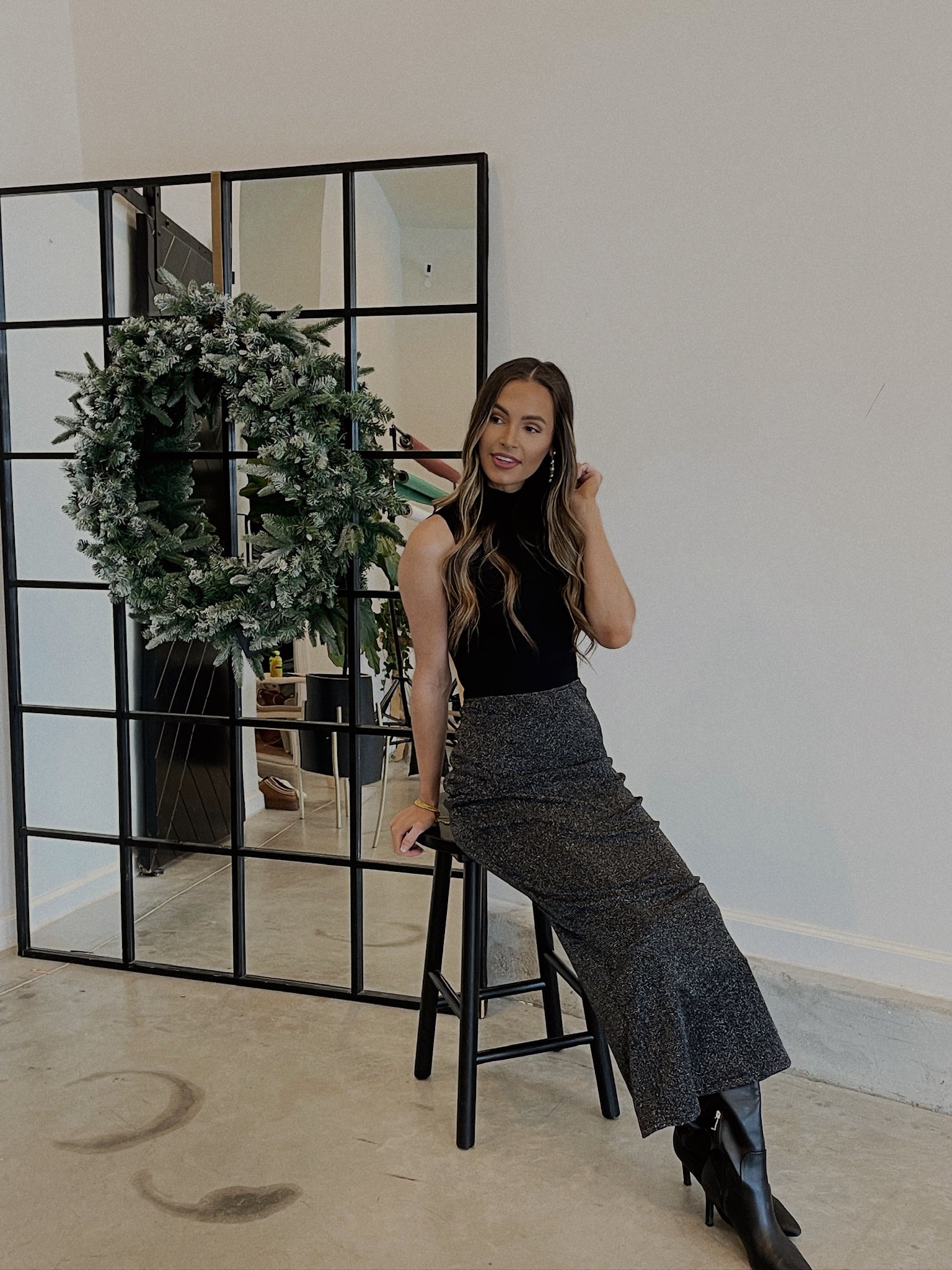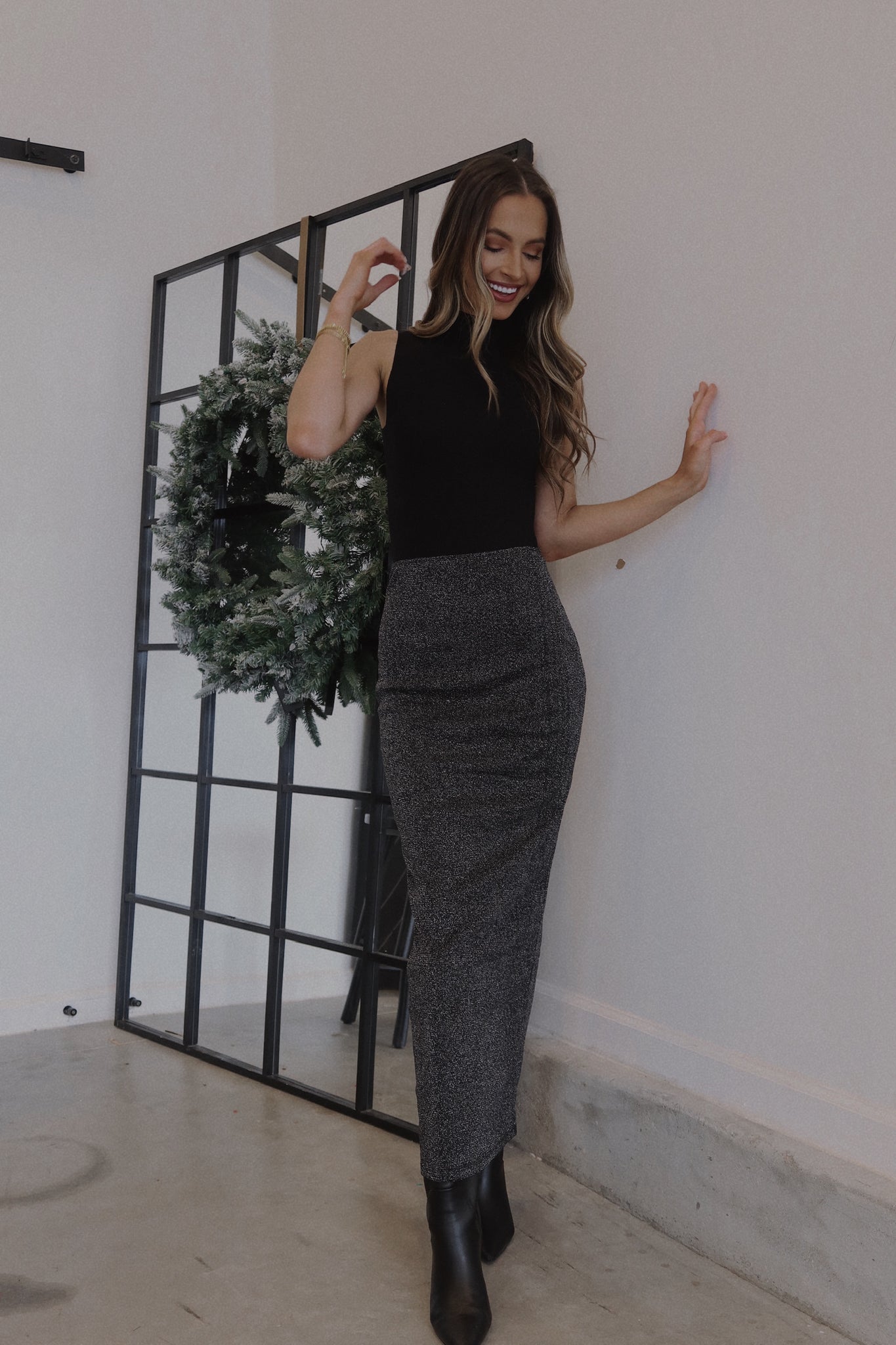Our Elena Shimmering Midi Skirt is the perfect holiday skirt! This skirt features a fitted pencil style, with a silver shimmering sparkle all throughout. This skirt is completed with a hidden side zipper with a hook and eye closure. This skirt is fully lined and has stretch. This skirt has a matching top; the Elena Shimmering Crop Top.